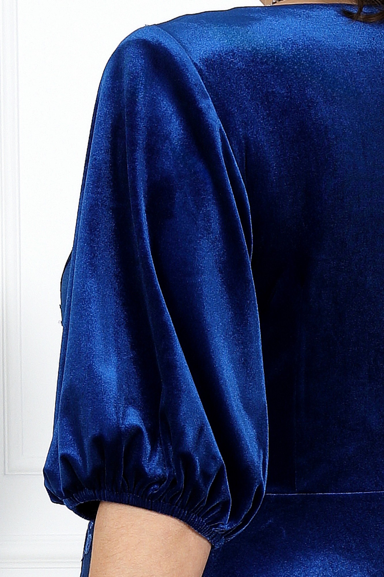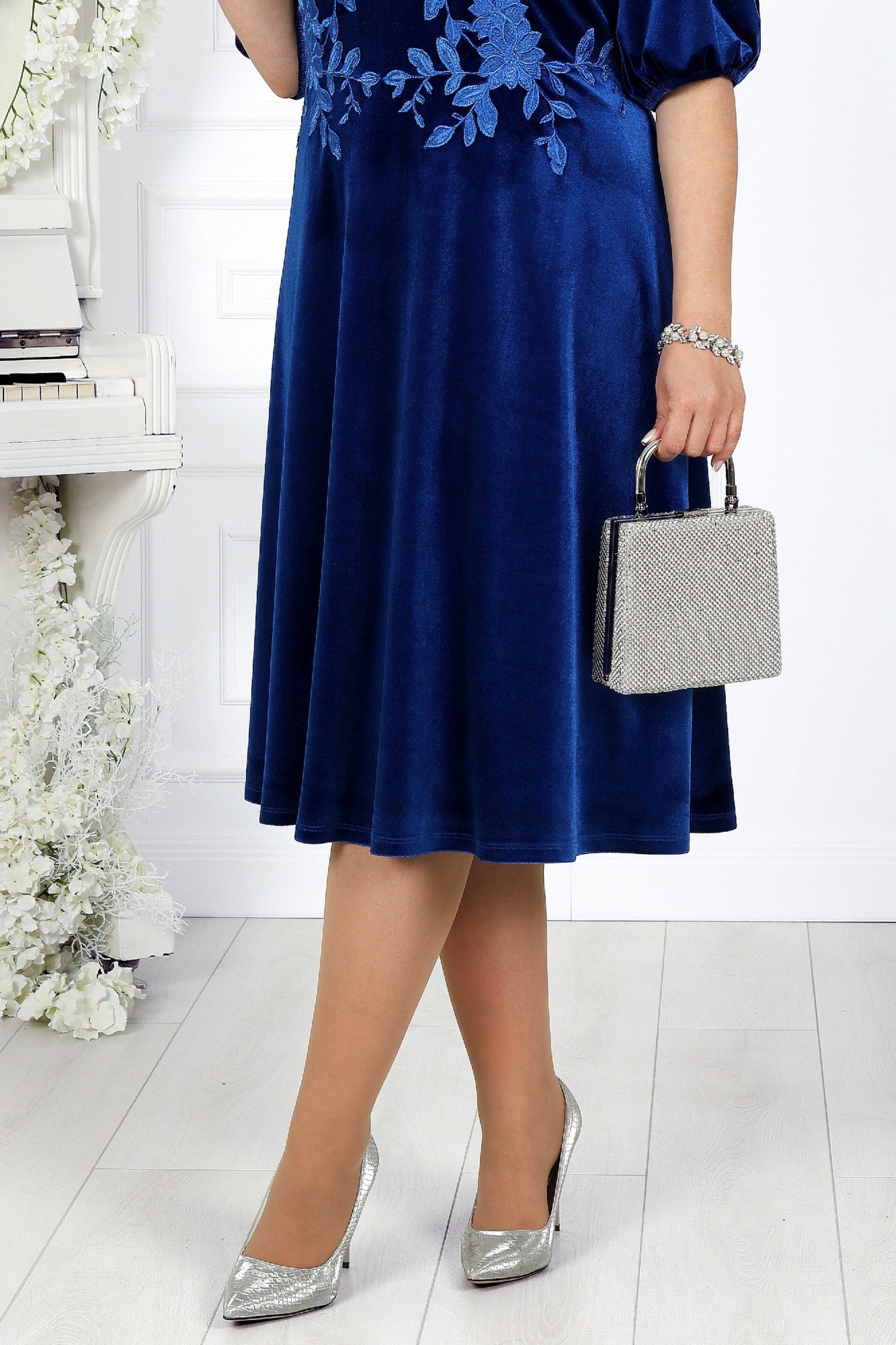 Бархатное платье с изысканными цветочными аппликациями по переду — это воплощение элегантности и женственности. Созданное из бархата, оно не только выглядит роскошно, но и обеспечивает комфорт на протяжении всего торжественного мероприятия. Платье отличается удобным лекалом, которое идеально садится на фигуру, формируя правильный силуэт у женщин больших размеров. Это идеальный выбор для тех, кто ценит классику белорусского трикотажа и стремится выглядеть стильно и уверенно. Платье женское, полуприлегающего силуэта, расширенное к низу, выполнено из велюра, на трикотажной подкладке, отрезное по линии талии. Длина платья по среднему шву спинки 105 см. Верхняя часть переда с нагрудными вытачками, идущими от пройм. От горловины вниз, через центр груди, настрочены симметричные аппликации, которые спускаются вниз на юбку. Спинка со средним швом, от горловины до низа юбки, в котором обработана потайная застёжка на тесьму - "молнию", от горловины вниз. Верхняя часть спинки с талиевыми вытачками. Вырез горловины спинки и переда круглый. Рукава втачные, одношовные, длиной 39 см, собранные по низу на резинку. Платье с плечевыми накладками.