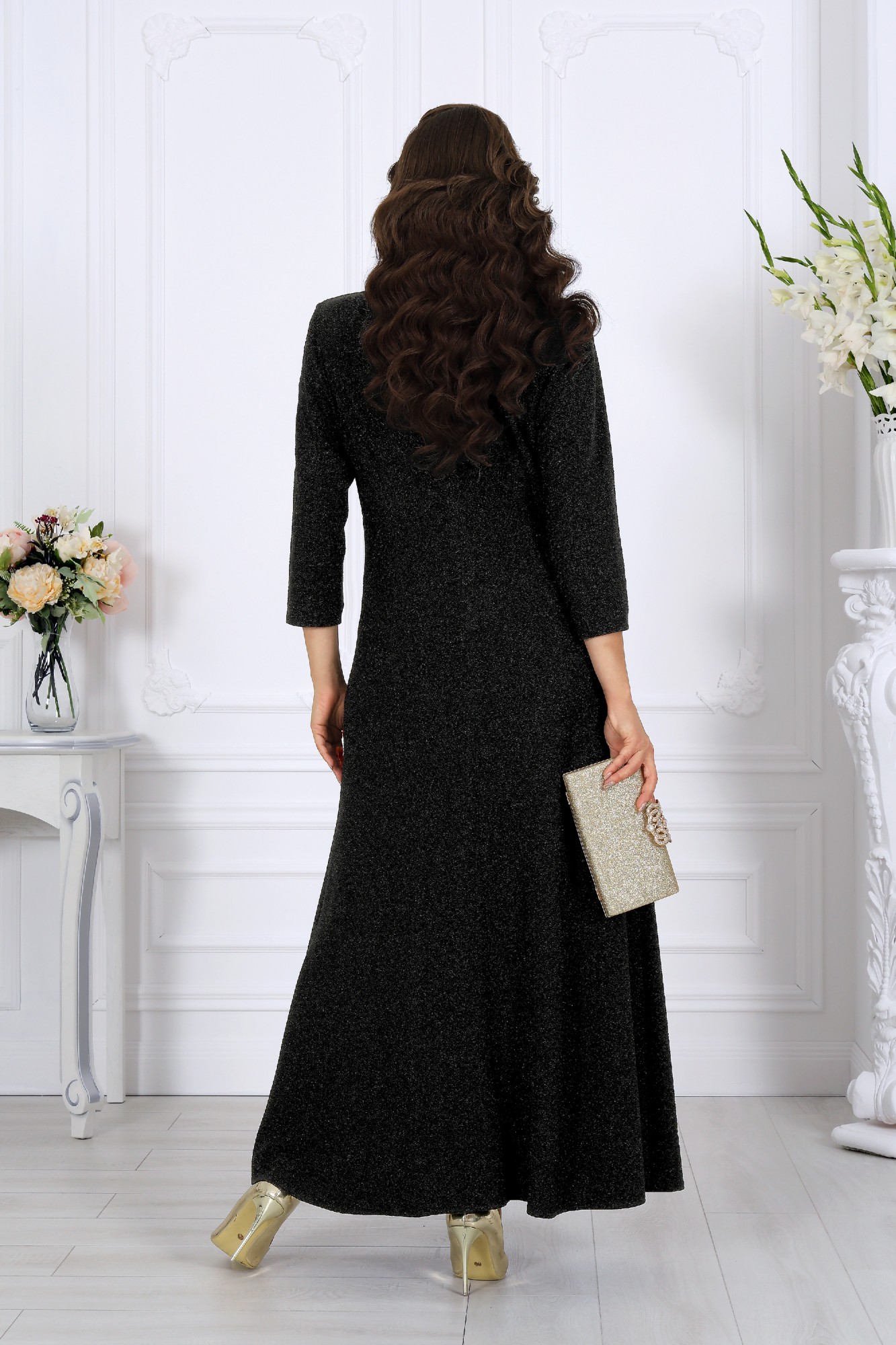 Элегантное вечернее платье из люрекса — создано для особенных событий. Изысканное длинное платье, которое подчеркивает женственность и утонченность. Выполнено из благородного трикотажного полотна с мерцающим люрексом — ткань мягко драпируется, не сковывает движения и эффектно играет при каждом шаге. Асимметричный перед с запахом и деликатными драпировками визуально стройнит и формирует правильный силуэт для женщин с формами. Глубокий разрез добавляет образу легкой смелости, оставаясь элегантным и уместным на торжественных мероприятиях. Платье женское, расширенное к низу, выполнено из трикотажного полотна с фактурной лицевой стороной «люрекс». Модель на трикотажной подкладке, с плечевыми накладками. Перед платья асимметричный, состоит из двух деталей, скрепленных на запах. На левой детали переда обработан рельефный шов с разрезом по низу. Правая деталь переда задрапирована сборкой и входит в рельеф на участке между двумя горизонтальными подрезами боковой части переда. На спинке обработаны таллиевые вытачки и средний шов с застежкой на потайную тесьму-«молнию» (50 см). Рукав трехчетвертной.