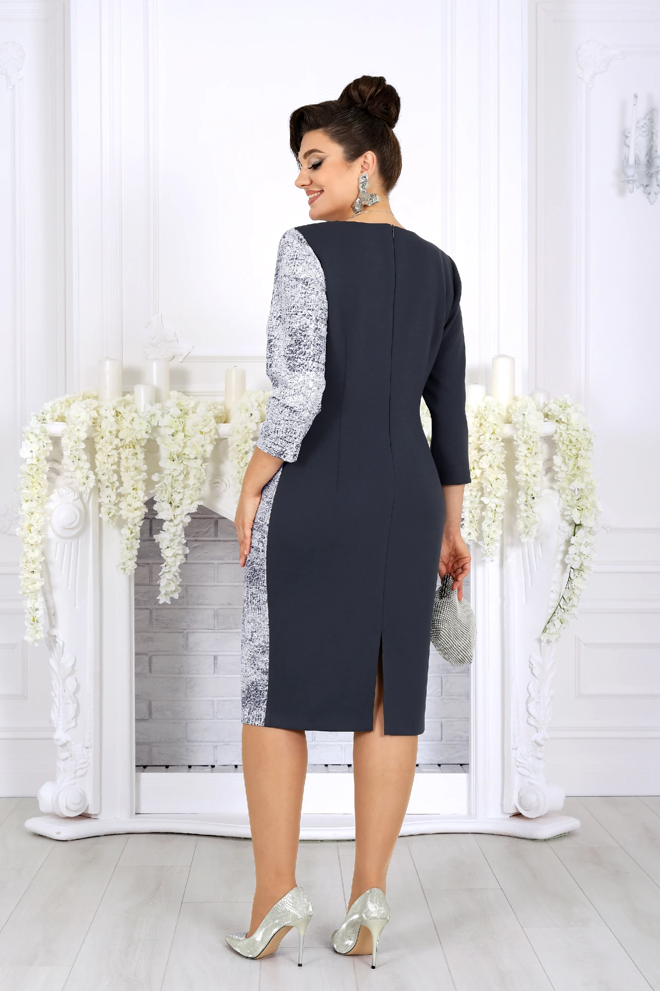 Элегантное платье, которое уверенно сочетает деловой стиль и праздничную выразительность. Модель создана для женщин, которые ценят безупречную посадку, комфорт и эффектный внешний вид. Контраст фактур и асимметричный крой визуально вытягивают силуэт, подчёркивая фигуру и создавая стройный образ. Комбинация гладкого однотонного трикотажа и жаккардового полотна с благородным напылением придаёт образу глубину и статусность. Асимметричный перед с фигурным подрезом и контрастной отделкой делает платье современным и запоминающимся, а продуманная конструкция обеспечивает отличную посадку даже в больших размерах. Модель на трикотажной подкладке мягко прилегает к телу, не сковывает движений и комфортна в течение всего дня. Плечевые накладки формируют аккуратную линию плеч, а рукав 3/4 делает платье универсальным — уместным и для офиса, и для торжественного выхода. Разрез по спинке добавляет свободу шага и женственность. Это платье легко станет базой гардероба: дополните его лодочками и клатчем — для праздника, или лаконичными аксессуарами — для деловой встречи. Платье женское, полуприлегающего силуэта, комбинированное, выполнено из двух видов трикотажных полотен – гладкого однотонного и жаккардового с напылением. Модель на трикотажной подкладке, с плечевыми накладками. Перед платья асимметричный: с нагрудной вытачкой на правой части переда и фигурным подрезом с контрастной бейкой на левой. На спинке обработаны талиевые вытачки и застежка на потайную тесьму-«молнию» (50 см) в верхней части среднего шва и разрезом в нижней. Горловина круглой формы, углубленная спереди. Рукав втачной, трехчетвертной.