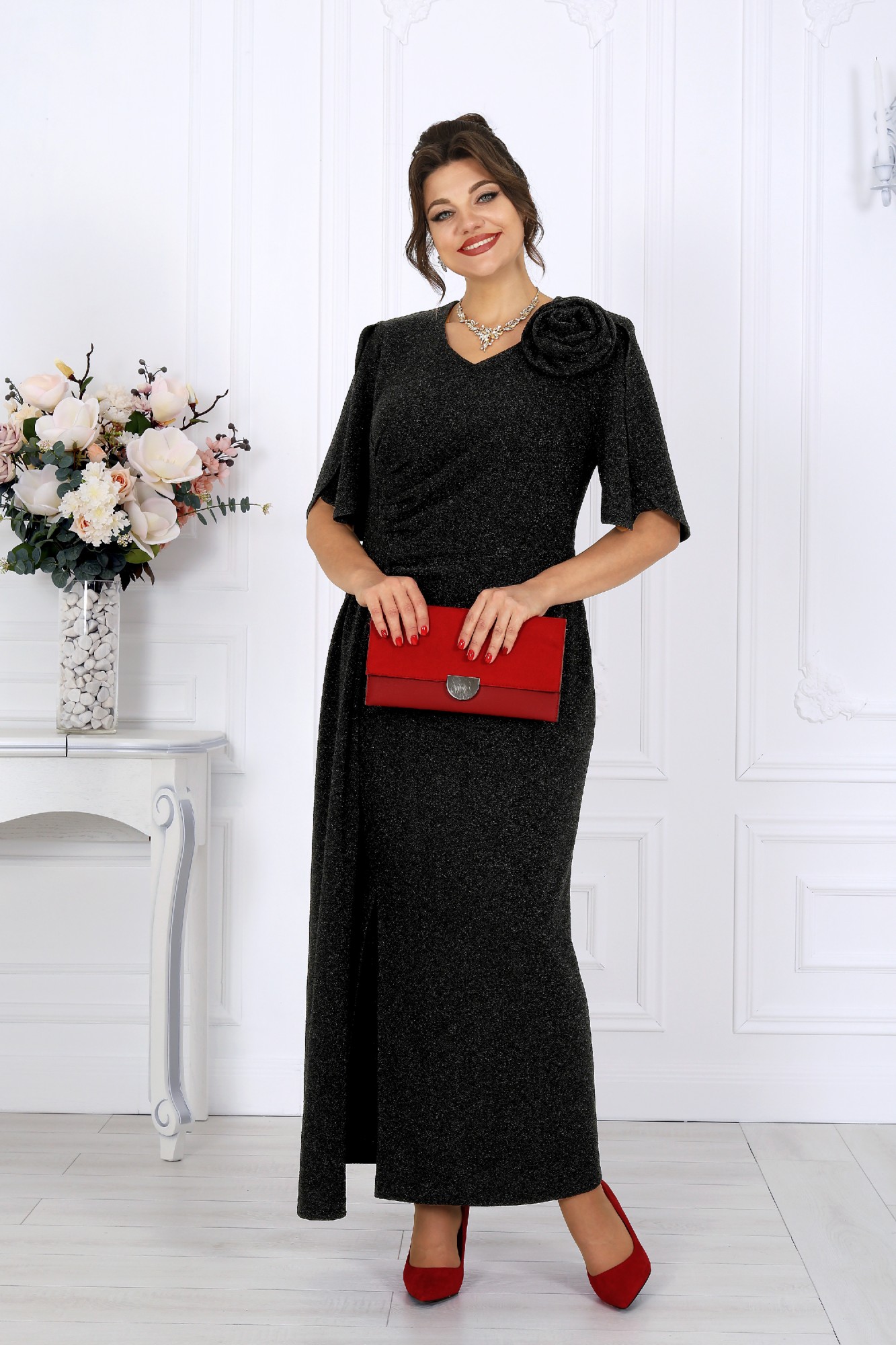 Платье, которое само по себе становится событием. Роскошное вечернее платье из мерцающего трикотажа с нитью люрекс создано, чтобы подчеркнуть женственность и элегантность в каждом движении. Оно притягивает взгляд, играя бликами при любом освещении — будь то мягкий свет ресторанных ламп или огни праздничного зала. Это тот редкий случай, когда комфорт и эффектность соединяются в идеальном балансе: платье выглядит торжественно, но остаётся удобным даже во время самого долгого вечера. Главный акцент — отлетная деталь из того же мерцающего полотна. Она добавляет образу утончённую театральность. Съемный цвет выполнен в тон платья, его можно расположить на плече, в зоне декольте или у талии — в зависимости от настроения и события. Платье идеально садится по фигуре, подчёркивая достоинства женщин с роскошными формами. Эта модель — воплощение торжественности и женственности. Она будет уместна на свадьбе, юбилее, выпускном, театральной премьере или корпоративном вечере. Стоит лишь надеть туфли на каблуке и добавить каплю любимого парфюма — и вы уже героиня праздника, к которой прикованы все взгляды. Платье женское полуприлегающего силуэта, выполнено из трикотажного полотна с фактурной лицевой стороной «люрекс». Модель на трикотажной подкладке, с плечевыми накладками. В левом боковом шве обработана застежка на потайную тесьму-«молнию» (35 см). Перед платья с горизонтальным подрезом по линии талии и отлетной деталью в шве подреза. В правой части переда обработан рельеф с разрезом в нижней части. Вдоль рельефного шва заложены односторонние складки, направленные к центру переда. Спинка с таллиевыми вытачками. Горловина спинки округлая, по переду V-образная, углубленная. Рукав короткий, втачной, формы «крылышко на запах», со скругленными краями. Платье дополнено съемным «цветком» из основного полотна.