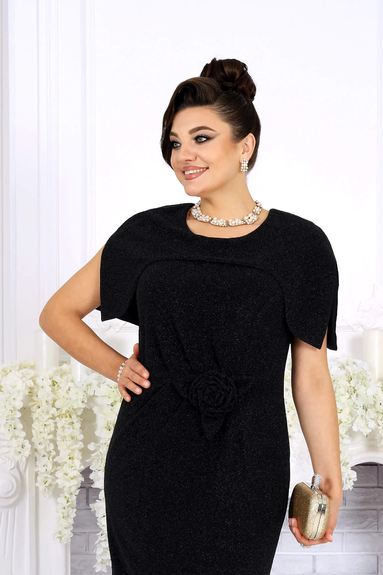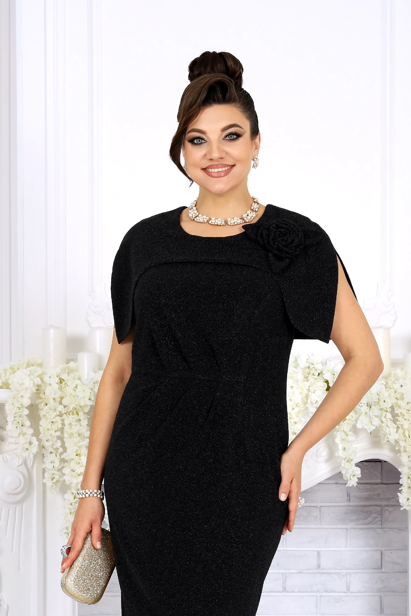 Элегантное женское платье создано для особых случаев, когда хочется выглядеть безупречно и чувствовать себя уверенно. Модель полуприлегающего силуэта мягко подчёркивает фигуру, визуально вытягивает силуэт и комфортно садится на фигуру, в том числе в больших размерах. Платье выполнено из эффектного трикотажного полотна с фактурной лицевой стороной «люрекс», которое красиво переливается при свете и придаёт образу праздничное настроение. Трикотажная подкладка обеспечивает комфорт при носке и идеальную посадку. Особый акцент модели — эффектная пелерина с фигурным низом и разрезами от плечевых швов. Она создаёт ощущение многослойности, скрывает зону плеч и рук и добавляет образу торжественности. Съёмный декоративный цветок позволяет менять настроение платья — от сдержанной классики до выразительного праздничного образа. Это платье станет идеальным выбором для свадьбы, торжественного вечера, юбилея, корпоратива или праздничного выхода, подчёркивая статус и вкус своей обладательницы. Платье женское полуприлегающего силуэта, выполнено из трикотажного полотна с фактурной лицевой стороной «люрекс». Модель на трикотажной подкладке, без воротника и рукавов, без плечевых накладок. Перед отрезной по линии талии; на верхней части обработан рельеф, направленный от левой проймы, на нижней части, на продолжении линии рельефного шва, обработана таллиевая вытачка. По обе стороны от подреза талии переда застрочены косые односторонние складки. Спинка с таллиевыми вытачками и средним швом, в верхней части которого обработана застежка на потайную тесьму-«молнию» (50см), в нижней – разрез. Горловина круглой формы, спереди углубленная. В шов обтачивания горловины входит пелерина с фигурным низом и разрезами от плечевых швов; пелерина разъемная по середине спинки. Платье дополнено съемным «цветком» из основного полотна. Длина платья - 106 см.