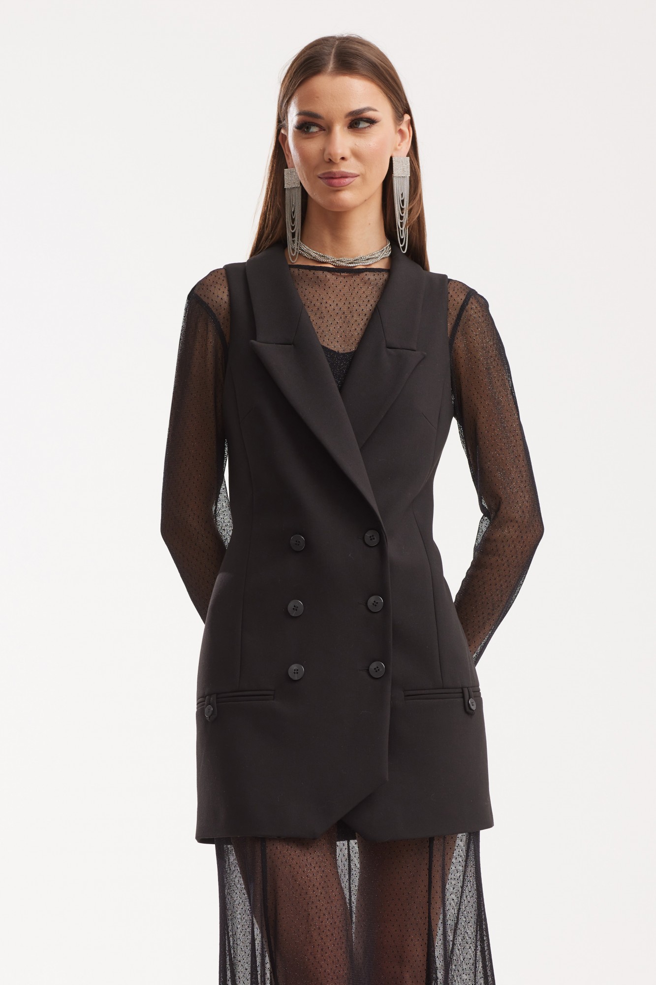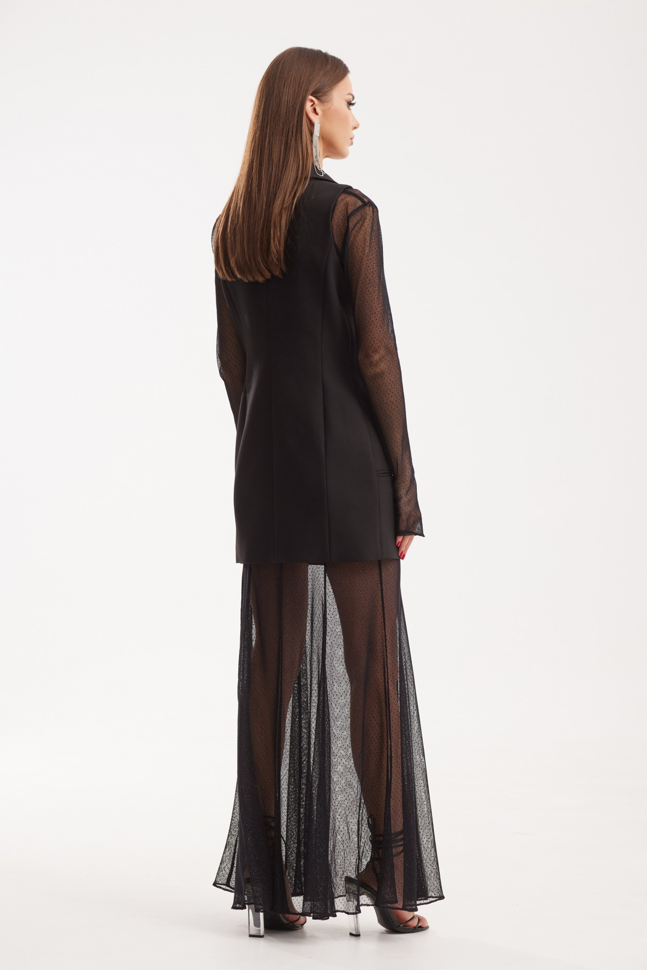 Платье-жилет выполнено на подкладке из костюмной ткани, полуприлегающего силуэта, втачного покроя с двубортной застежкой по три пары пуговиц. Горловина оформлена воротником пиджачного типа. В области бедер расположены прорезные карманы в рамку с петелькой и пуговицей. Спинка состоит из центральных и боковых частей. По переду расположены бочки и нагрудные вытачки.