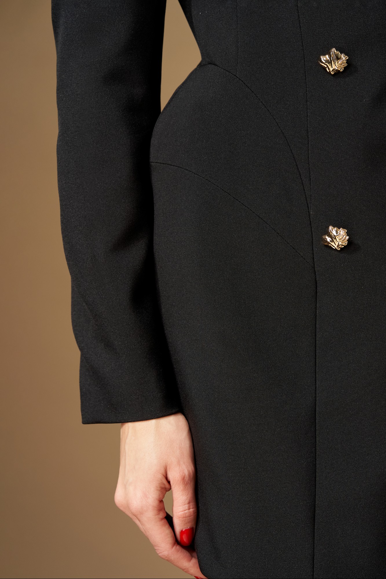 Платье женское полуприлегающего силуэта, выполнено из костюмной ткани на подкладке. Платье с двубортной застежкой на две пары пуговиц, с фигурным низом. Воротник пиджачного типа. По переду рельеф от плечевого шва, проходящий через центр груди, бочок отрезной из проймы. По спинке средний шов, рельеф от плеча и бочок из проймы. По боковым швам переда и спинки вставлены фигурные подрезы, зрительно расширяющие линию бедер. Рукава втачные, двухшовные, полноценной длины. Фурнитура может незначительно отличаться, не изменяя художественному образу.
