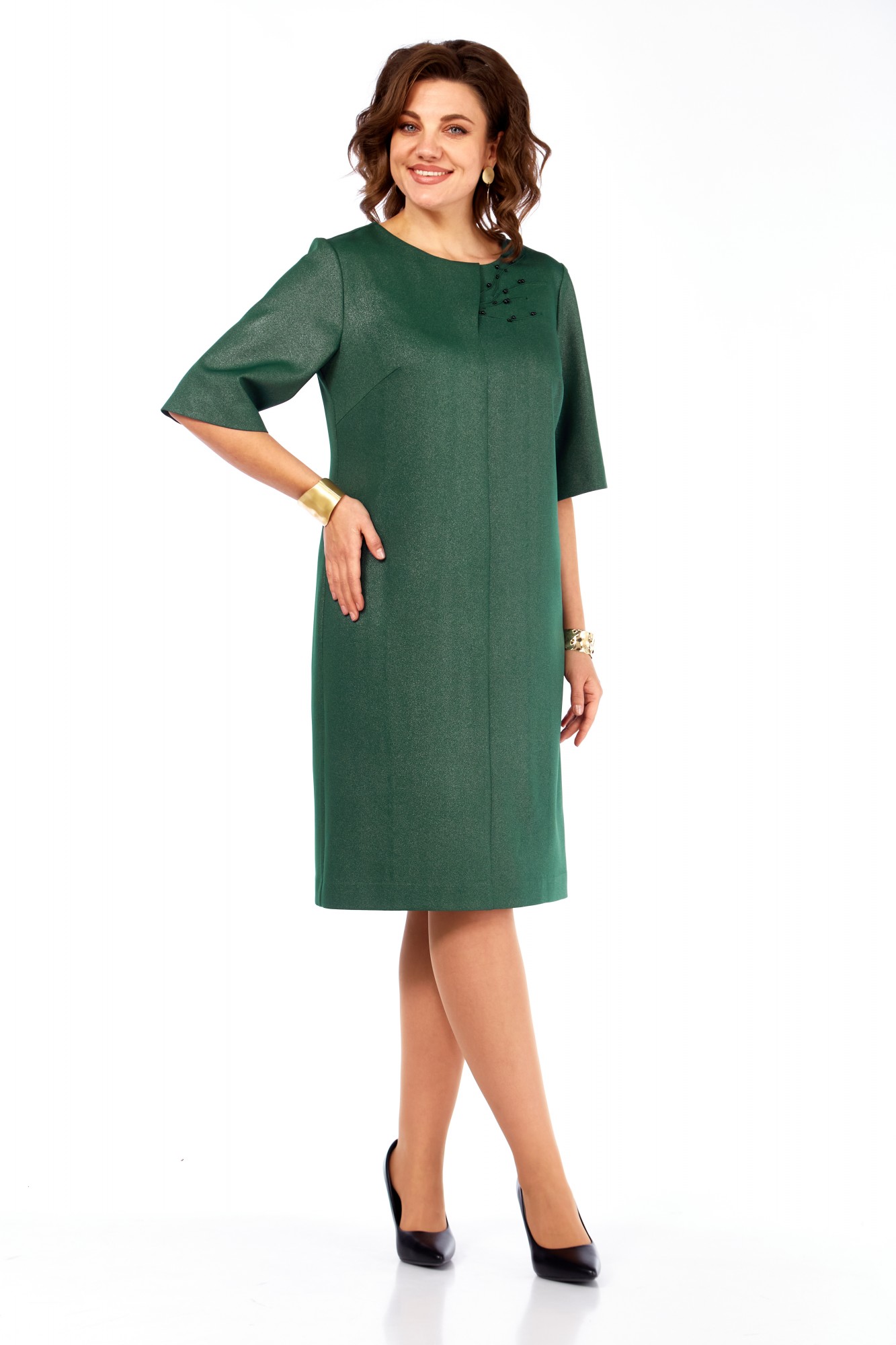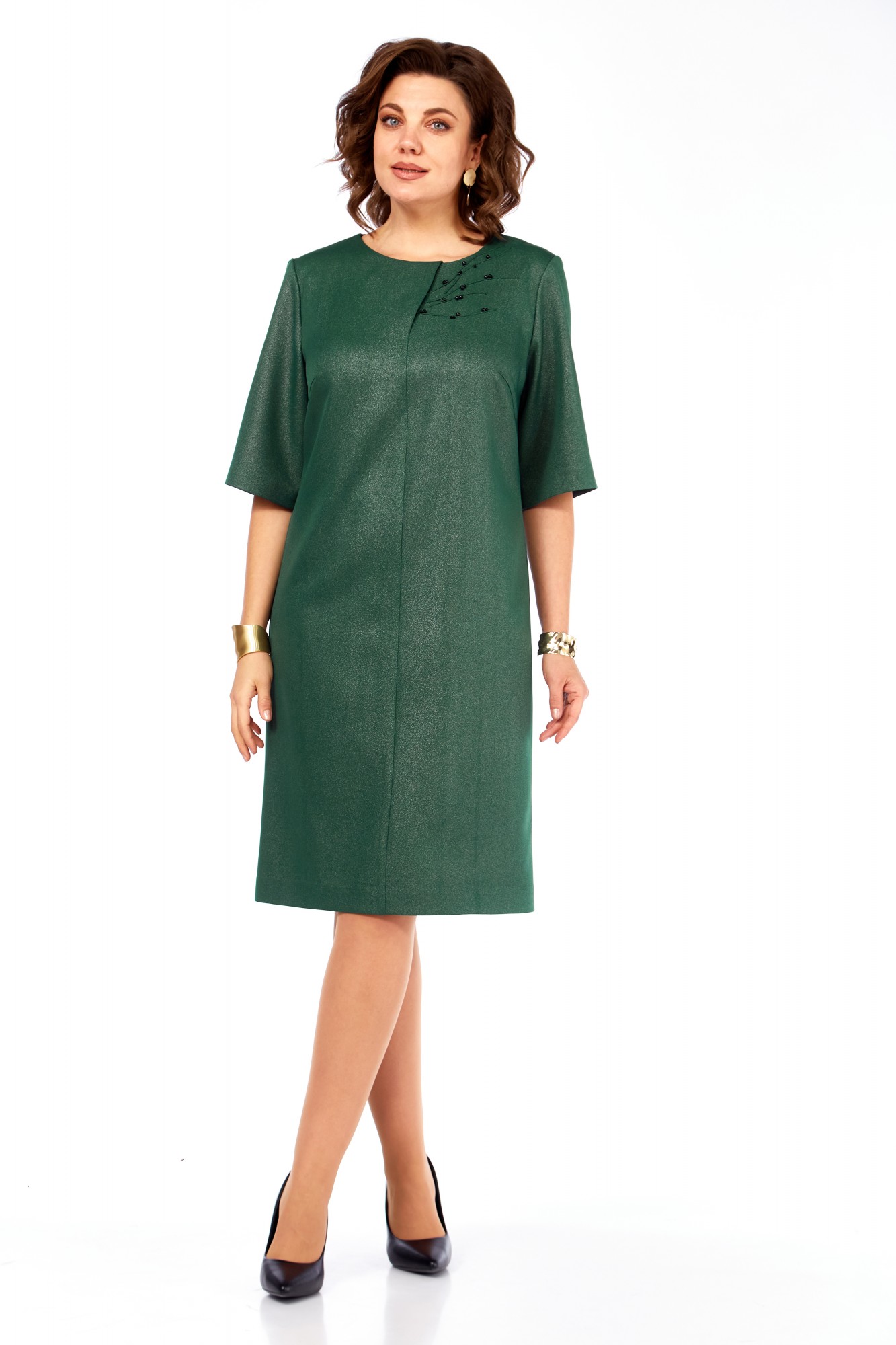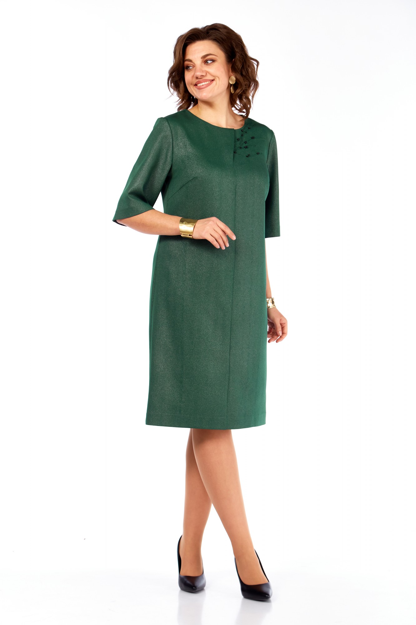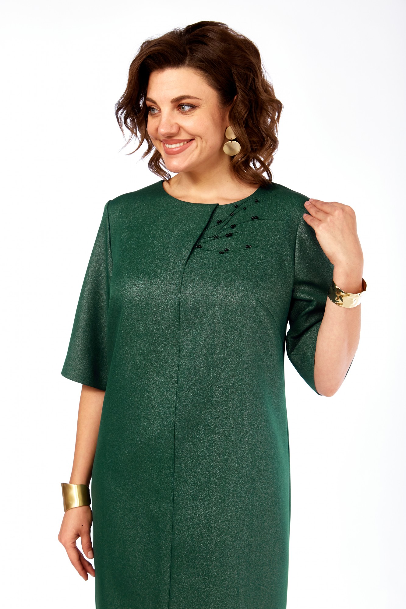 Нарядное платье, из ткани с блеском, полуприлегающего силуэта. Вырез округлой формы, по центру шов, в верхней части, который уходит в ассиметричную складку. Декор выполнен из прошитых защипов, украшенных бусинами. Спинка со средним швом, молнией и разрезом. Рукав втачной, длиной ниже линии локтя.