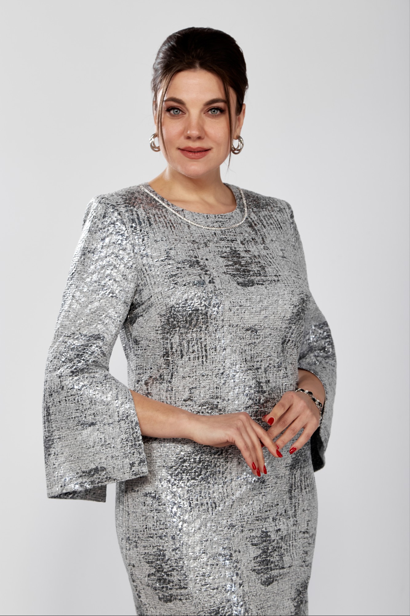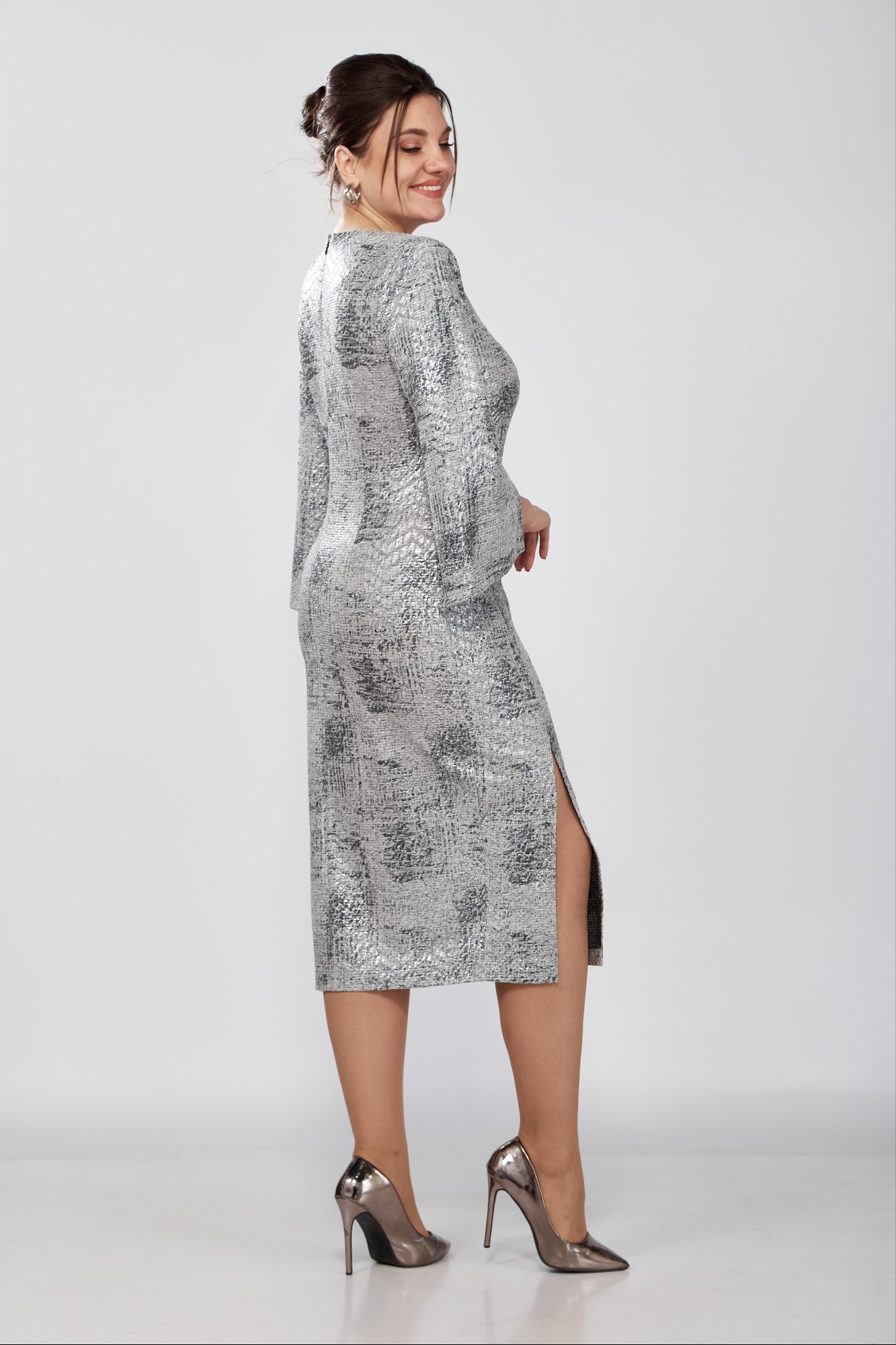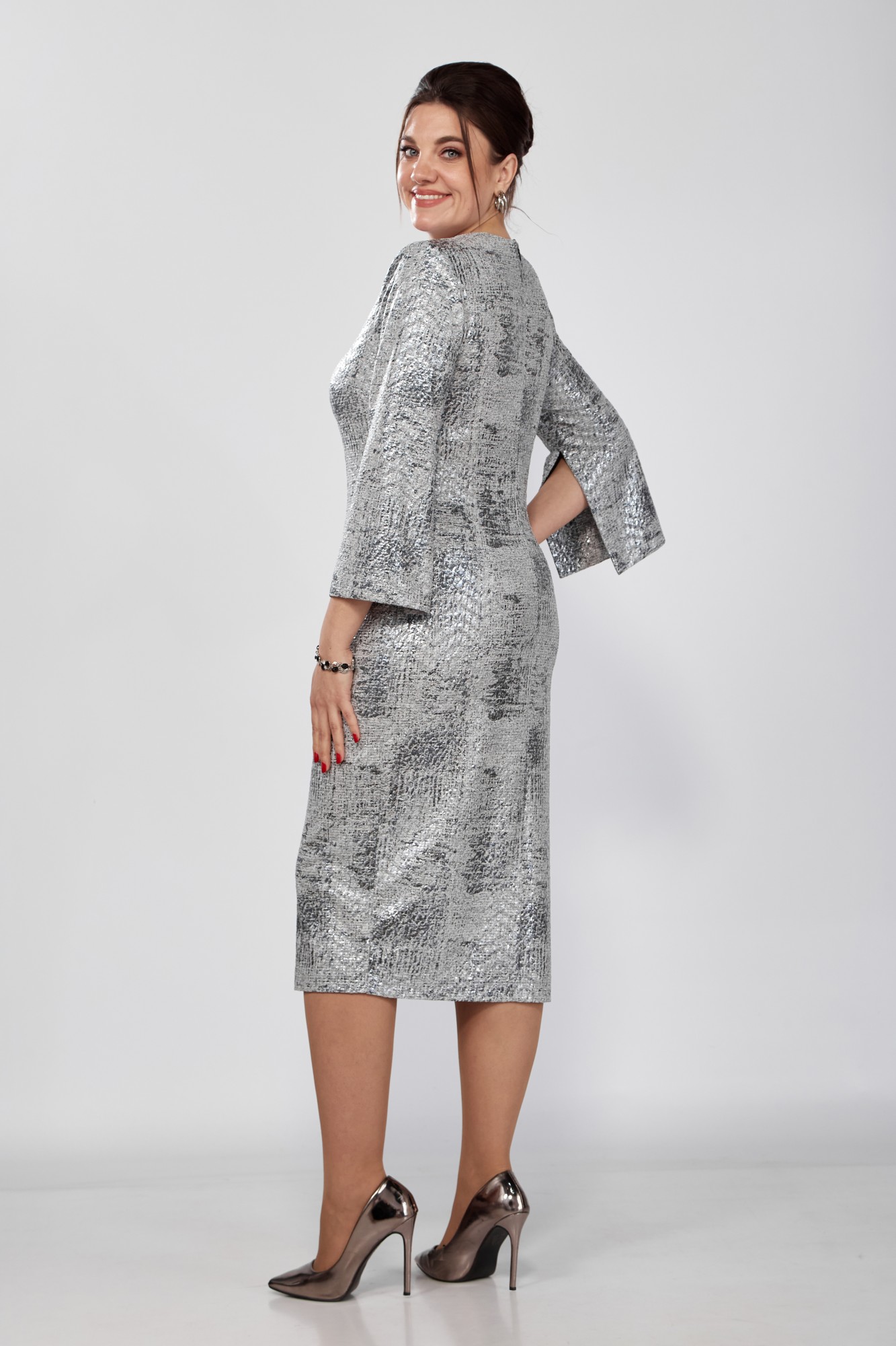 Платье женское, полуприлегающего силуэта, втачного покроя. Выполнено из трикотажного плательного полотна с блеском. Горловина округлой формы, задекорирована отделочной тесьмой по форме горловины переда. Спинка с таллиевыми вытачками и средним швом, в котором расположена тесьма-молния. Рукава 7/8 с разрезом по шву до локтя. По переду расположены нагрудные вытачки и подрез закругленной формы, переходящий в разрез. Платье по фигуре и книзу заужено.
