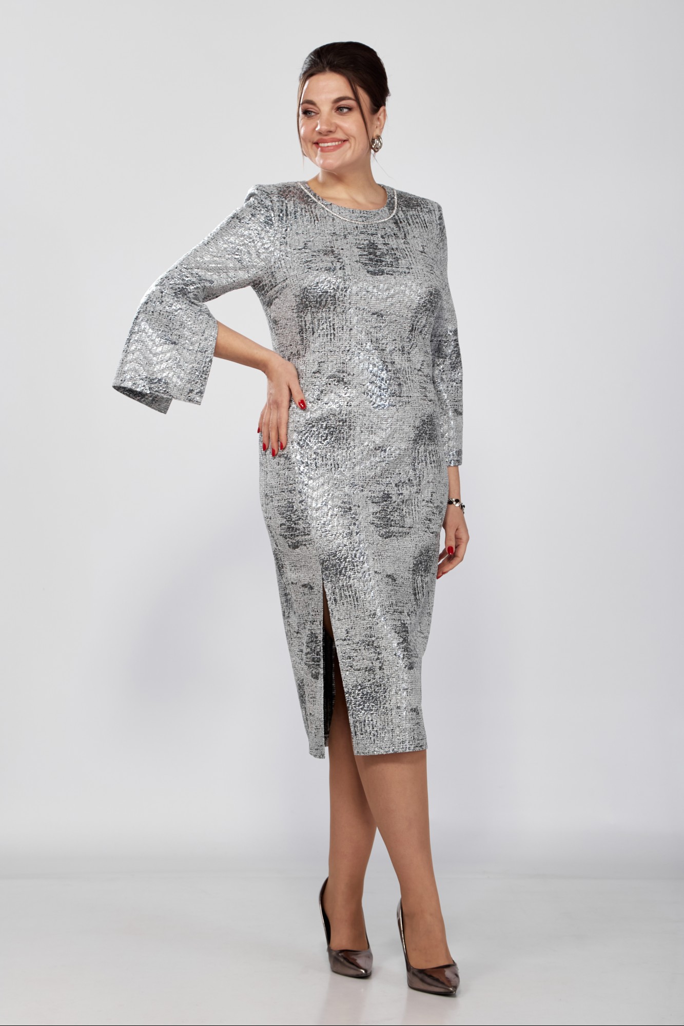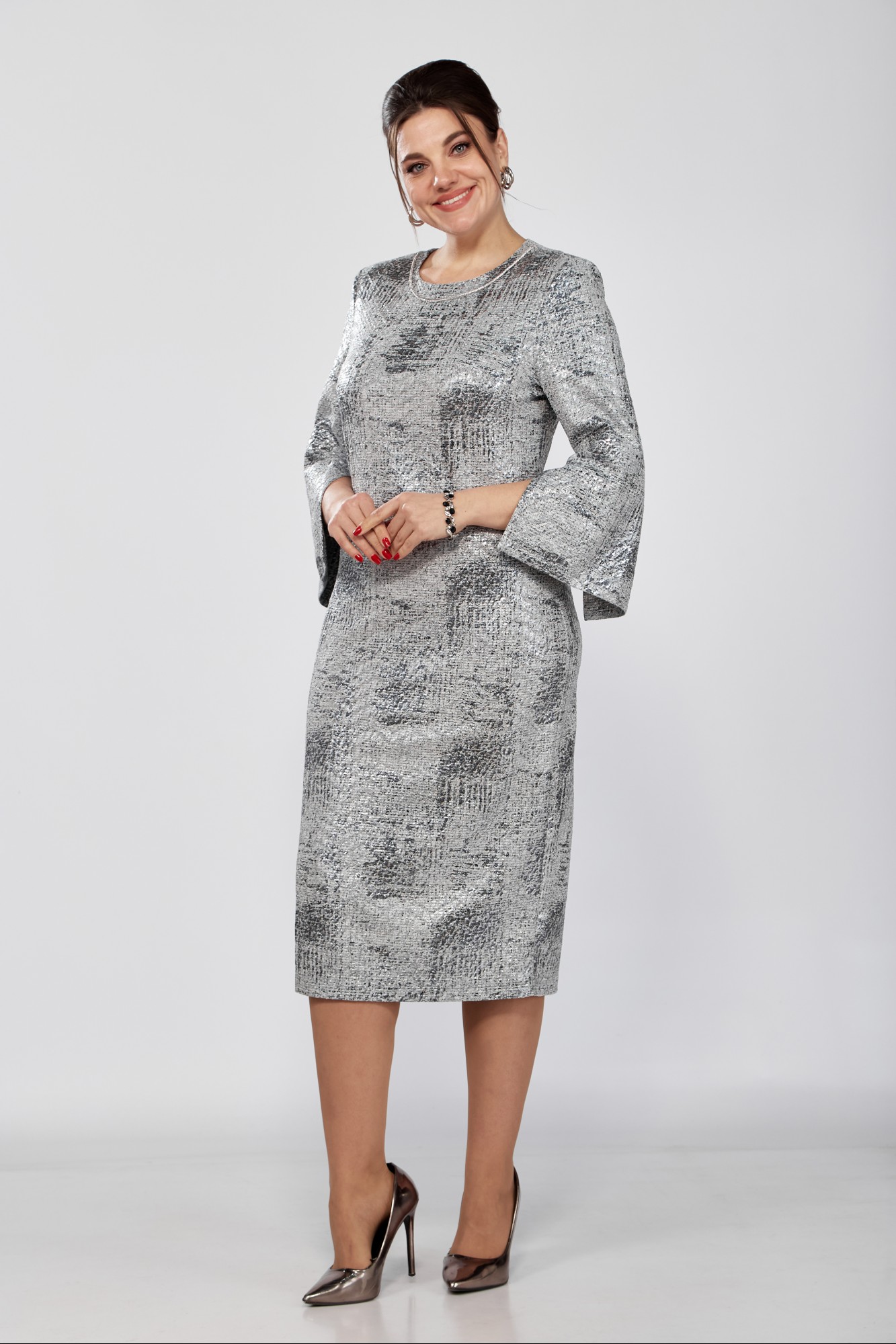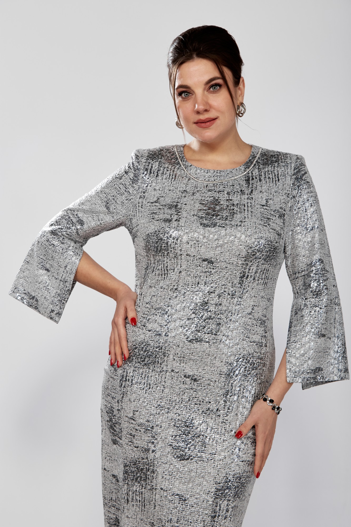 Платье женское, полуприлегающего силуэта, втачного покроя. Выполнено из трикотажного плательного полотна с блеском. Горловина округлой формы, задекорирована отделочной тесьмой по форме горловины переда. Спинка с таллиевыми вытачками и средним швом, в котором расположена тесьма-молния. Рукава 7/8 с разрезом по шву до локтя. По переду расположены нагрудные вытачки и подрез закругленной формы, переходящий в разрез. Платье по фигуре и книзу заужено.