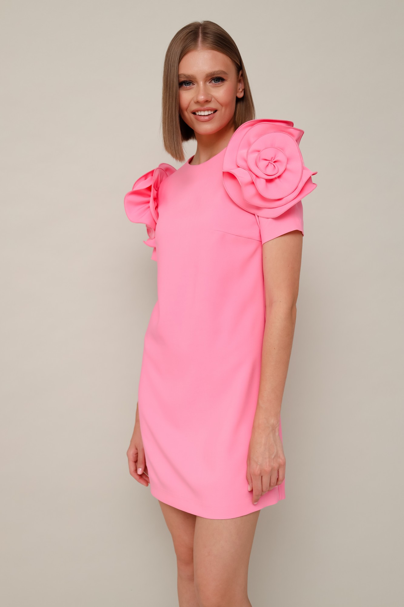 Платье А-образного силуэта. Округлый вырез горловины. Втачные короткие рукава, декорированные элементами из основной ткани в виде цветка. Застежка по спинке в среднем шве на потайную молнию. Платье без подкладки.