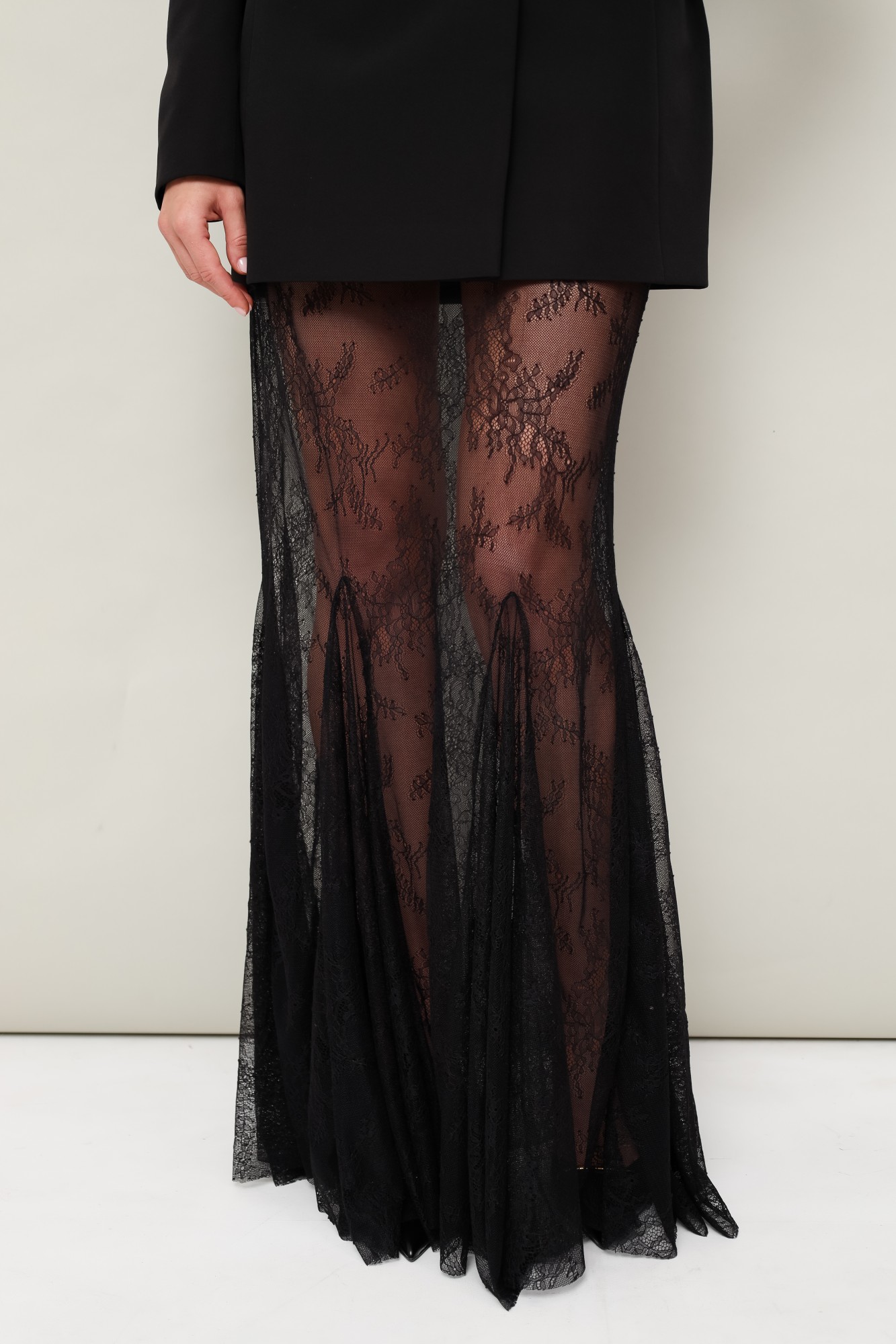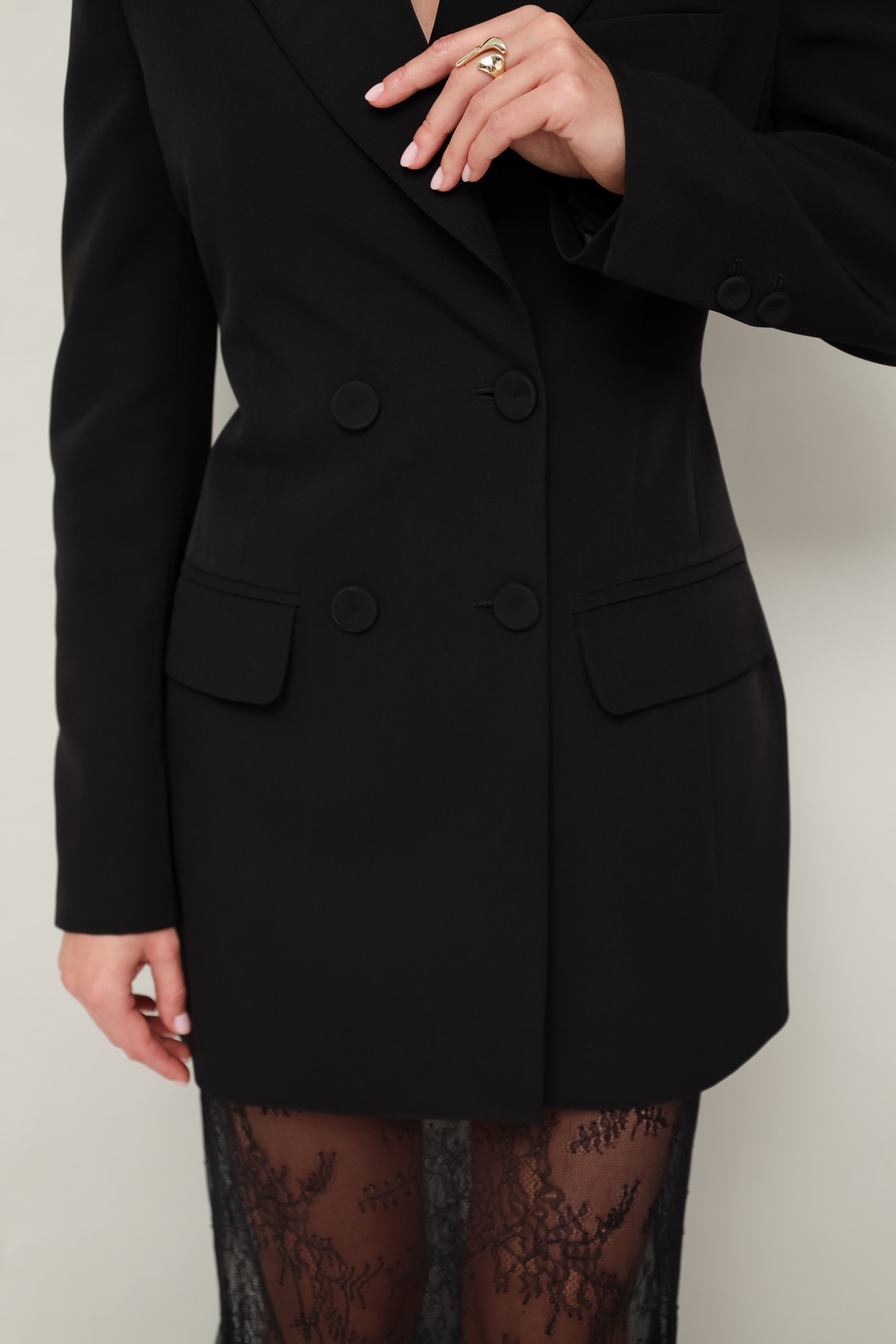Силуэтное платье-жакет прилегающего кроя, выполнено из качественной костюмной ткани. Воротник пиджачного типа с отложными лацканами. Двубортная застежка на петли и обтяжные пуговицы. Спереди обработаны прорезные карманы в рамку с клапанами и нагрудный прорезной карман с листочкой. Рукава втачные, двухшовные с отлетными шлицами и обтяжными пуговицами. Спинка с рельефами и средним швом. Платье-жакет на подкладке. Силуэтная юбка годе с расклешением от линии колен с втачными клиньями. Юбка выполнена из изысканного кружевного полотна. Пояс обработан резинкой для комфорта и регуляции размера.