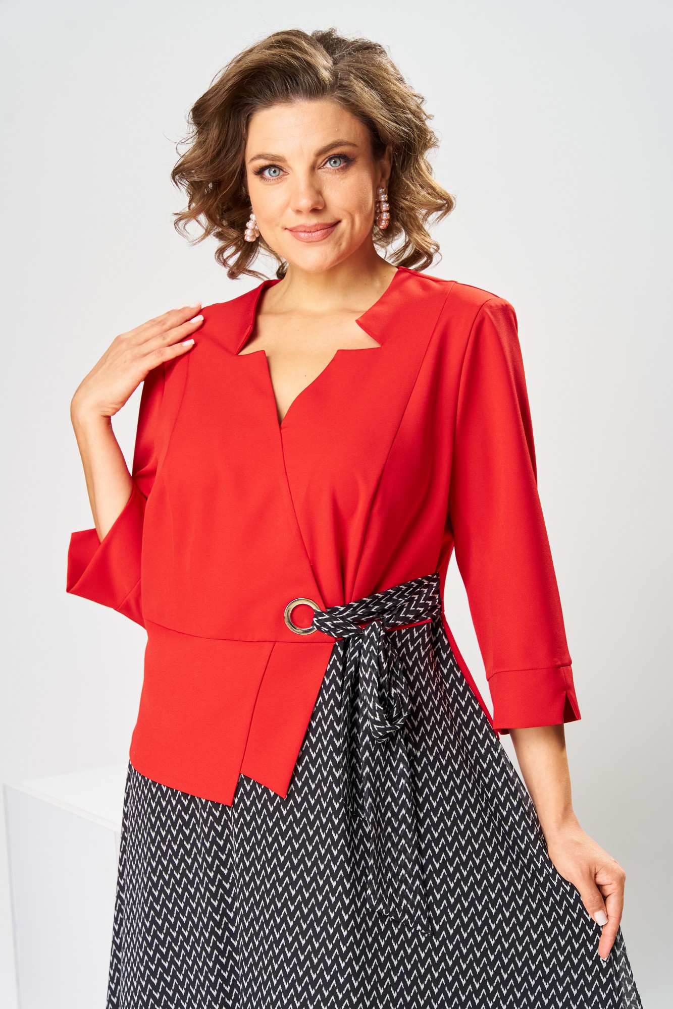 Платье женское относится к нарядной торжественной одежде, но может использовано и при повседневной носке. Платье женское, отрезное по линии талии, расширенное к низу, длиной за колено. Верхняя часть переда с отрезными рельефами, выходящими из плечевых швов, центральная часть с зафиксированным запахом. Верхняя часть спинки со средним швом и 2-мя рельефами, выходящими из плечевых швов. Горловина с V-образным вырезом, фигурная, обточная без воротника. Нижняя часть переда и нижняя часть спинки цельнокроеные, выполнены из отделочной ткани. Шов соединения верхней и нижней частей платья декорирован притачной фигурной отлетной баской. Платье с декоративным поясом из отделочной ткани, закреплённом на левом боковом шве и фиксирующимся в бант через металлическую пробивную блочку на центральной части переда. Рукав одно шовный втачной, длиной до локтя, с притачной фигурной манжетой. Платье с плечевыми накладками. Нижняя часть на подкладке.
