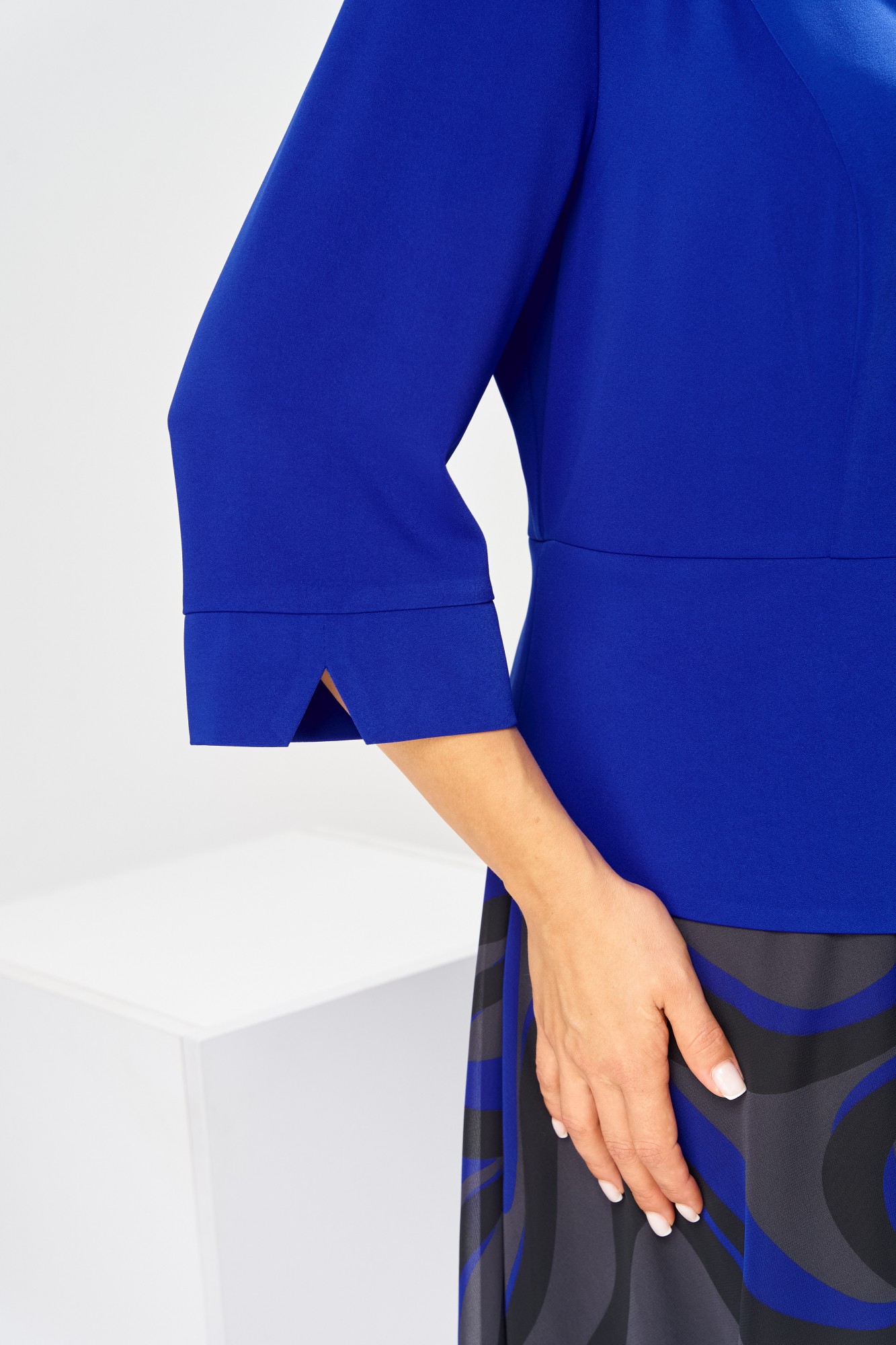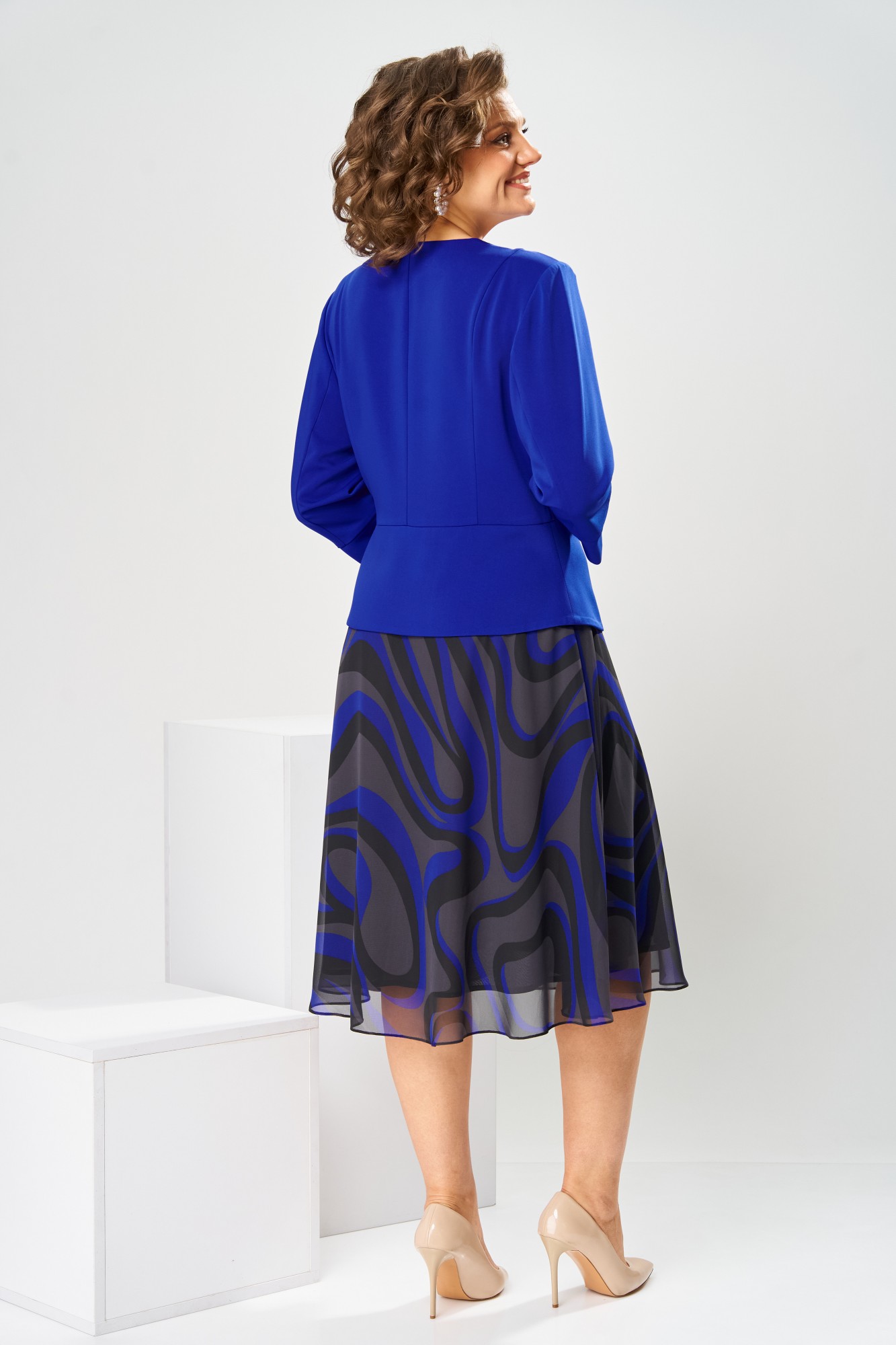 Платье женское относится к нарядной торжественной одежде, но может использовано и при повседневной носке. Платье женское, отрезное по линии талии, расширенное к низу, длиной за колено. Верхняя часть переда с отрезными рельефами, выходящими из плечевых швов, центральная часть с зафиксированным запахом. Верхняя часть спинки со средним швом и 2-мя рельефами, выходящими из плечевых швов. Горловина с V-образным вырезом, фигурная, обточная без воротника. Нижняя часть переда и нижняя часть спинки цельнокроеные, выполнены из отделочной ткани. Шов соединения верхней и нижней частей платья декорирован притачной фигурной отлетной баской. Платье с декоративным поясом из отделочной ткани, закреплённом на левом боковом шве и фиксирующимся в бант через металлическую пробивную блочку на центральной части переда. Рукав одно шовный втачной, длиной до локтя, с притачной фигурной манжетой. Платье с плечевыми накладками. Нижняя часть на подкладке.