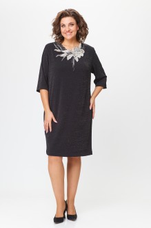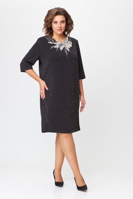 Платье женское свободного кроя зауженное к низу. Выполнено из мягкого трикотажного полотна с люрексовой нитью. По переду нагрудные вытачки. Украшением платья служит пришивное кружево-воротник по переду и по спинке. Рукав втачной, свободный, прямой 3/4 выполнен из основной ткани. Длина платья 103 см. Длина рукава от плечевого шва 40 см, ширина (обхват) по низу рукава 38 см. Деликатная стирка при 30 градусах!