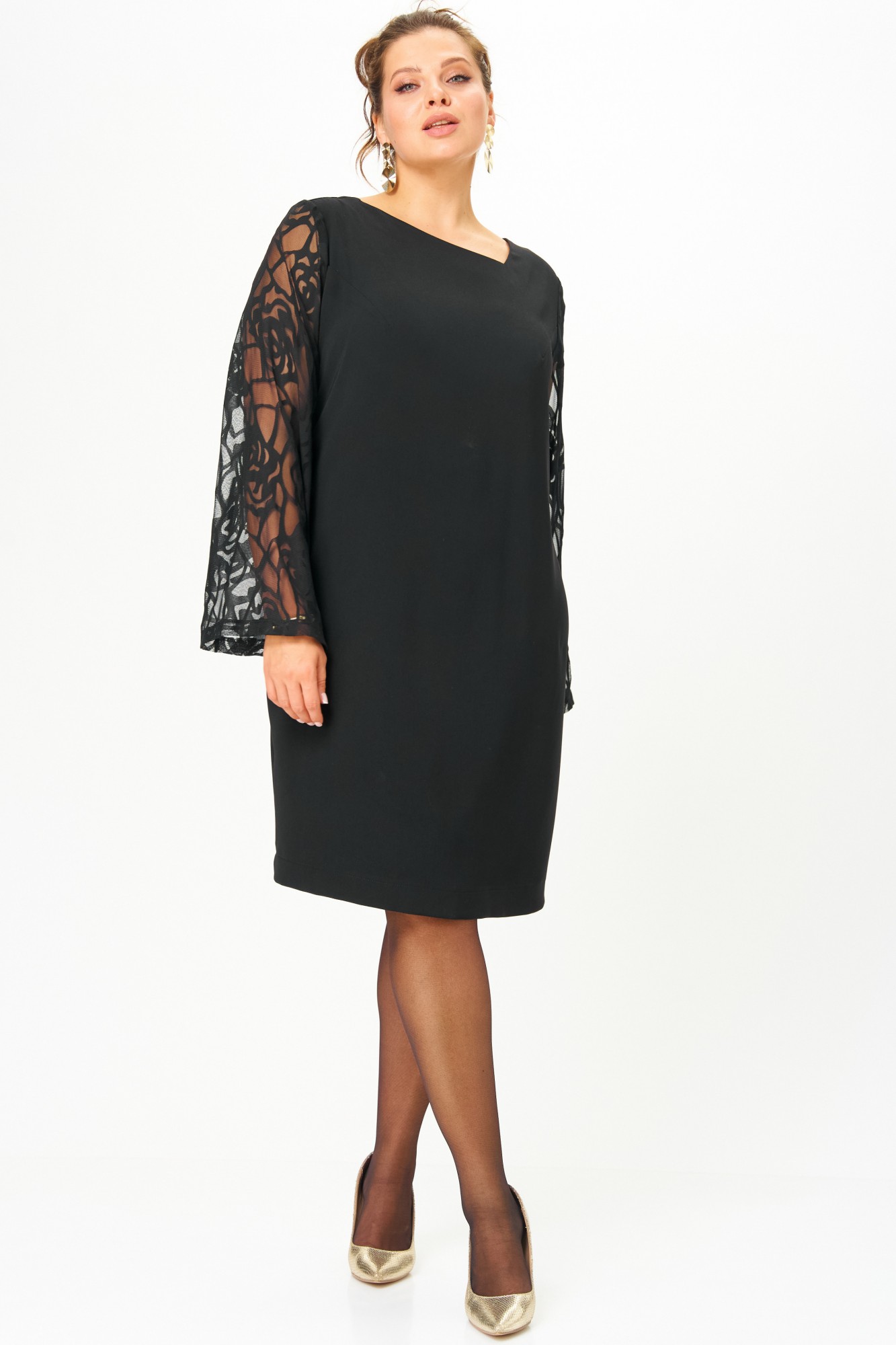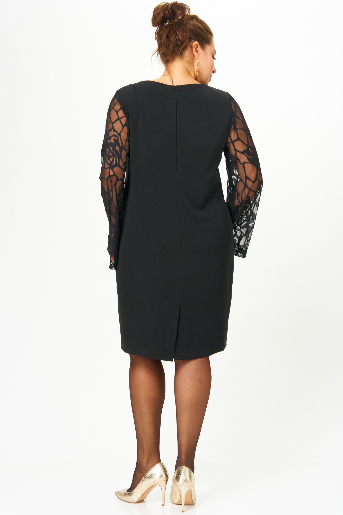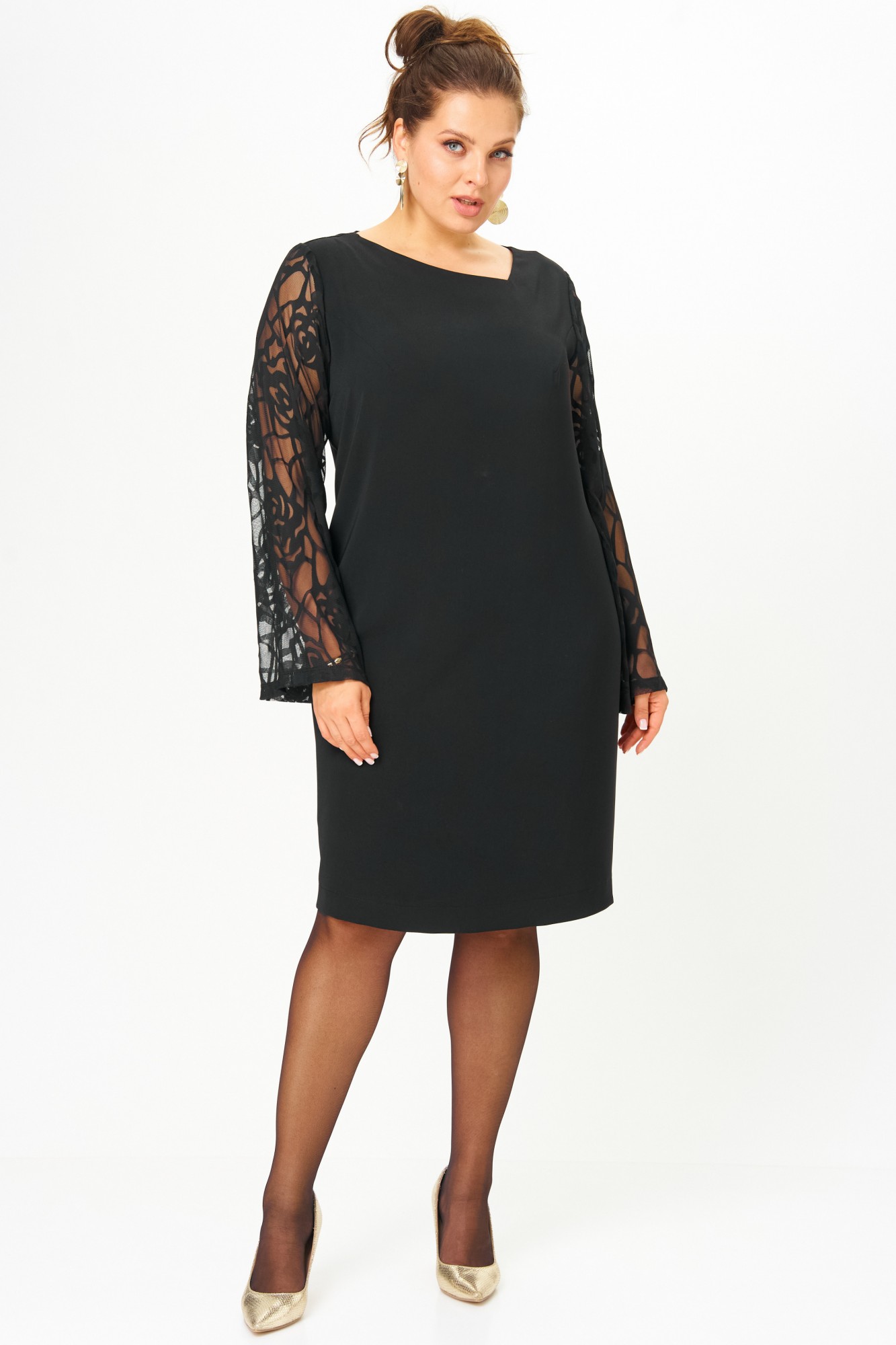 Идеальный вариант платья для нарядного выхода. Базовая посадка. Полуприлегающий силуэт. Асимметричный вырез горловины. Рукава выполнены из мягкой трикотажной сетки.