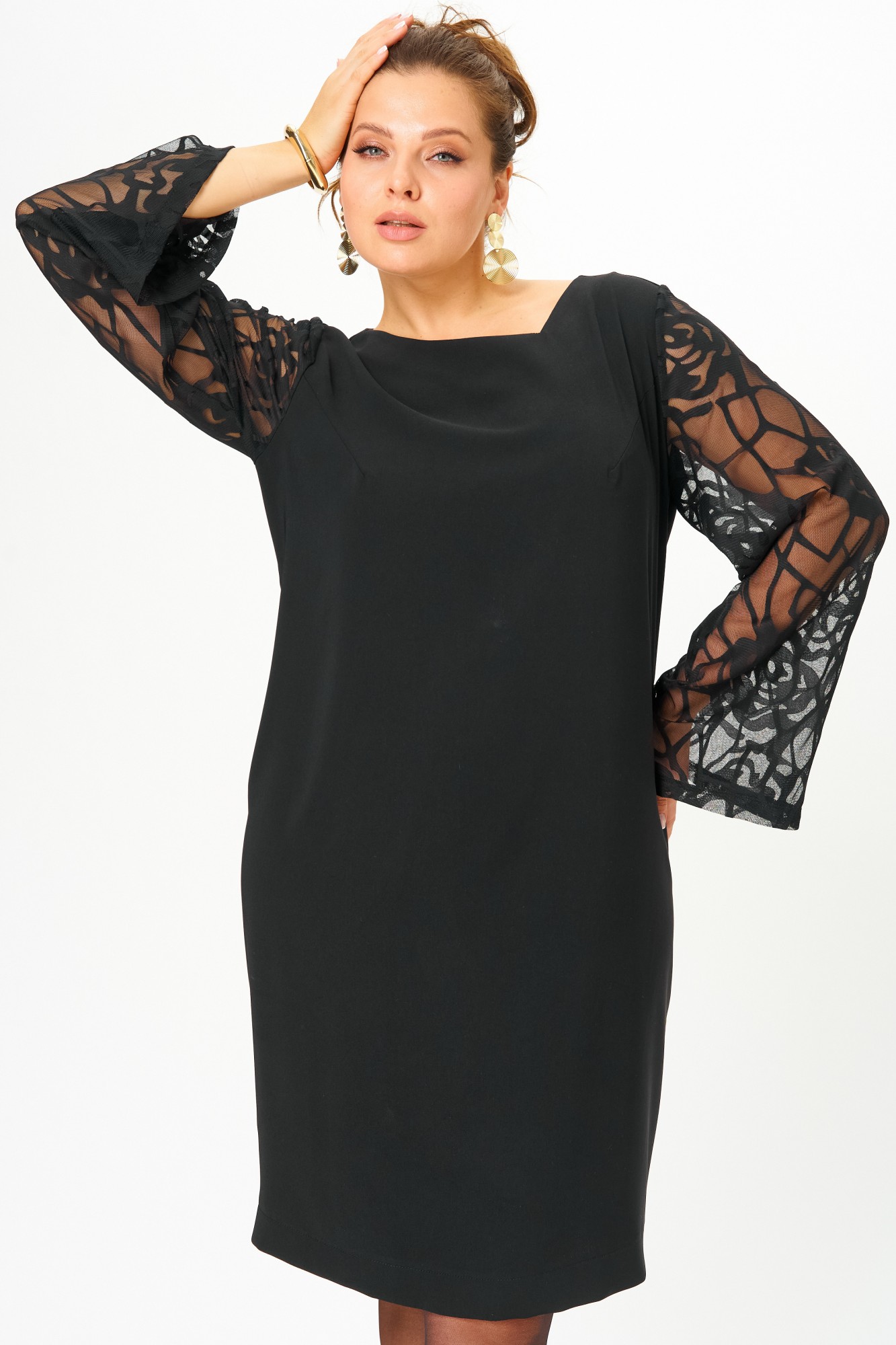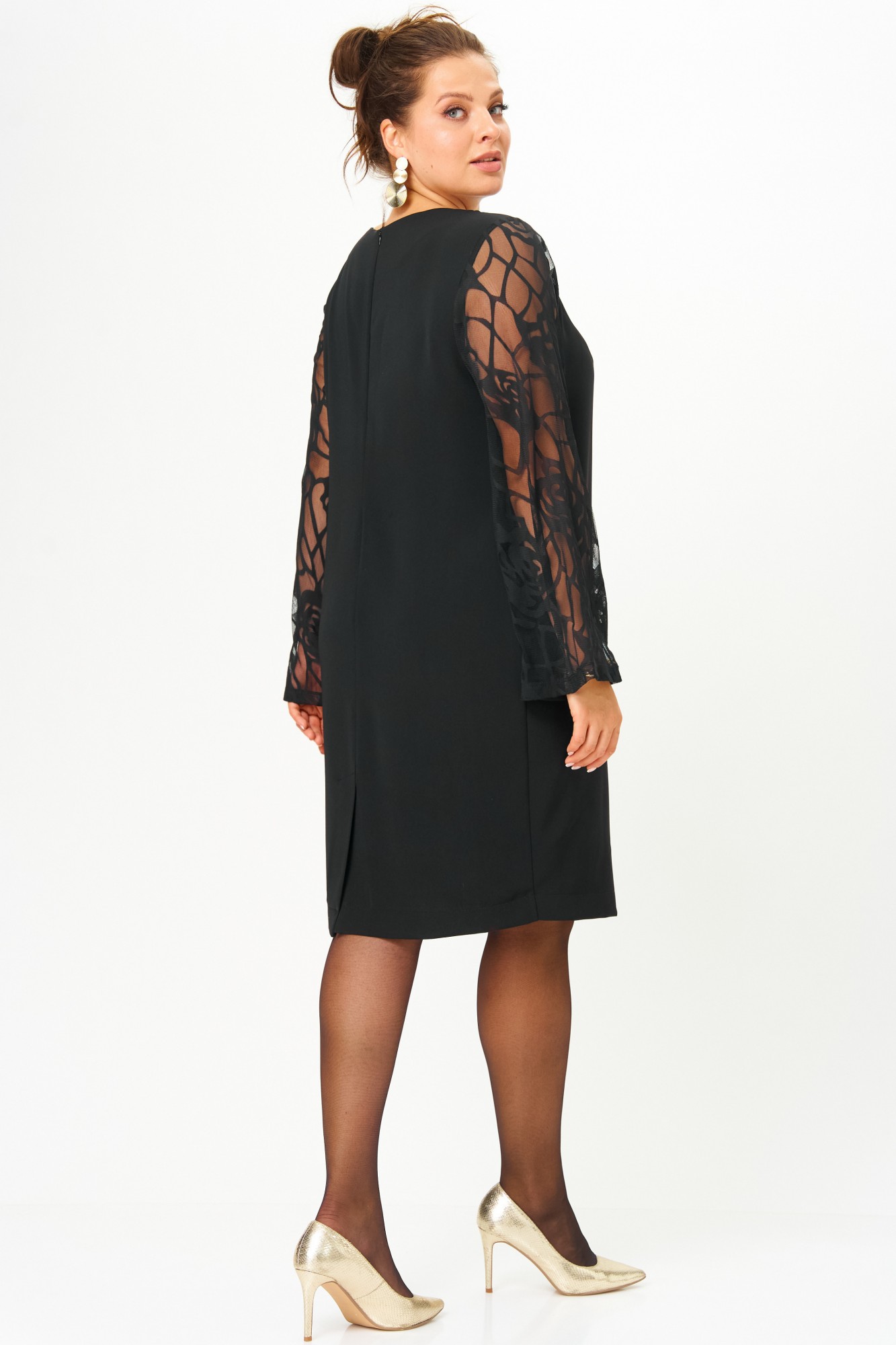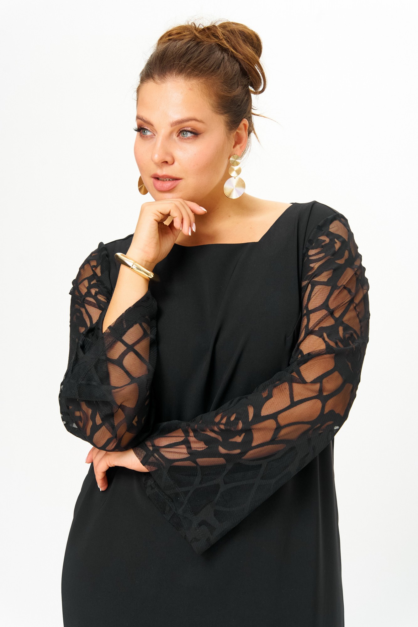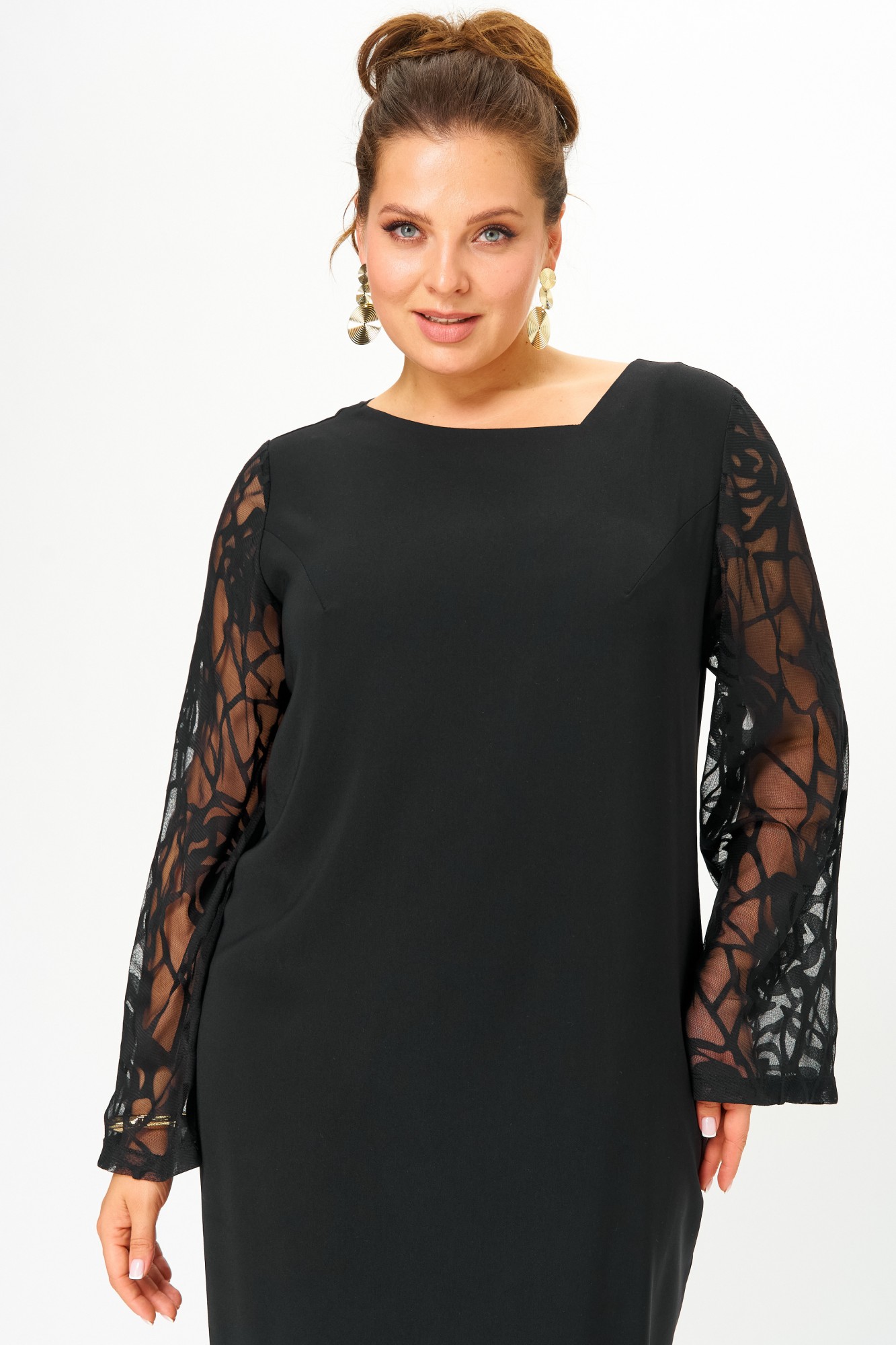 Идеальный вариант платья для нарядного выхода. Базовая посадка. Полуприлегающий силуэт. Асимметричный вырез горловины. Рукава выполнены из мягкой трикотажной сетки.