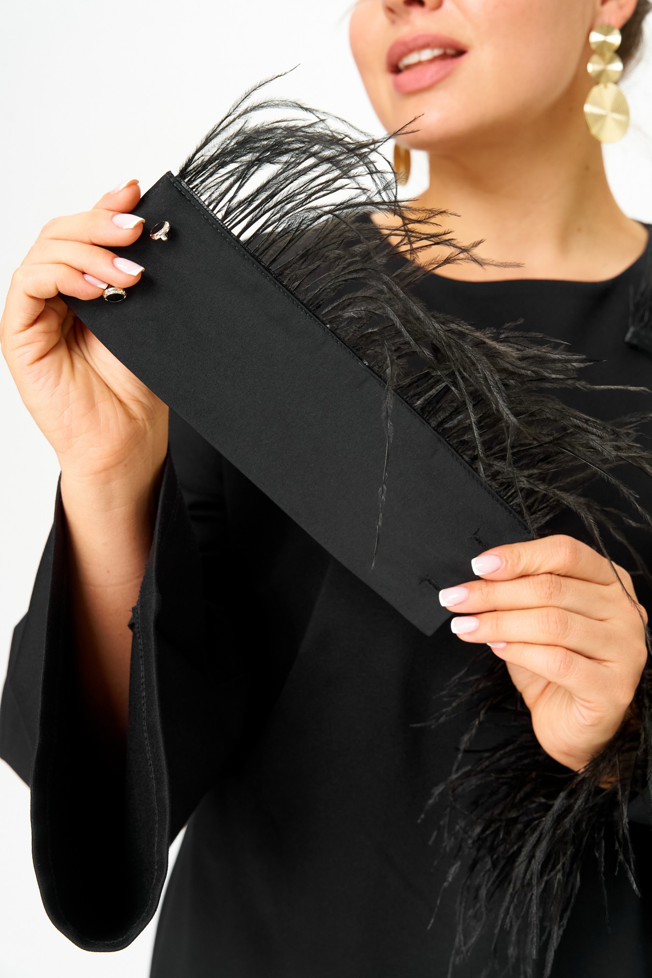Базовое платье. Платье выполнено из трикотажного полотна. Съемные декоративные манжеты придают романтичность и нарядность образу. Манжета выполнена из атласной ткани и декорирована "перьями". Платье А-силуэта. Рукав длинный расширенный к низу. Универсальный вариант платья для вечеринок и повседневной носки.