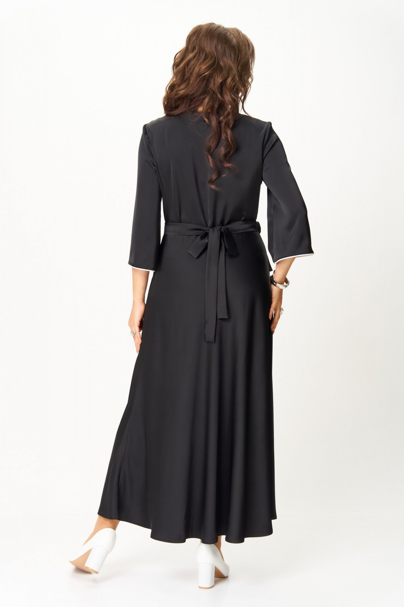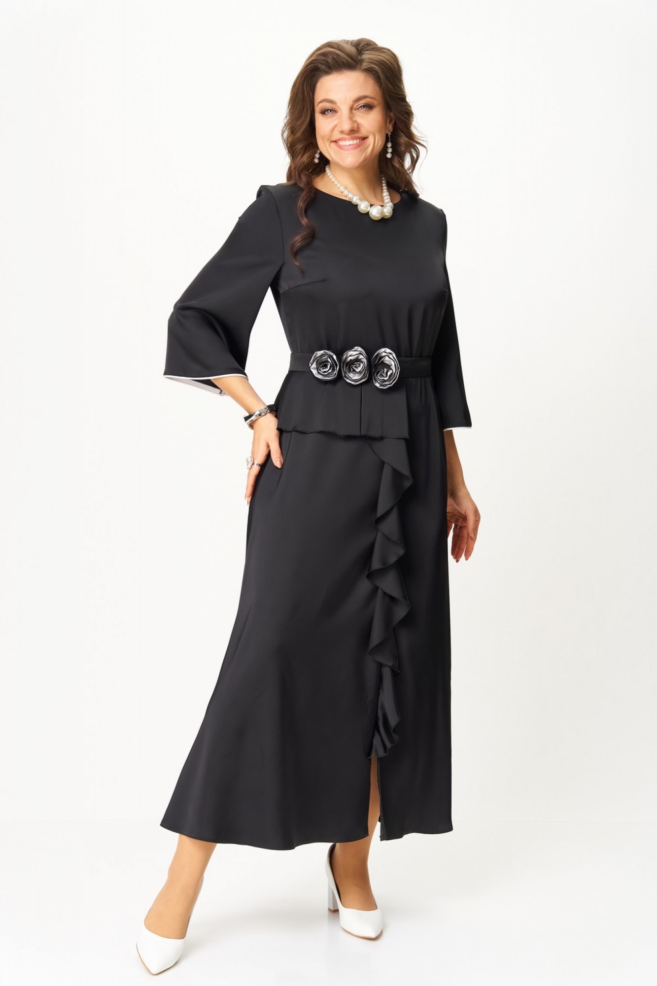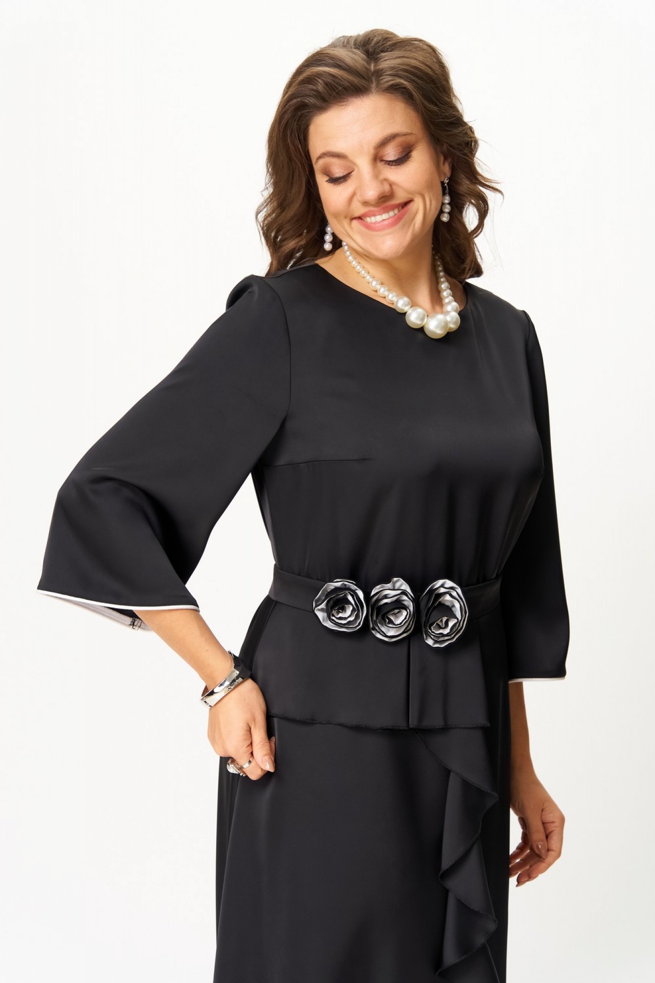 Платье женское вечернее полуприлегающего силуэта с втачным рукавом. Горловины округлой формы. По линии груди вытачки. Застежка на потайную молнию в левом боковом шве. Платье отрезное по линии талии, нижняя часть расклешенная. Нижняя часть переда оформлена воланом, переходящим в шов по переду, что добавляет романтичности и легкости. Нижняя часть спинки со средним швом. Рукав длиной 7/8 расширен к низу с отделкой кантом. По линии талии съемный пояс с украшением ручной работы в виде роз. Такое платье отлично подойдет как для вечернего выхода, так и для более формальных событий.
