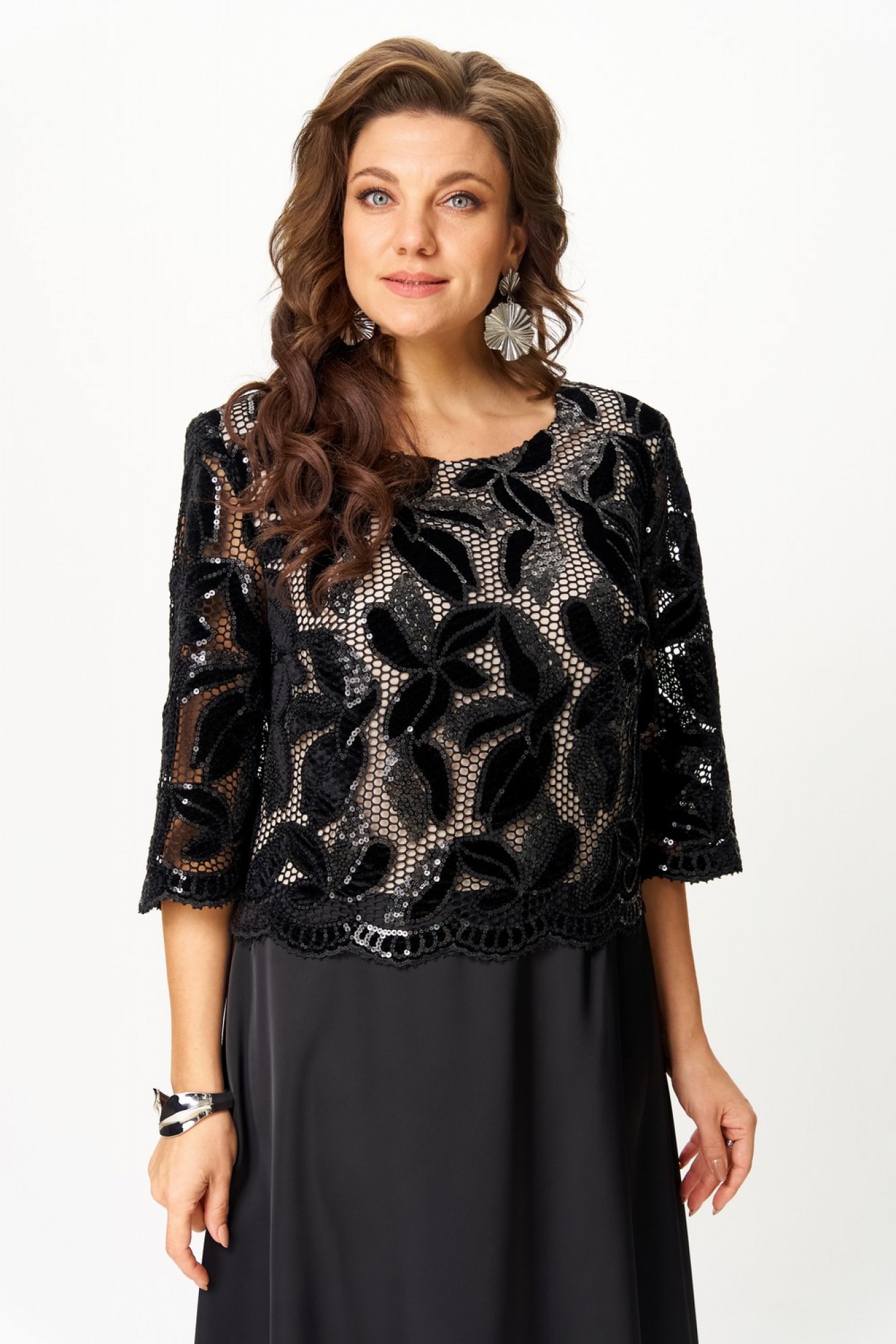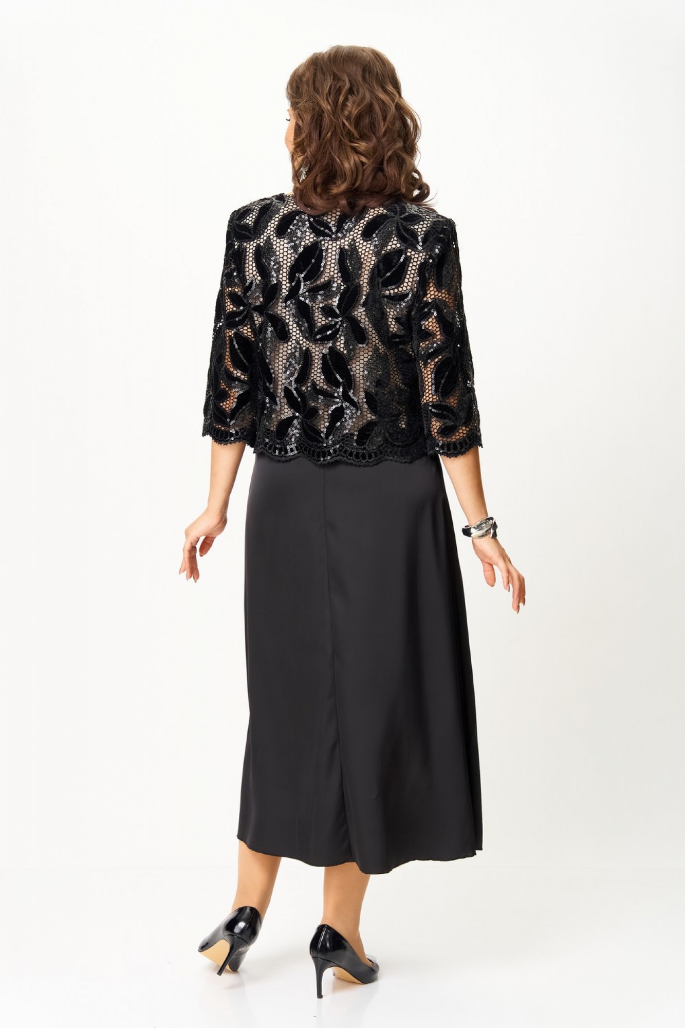 Платье женское полуприлегающего силуэта с расширением понизу. Платье выполнено как имитация комплекта. Верхняя часть платья из кружева на трикотажной подкладке, нижняя часть из атласа «Армани». По линии груди вытачки. Втачные рукава длиной ¾, добавляют романтичности и легкости. Такое платье отлично подойдет как для вечернего выхода, так и для более формальных событий.