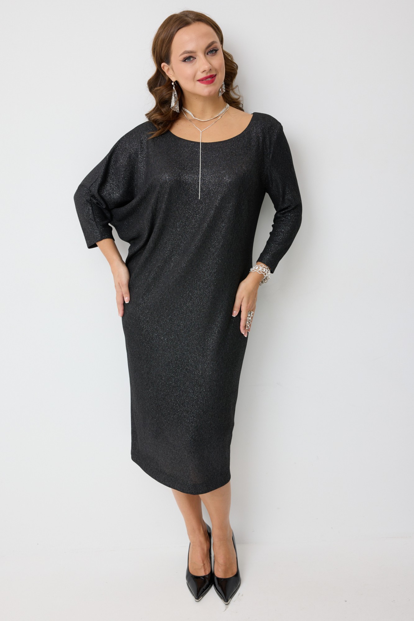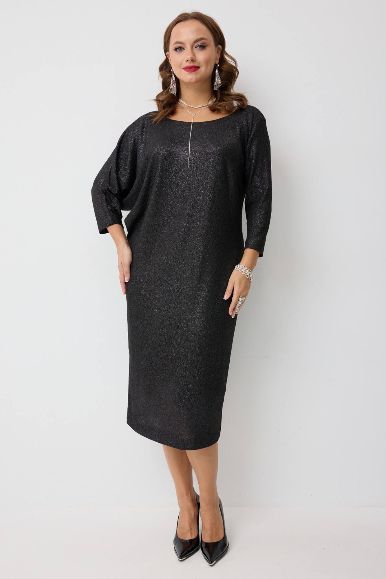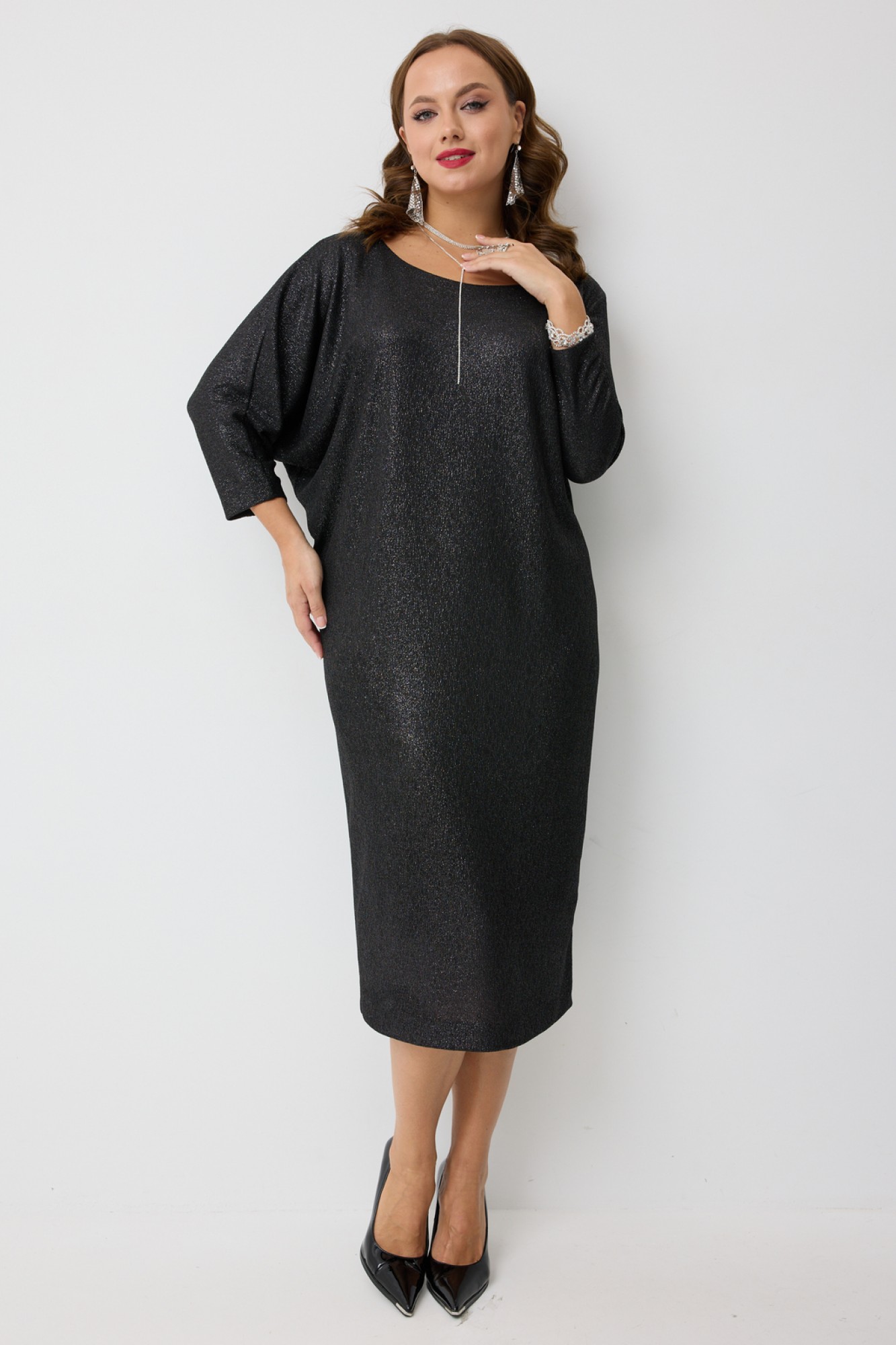 Платье полуприлегающего силуэта комбинированного покроя, выполненное из трикотажного полотна с люрексом. Горловина по переду оформлена в форме""лодочка"", по спинке - аккуратный V- образный вырез. Один из рукавов втачной, другой формы"" летучая мышь"", длиной 3/4.
