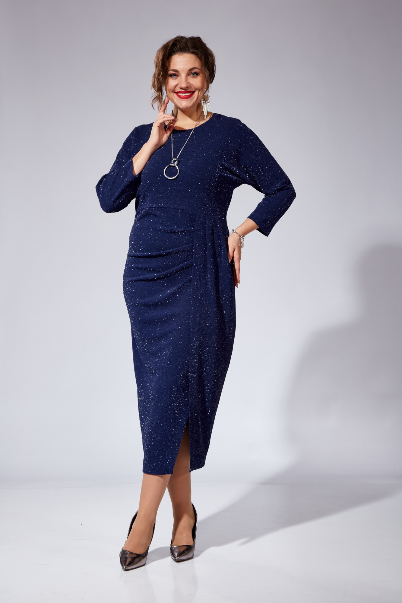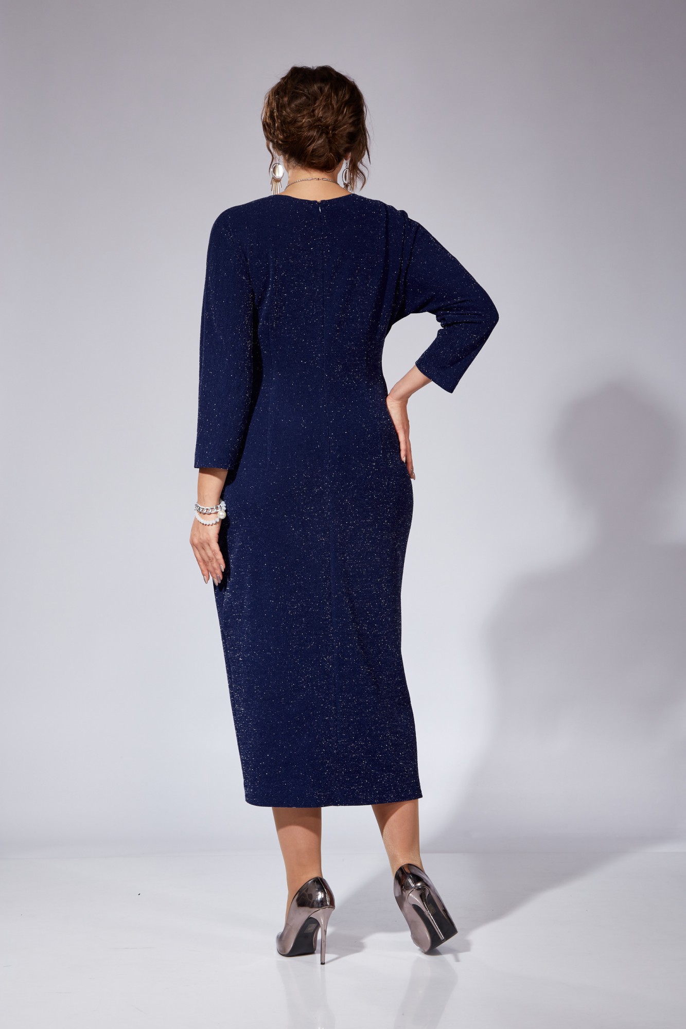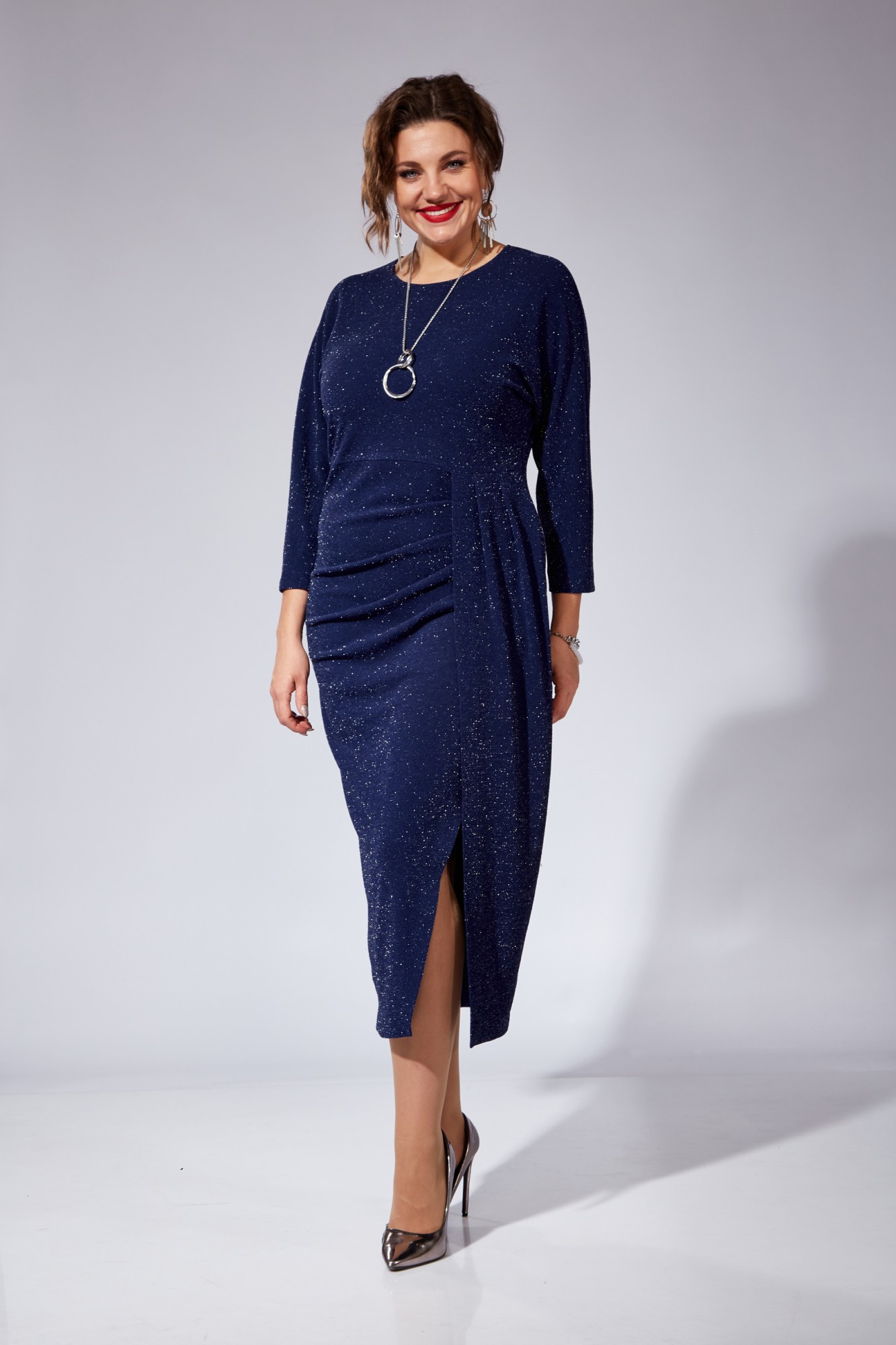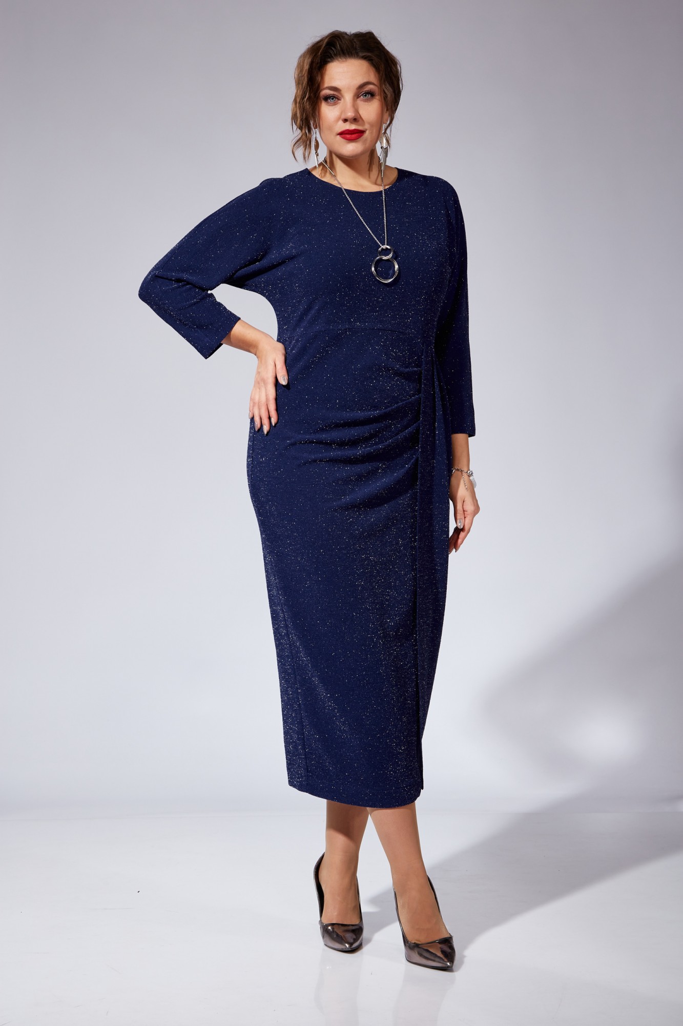 Платье женское полуприлегающего силуэта, с цельнокроеным рукавом типа "летучая мышь" длиной 3/4. Горловина округлой формы. Перед отрезной по линии талии. Нижняя часть переда состоит из двух частей создающих эффект запаха. Нижние части переда выполнены с художественно-декоративными складками и драпировками. Застежка в среднем шве спинки на потайную тесьму-молнию. В комплект платья входит декоративная подвеска.
