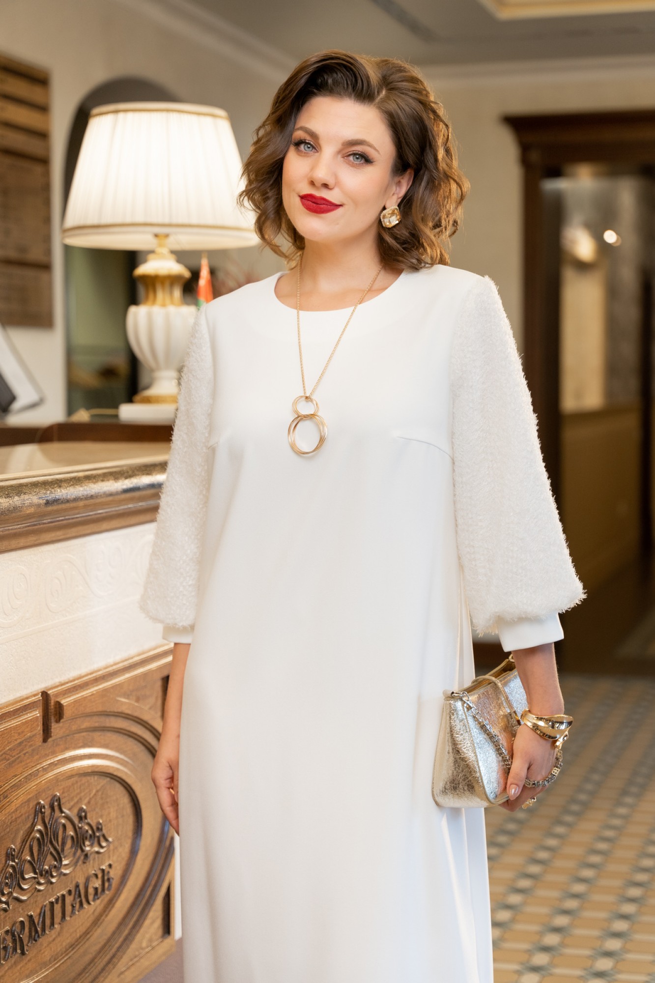 Платье А-образного силуэта с естественной линией плеча. Спинка со средним швом и застежкой на молнию. Перед с нагрудными вытачками. Вырез горловины округлой формы. Рукав втачной одношовный длиной 3/4 из отделочной ткани "реснички" типа "баллон" с манжетой по низу. В комплект к платью входит декоративная подвеска.