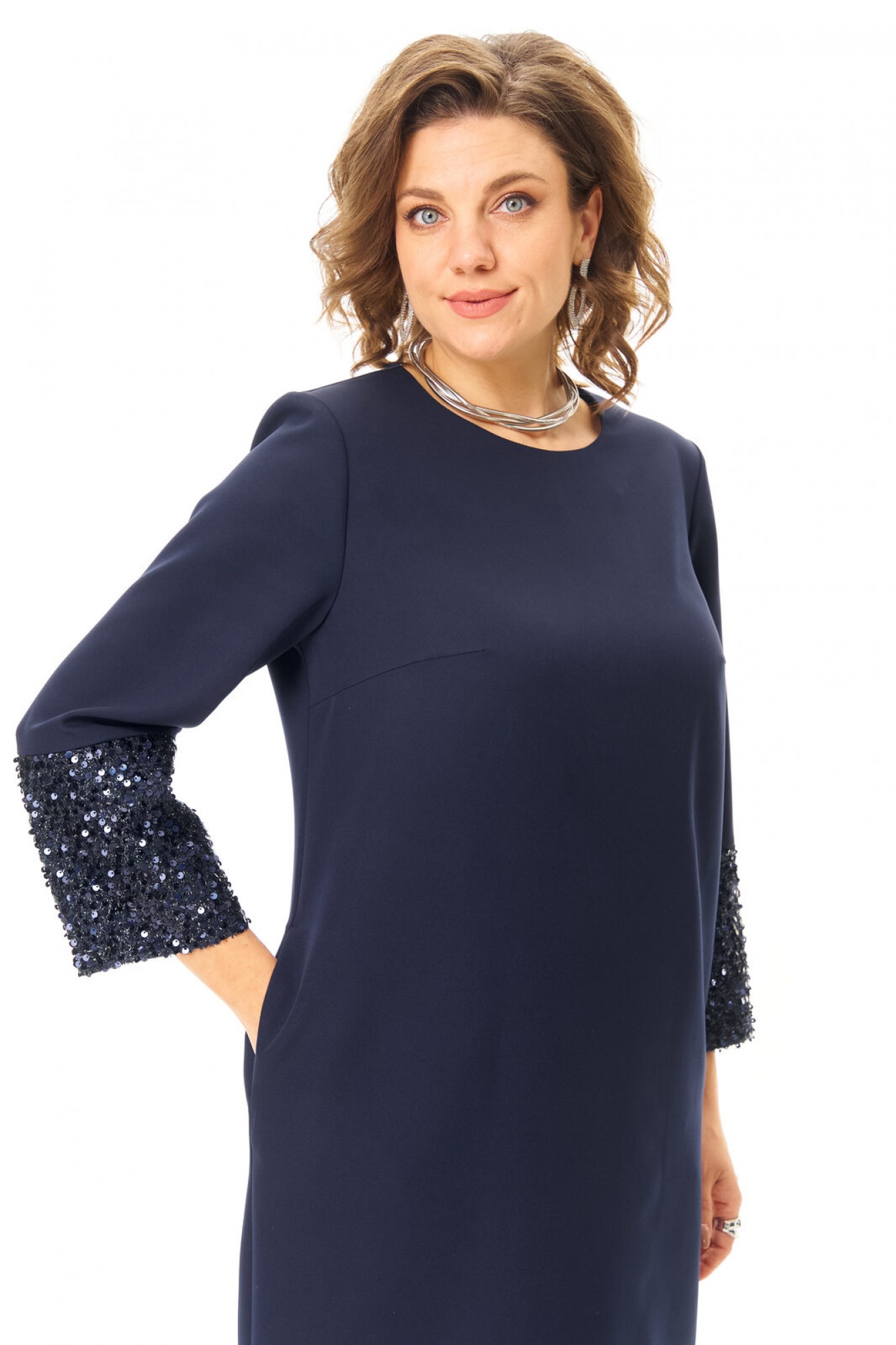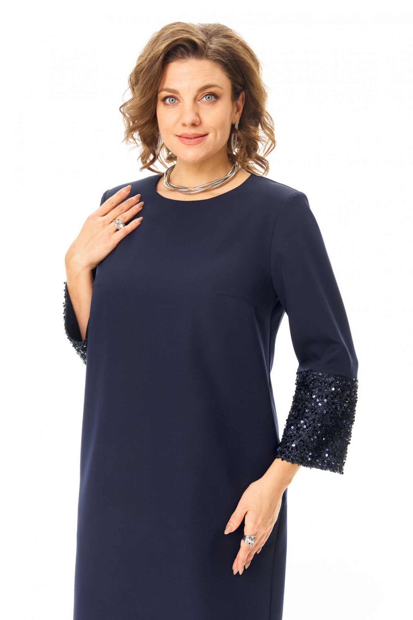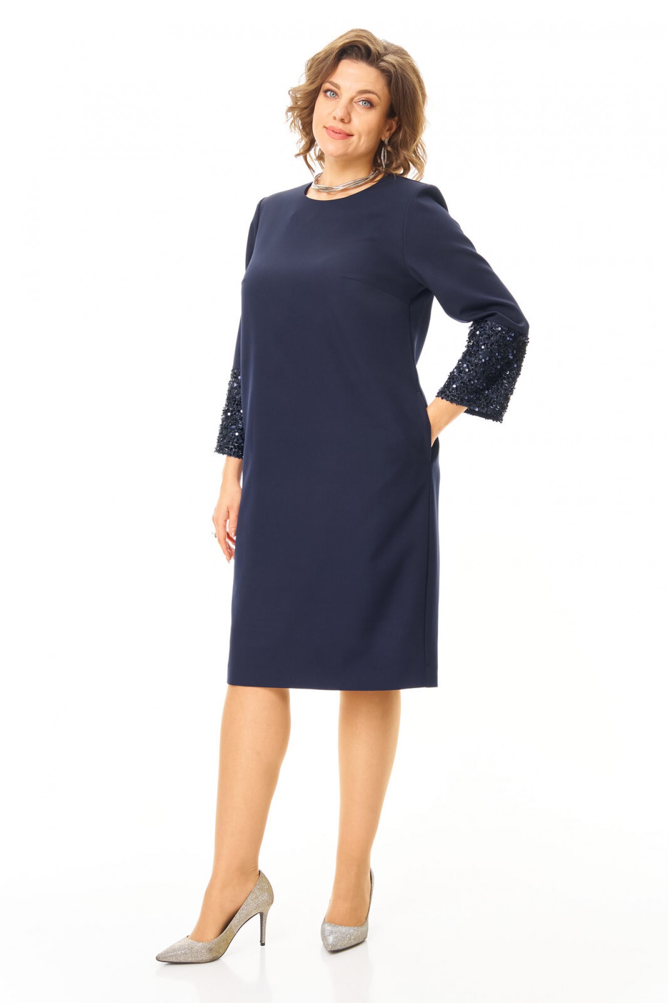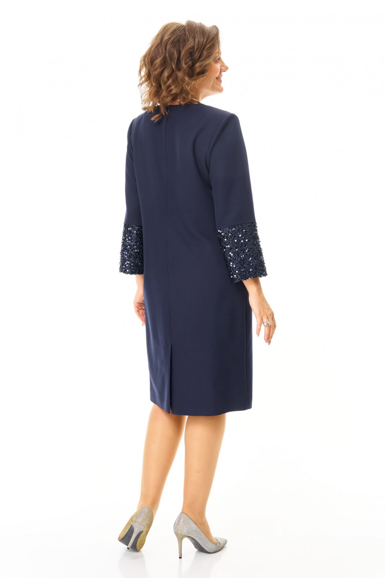 Платье прямого силуэта с естественной линией плеча. Спинка со средним швом и застежкой на молнию. В среднем шве спинки выполнена шлица. Перед с нагрудными вытачками. Вырез горловины округлой формы. Рукав втачной одношовный длиной 5/8.Низ рукава обработан манжетой и ткани с пайетками. В боковых швах обработаны карманы.