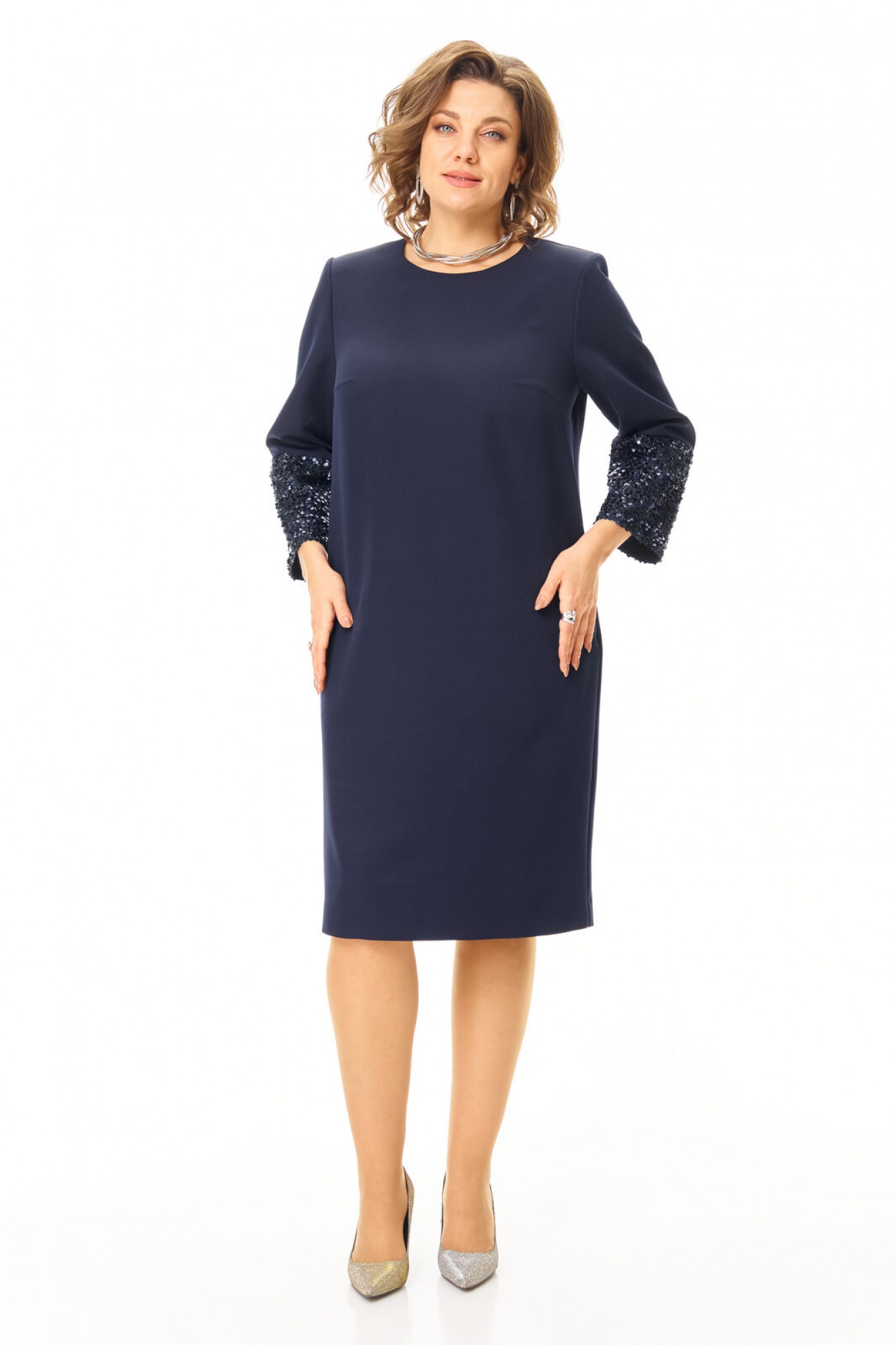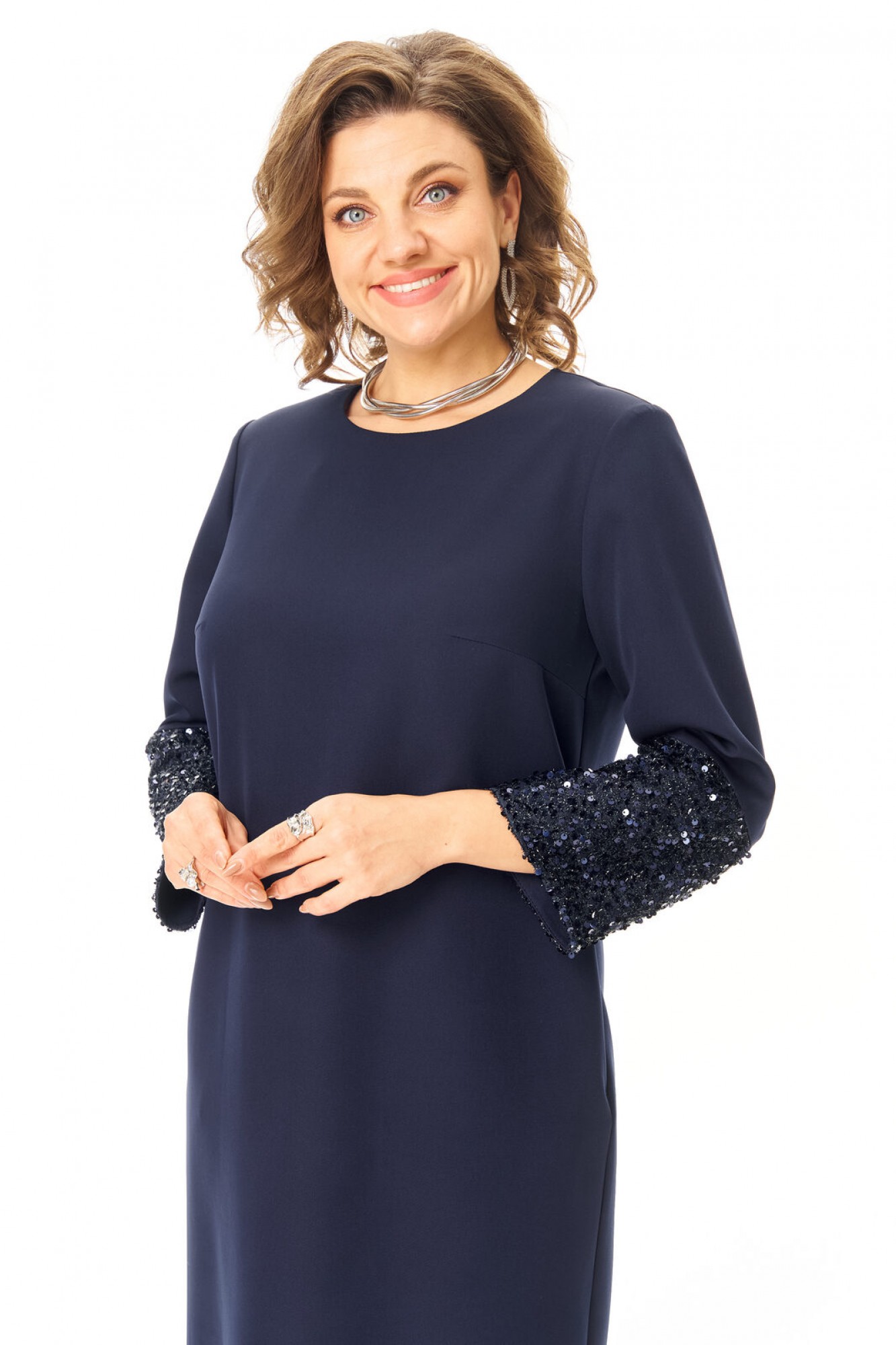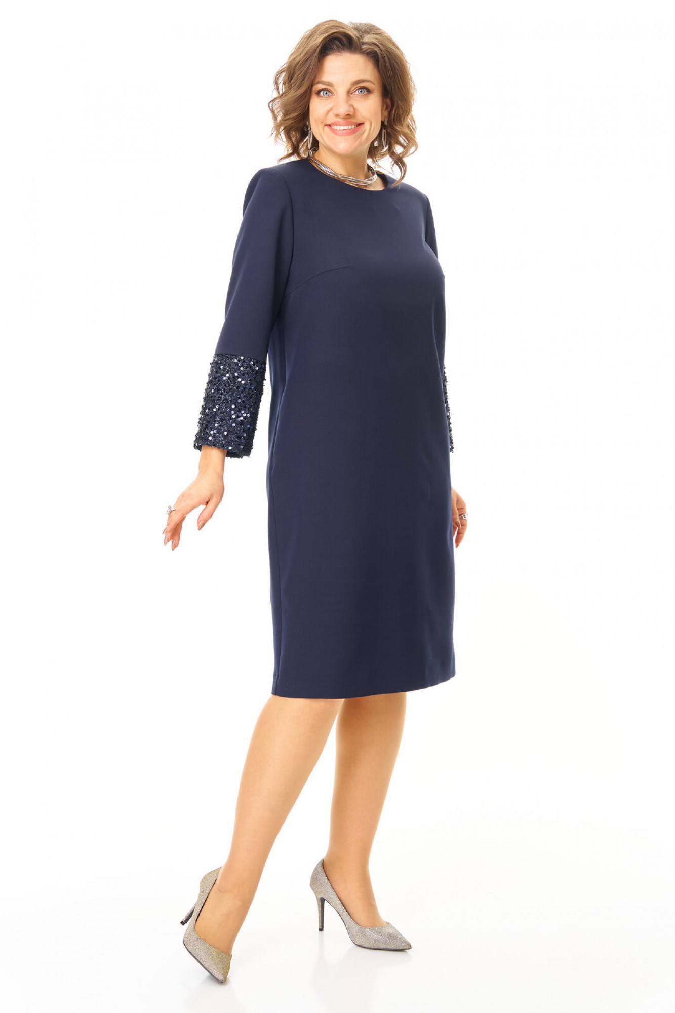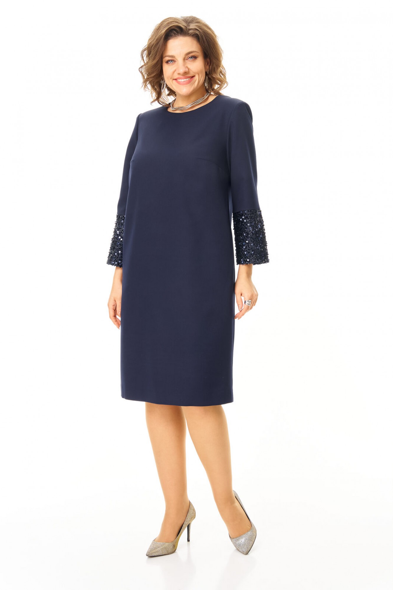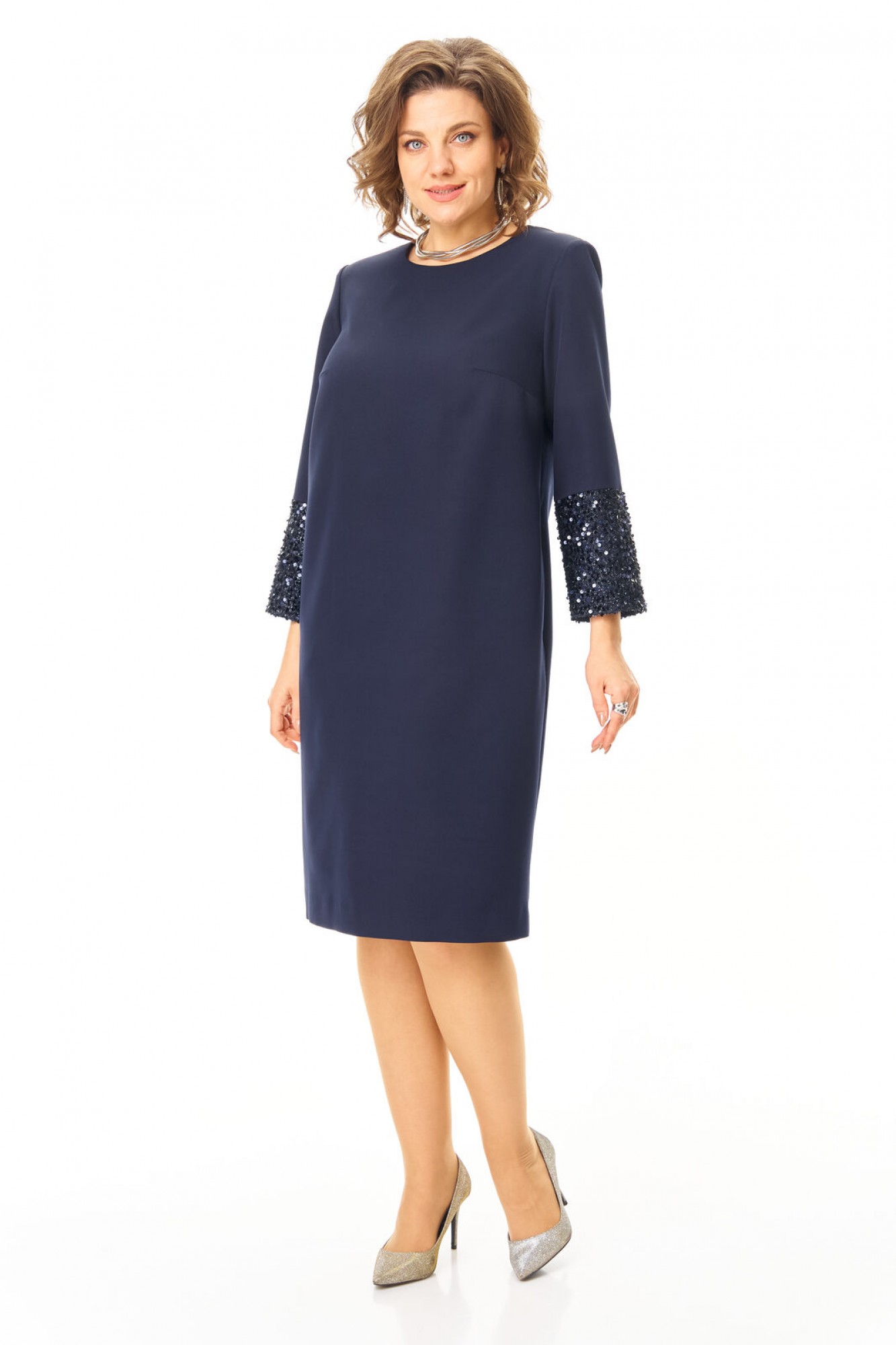 Платье прямого силуэта с естественной линией плеча. Спинка со средним швом и застежкой на молнию. В среднем шве спинки выполнена шлица. Перед с нагрудными вытачками. Вырез горловины округлой формы. Рукав втачной одношовный длиной 5/8.Низ рукава обработан манжетой и ткани с пайетками. В боковых швах обработаны карманы.