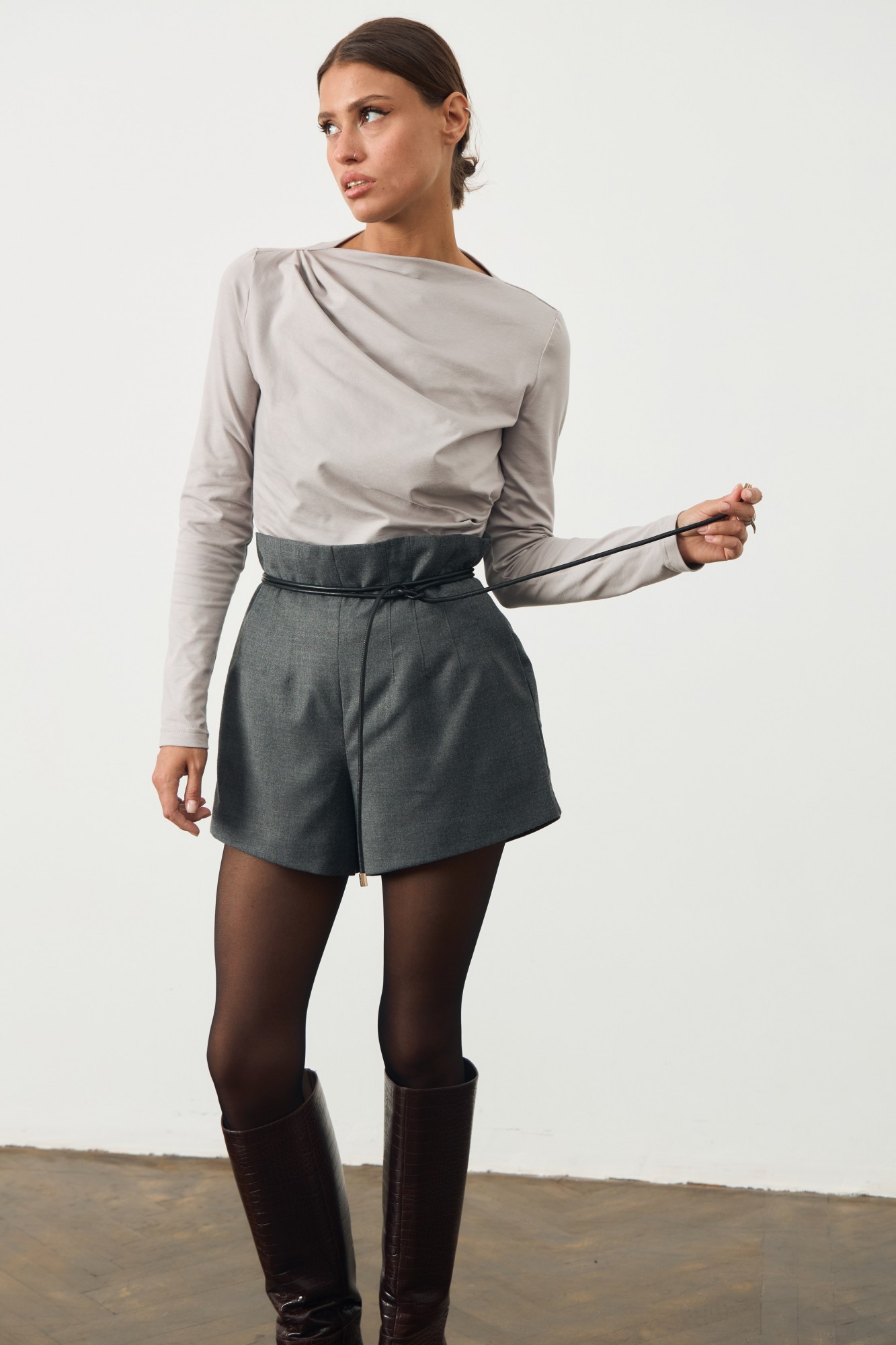 Шорты в длине мини из костюмной ткани. Посадка высокая, по талии декоративные выточки, потайная молния по спинке изделия.