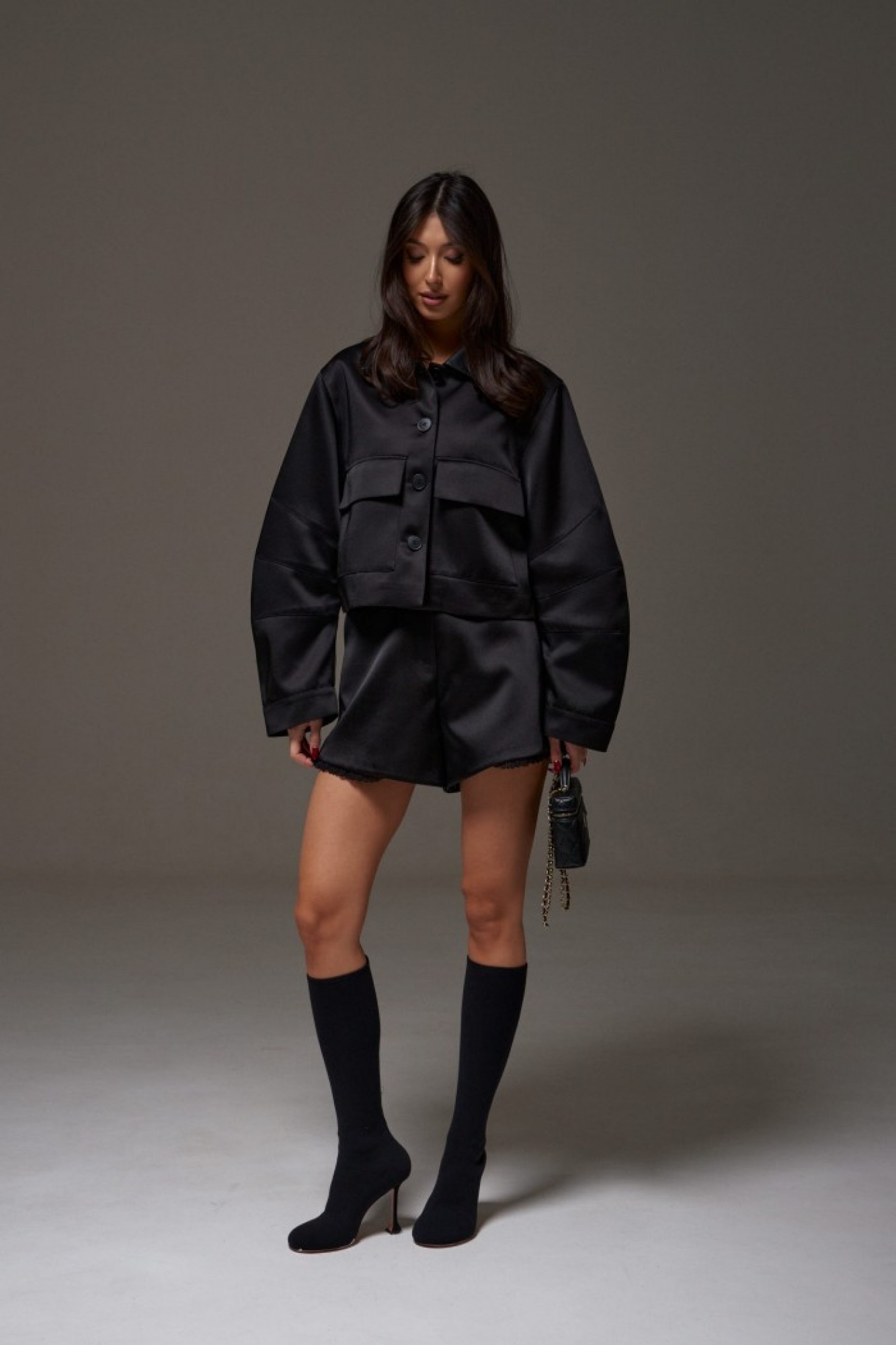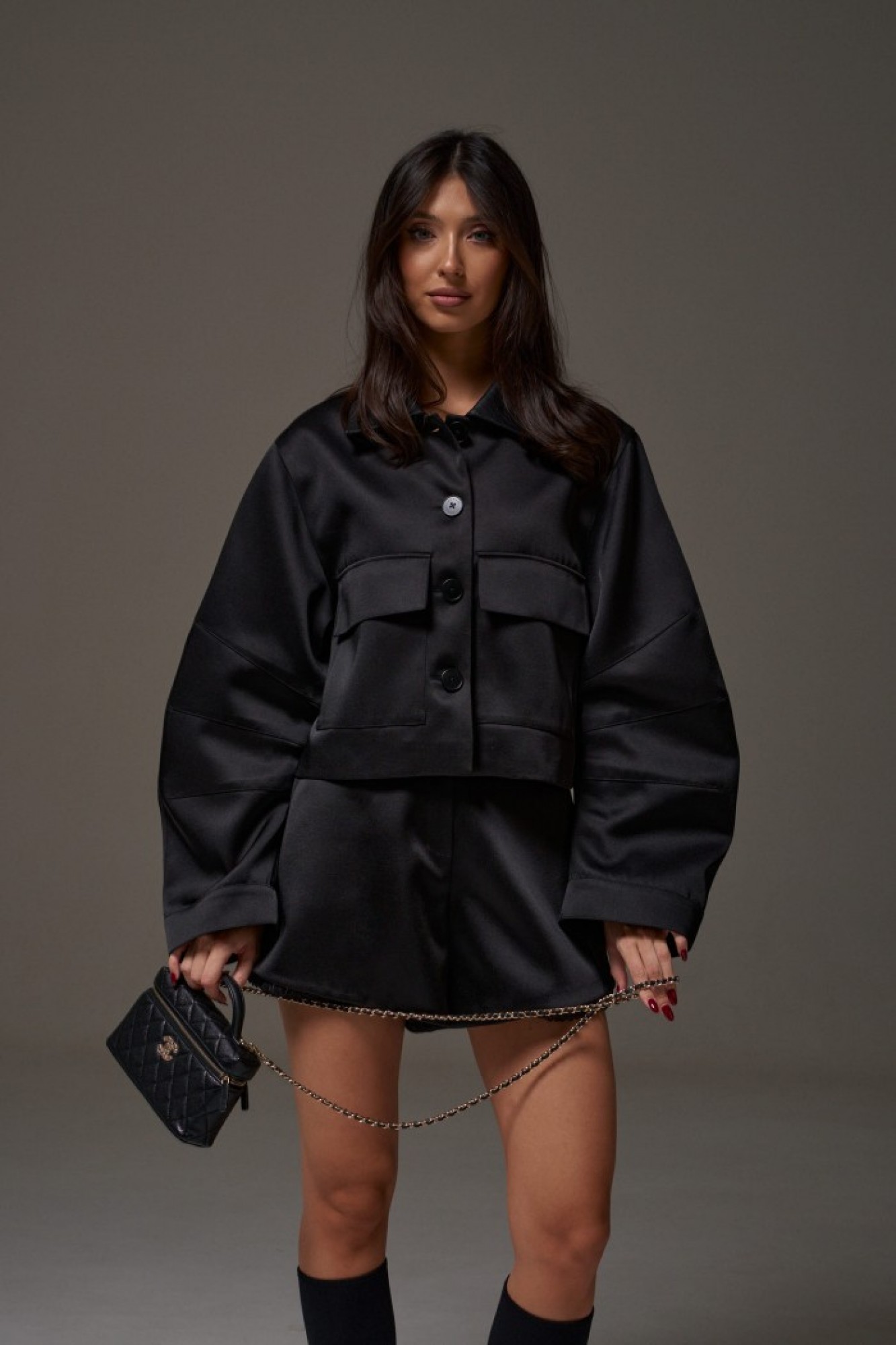 Шорты свободного кроя выполнены из костюмной ткани черного цвета с блеском. Характеристика: стабильный пояс, застёжка молния и петля-пуговица, по низу изделия нашито декоративное кружево черного цвета, в боковых швах карманы, брендированная подкладка.