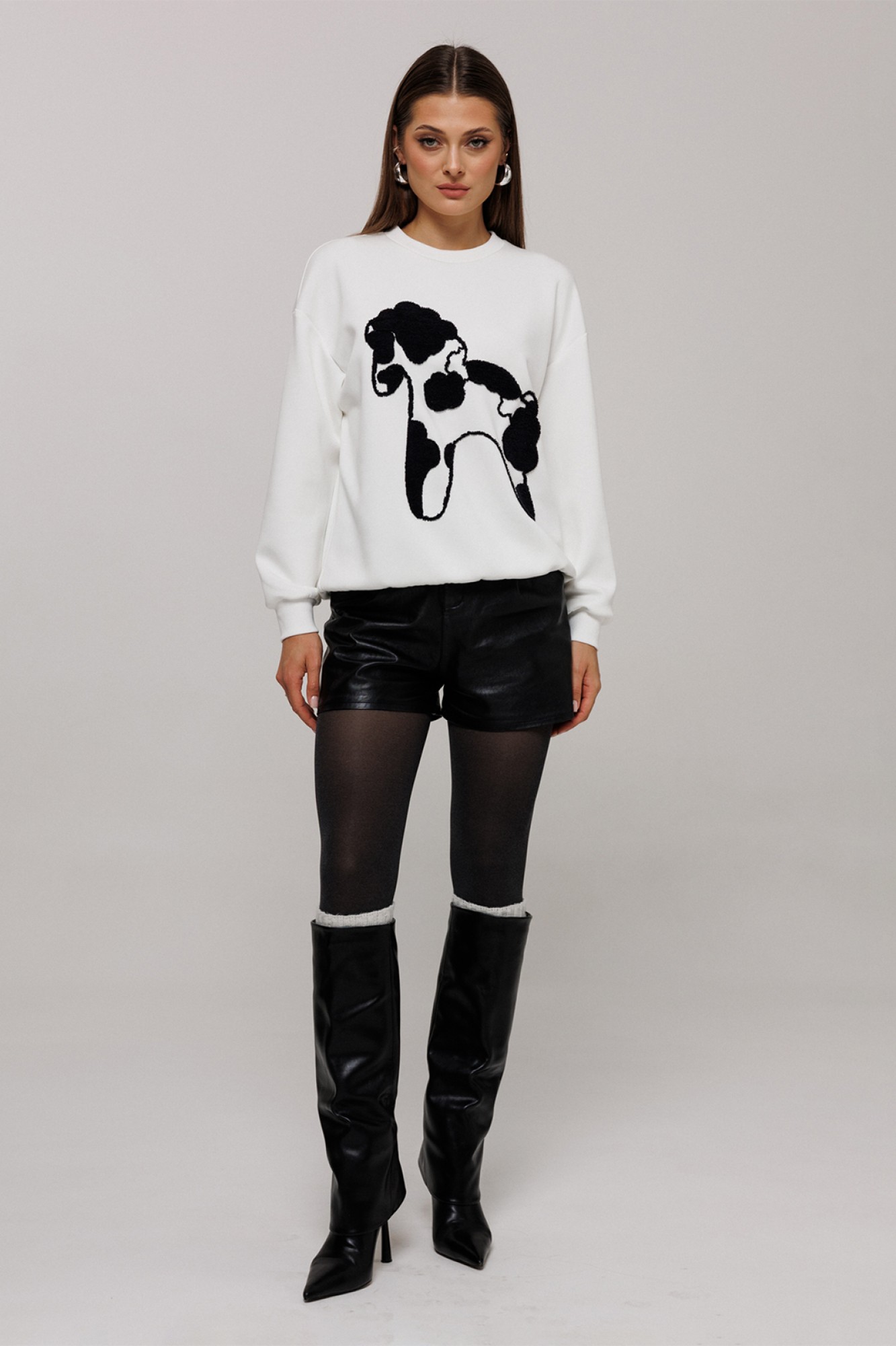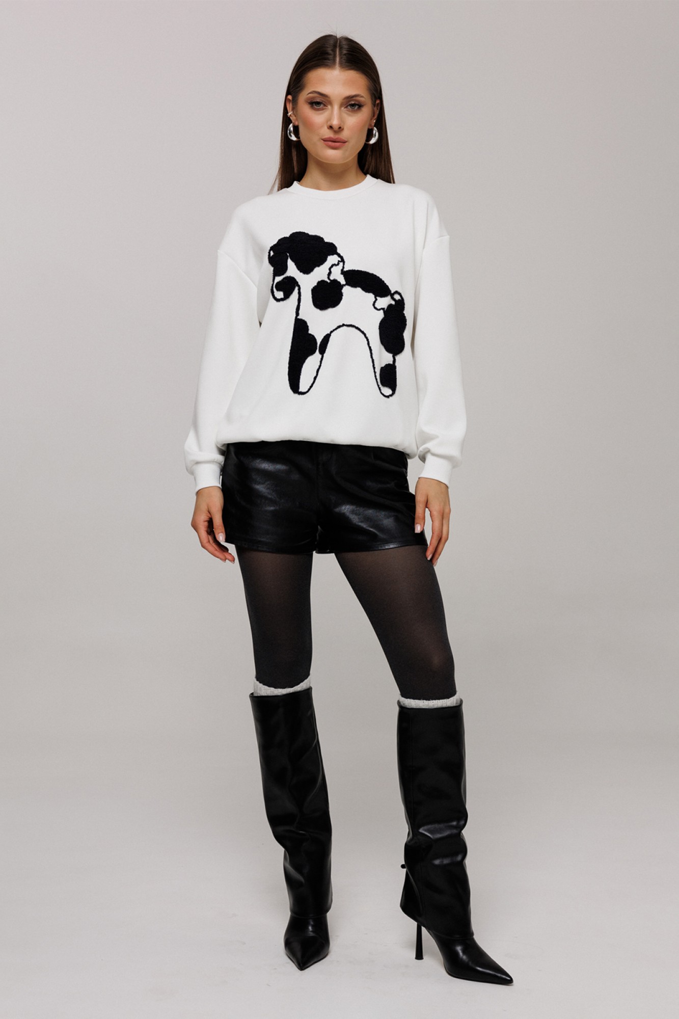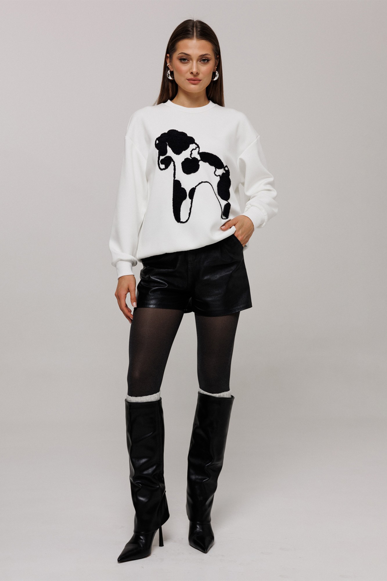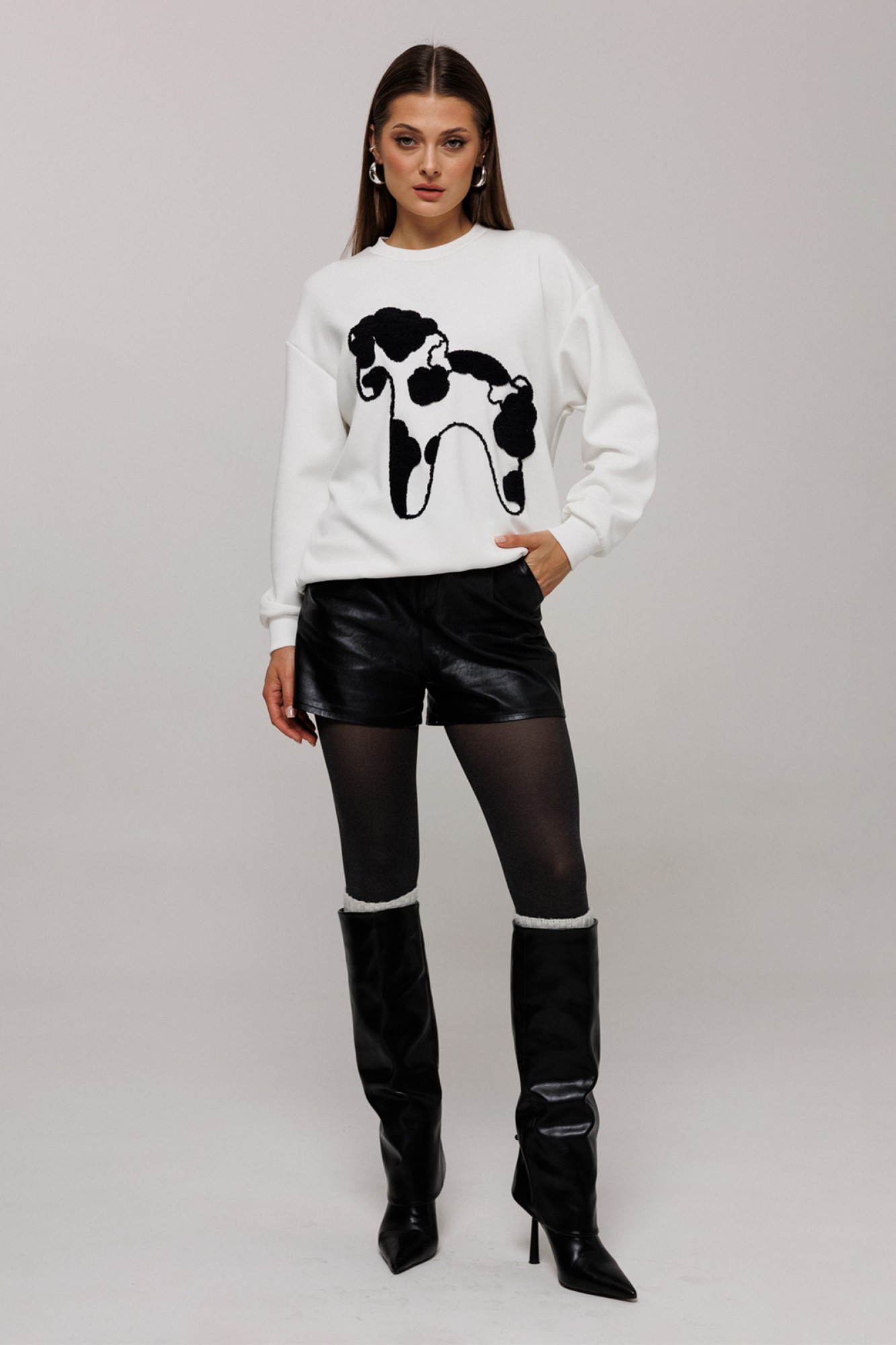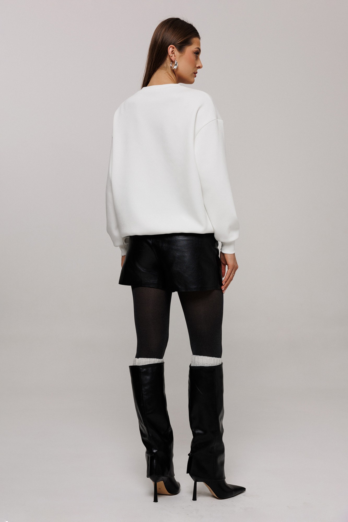 Шорты из эко-кожи короткие на притачном поясе со шлевками и застежкой-гульфик. Пояс застегивается на петлю-пуговицу. Перед со складкой в боковых швах карман с наклонным входом. Спинка с вытачкой от пояса.