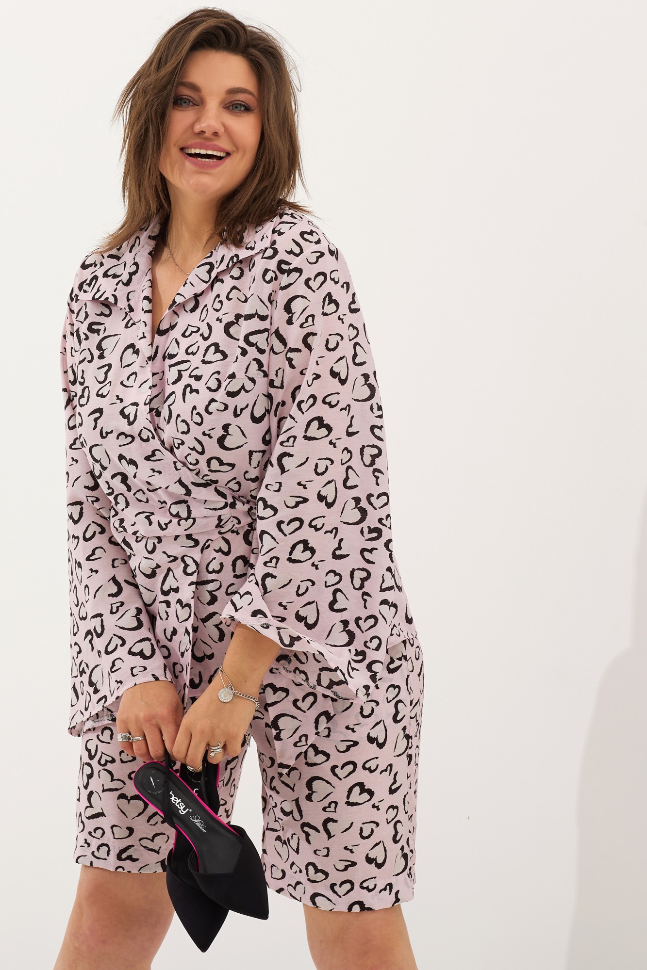 Если Вы ищете стильные, актуальные шорты - эта новинка для Вас! Удивительно комфортная, благодаря высокой посадке и свободному крою модель, просто незаменима в жаркие летние дни. Трендовая расцветка в виде сердец подчеркнёт Вашу индивидуальность, позволяя быть заметнее. Пояс притачной, на эластичной резинке с островком. В боковых швах для удобства - карманы «Хулиганы». Это удобная и летняя модель, подходящая для повседневного ношения и активного отдыха. Шорты можно приобрести в комплекте с блузой, артикул 3062.