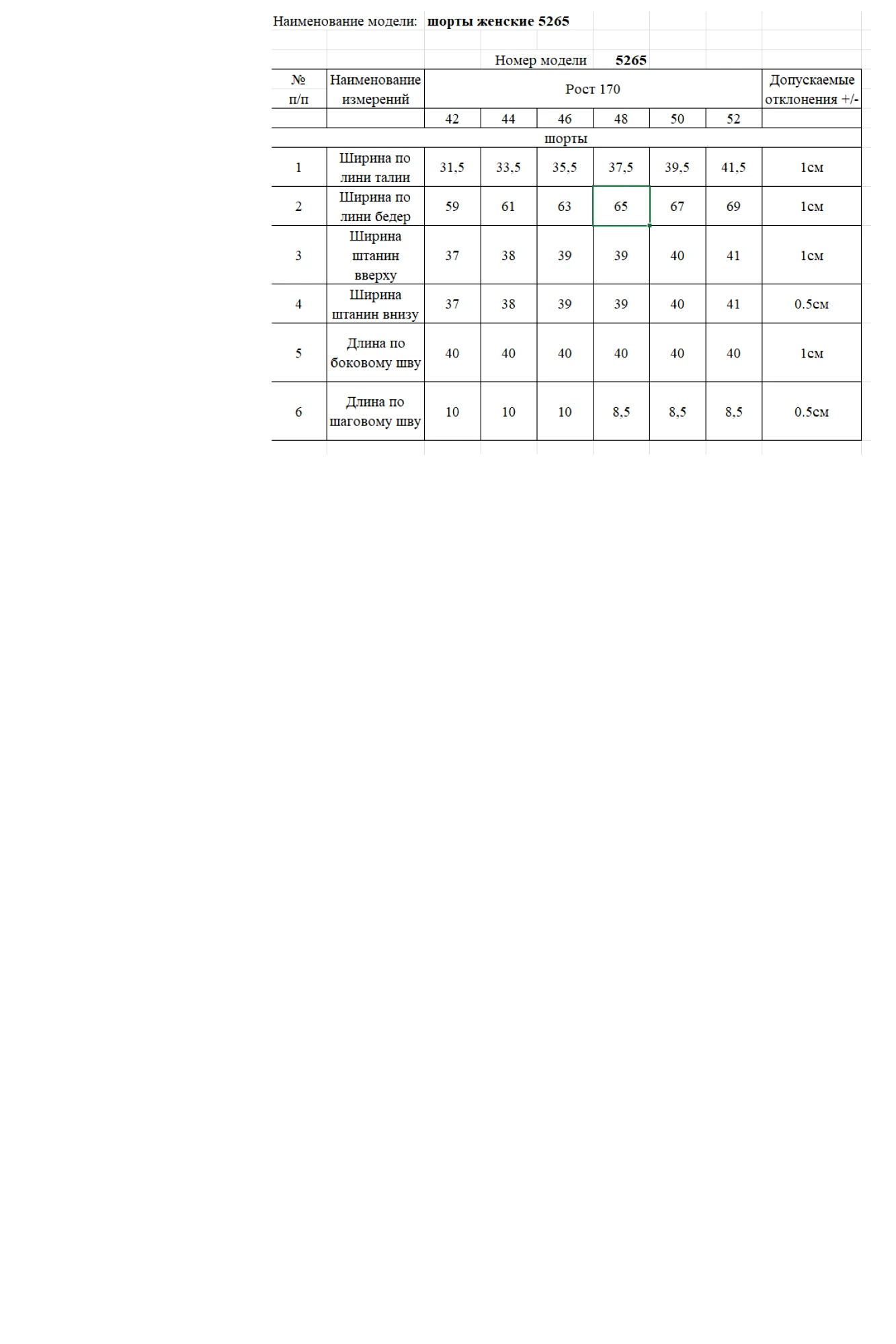 Таблица размеров