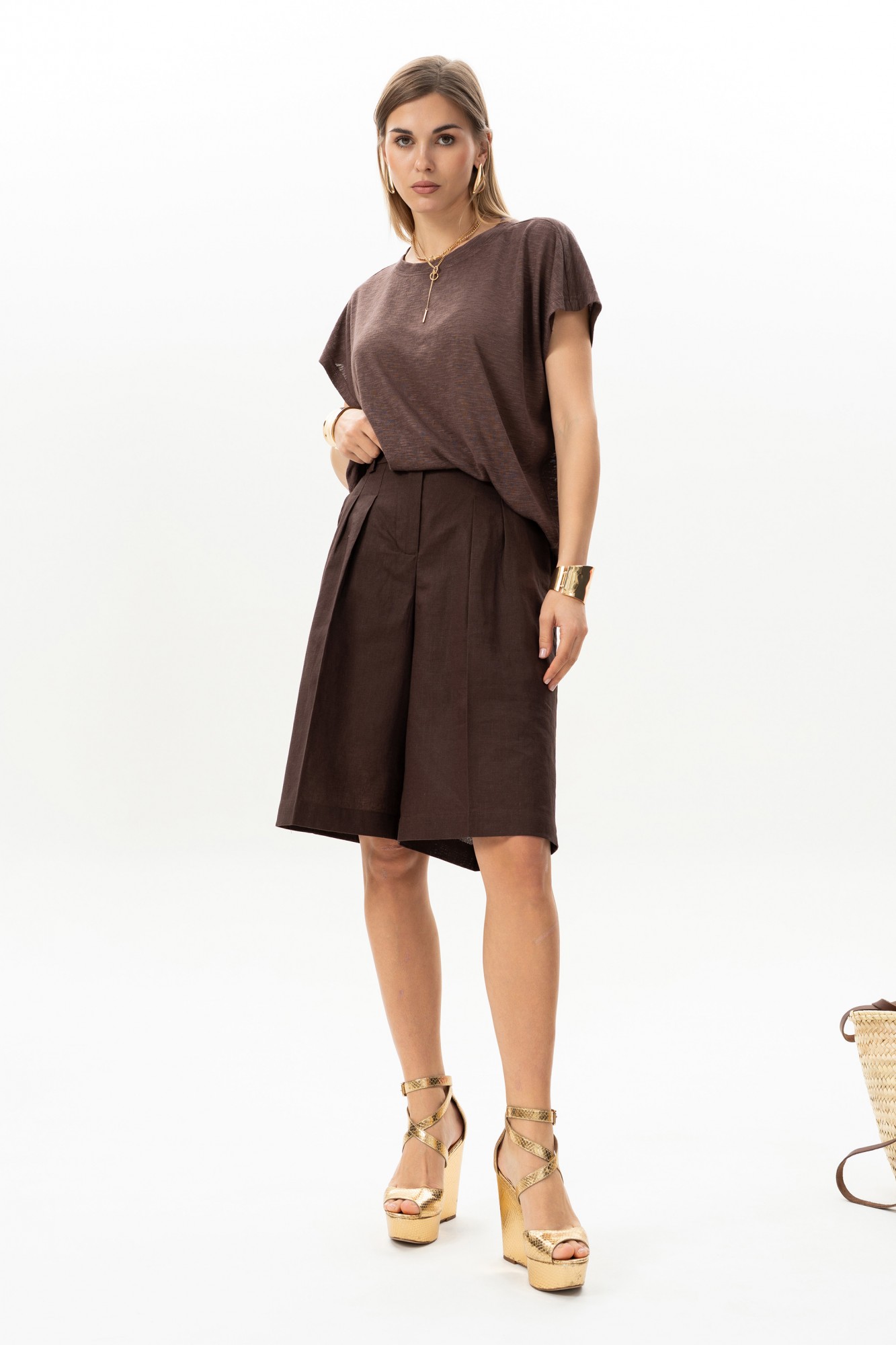 Шорты-бермуды свободного, прямого силуэта. На передних половинках заутюжены стрелки, переходящие в складки по линии талии. Застежка-гульфик, по переду боковые наклонные карманы. Пояс стабильный по переду, по задней части шорт на резинке, с настроченными шлевками и застежкой на пуговичку.