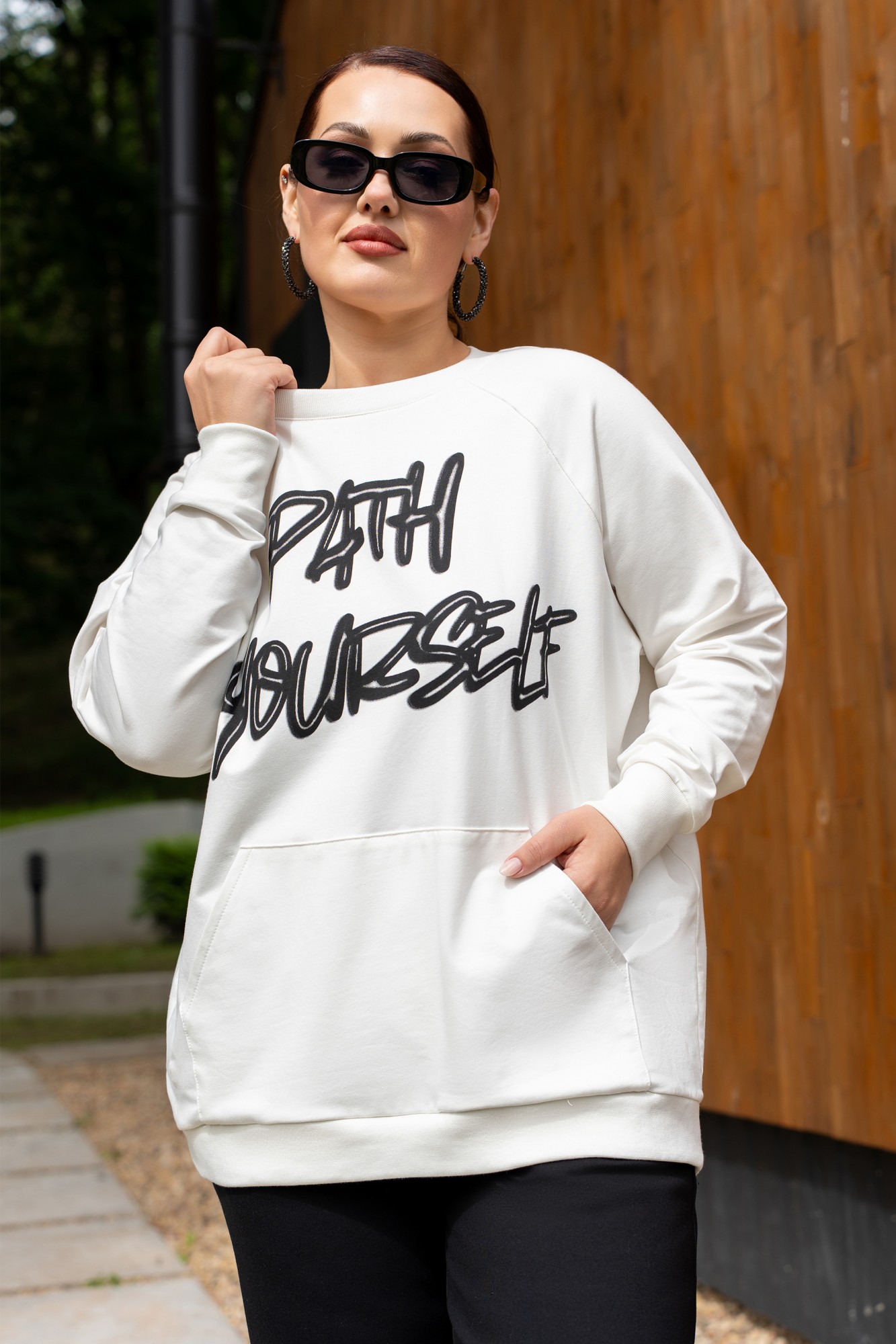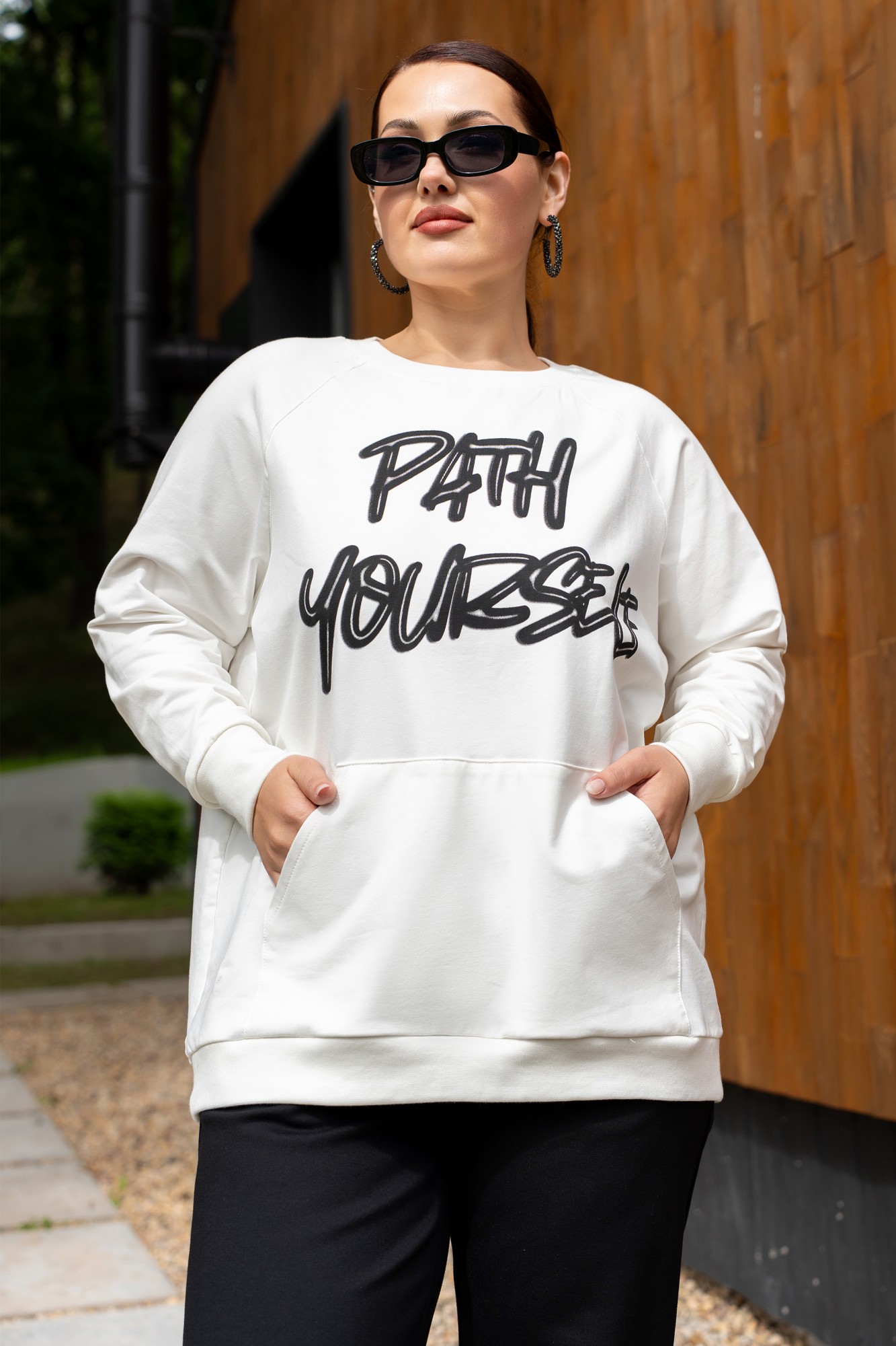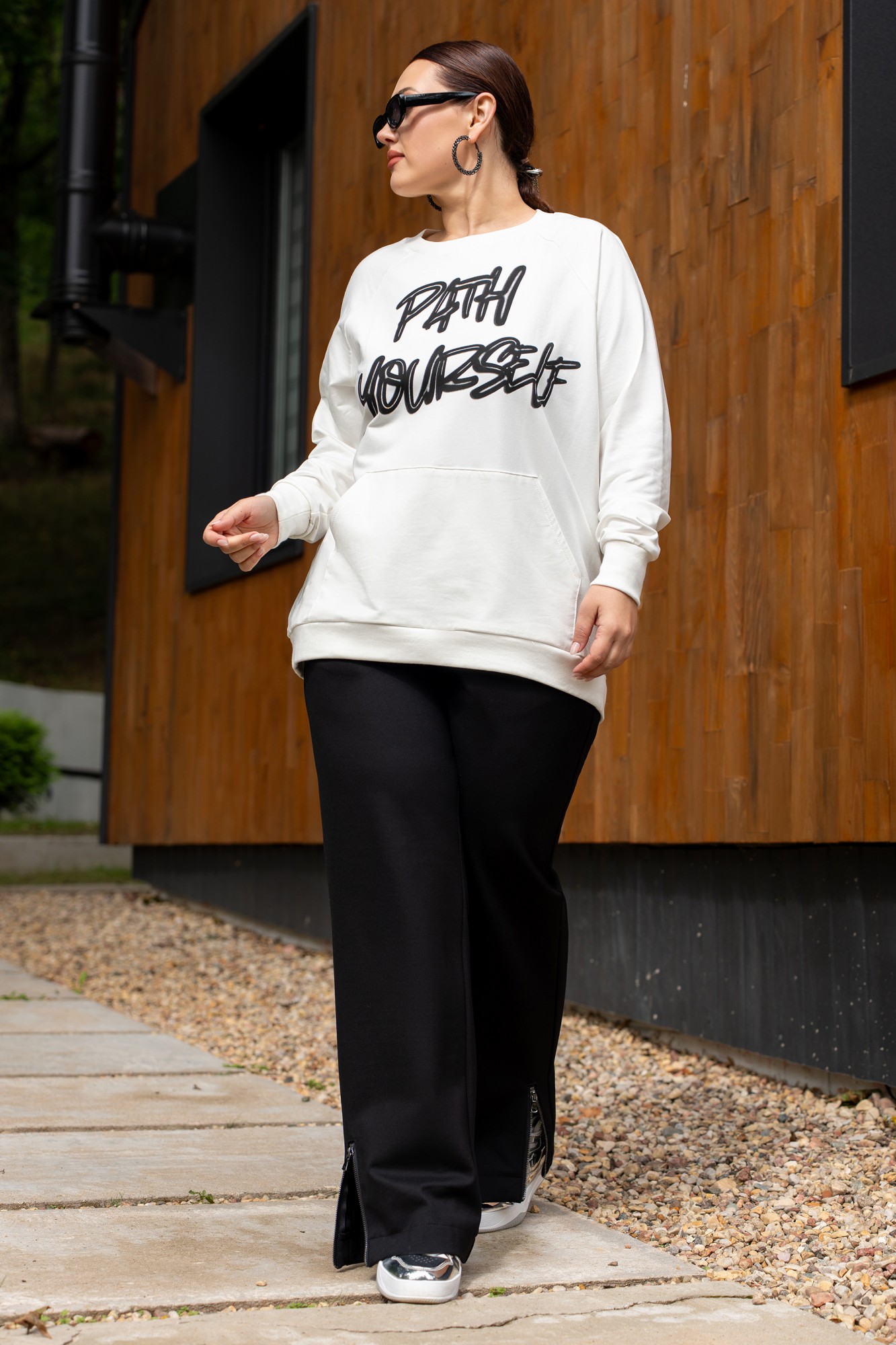 Костюм женский джемпер и брюки из трикотажа. Джемпер прямого кроя с дизайнерской печатью, полочка с накладным карманом. Джемпер с притачными рукавами и манжетами. Брюки женские прямого силуэта, пояс на резинке. Боковые карманы на молниях. По низу брюк обработаны разрезы на молниях.