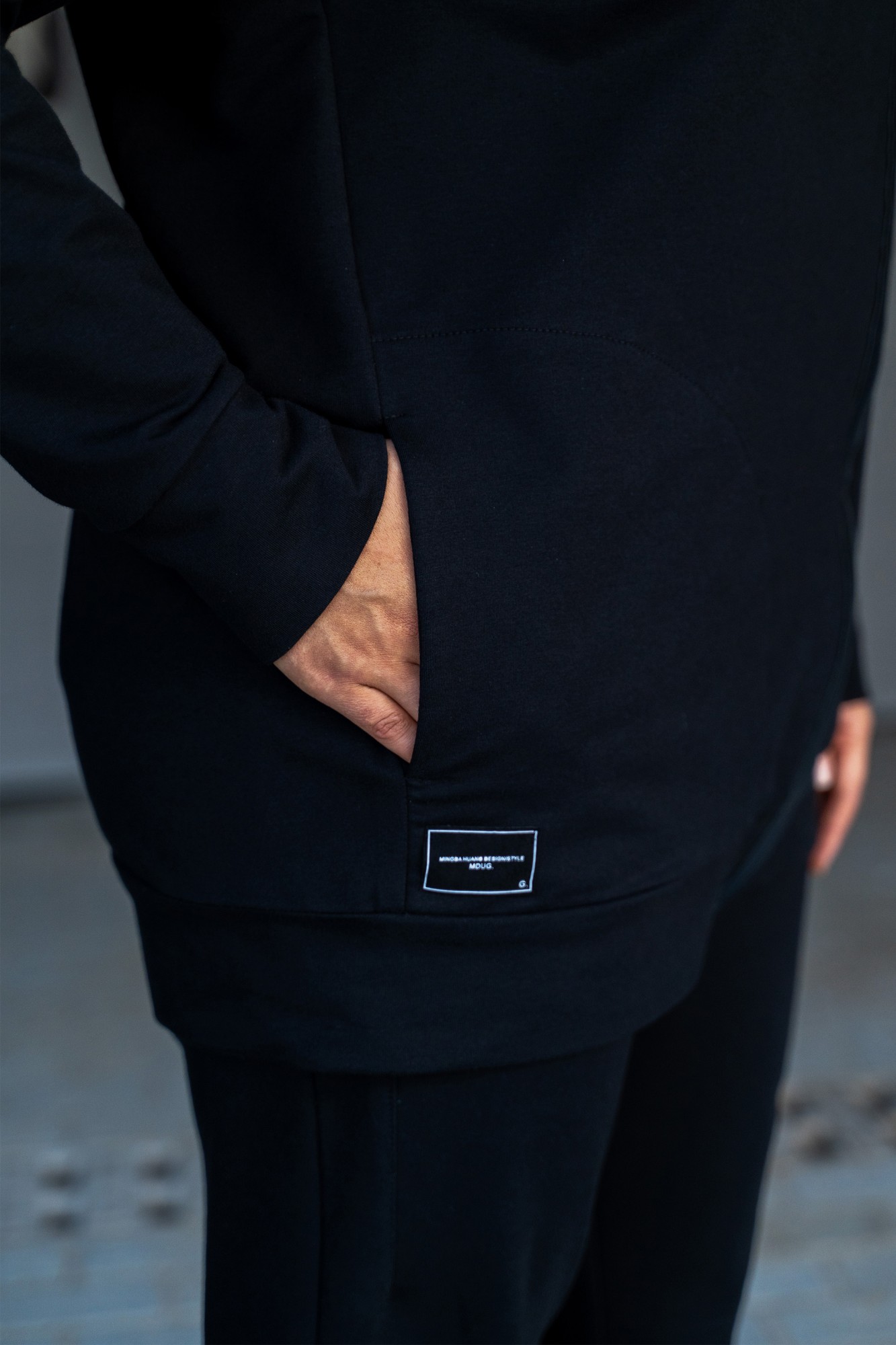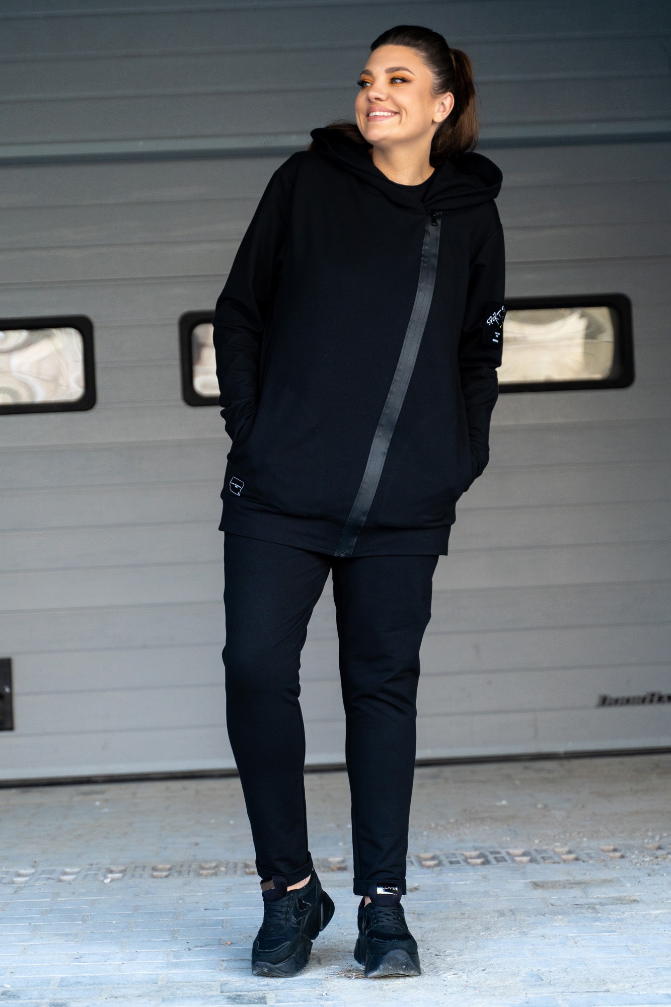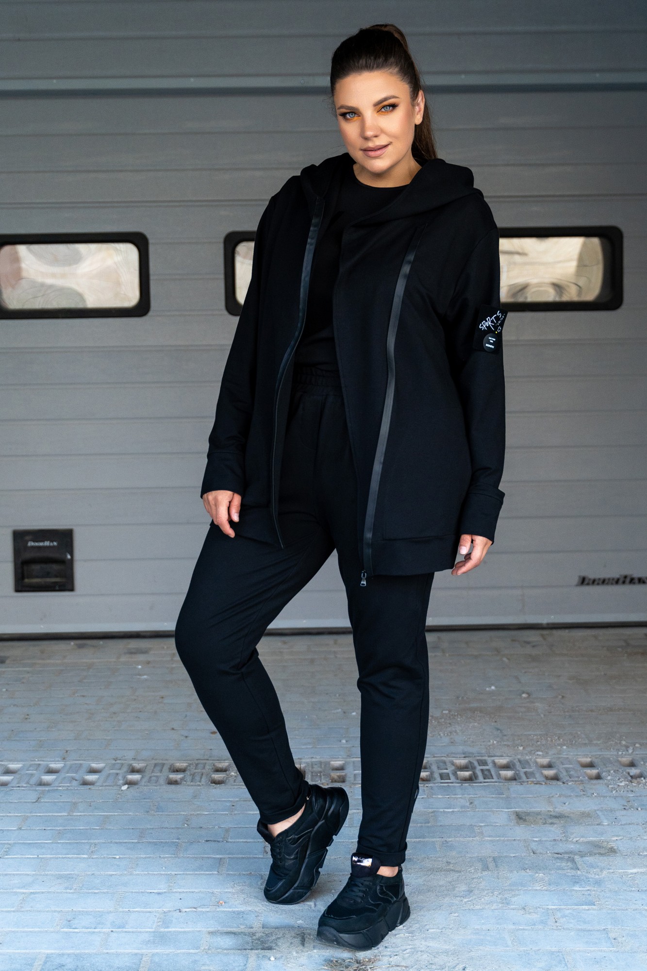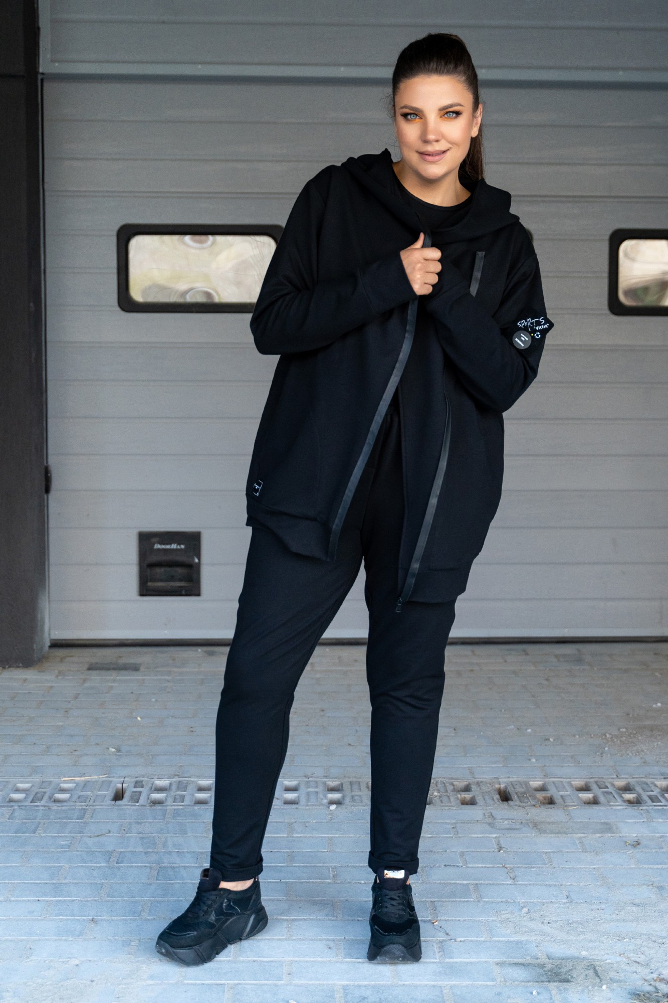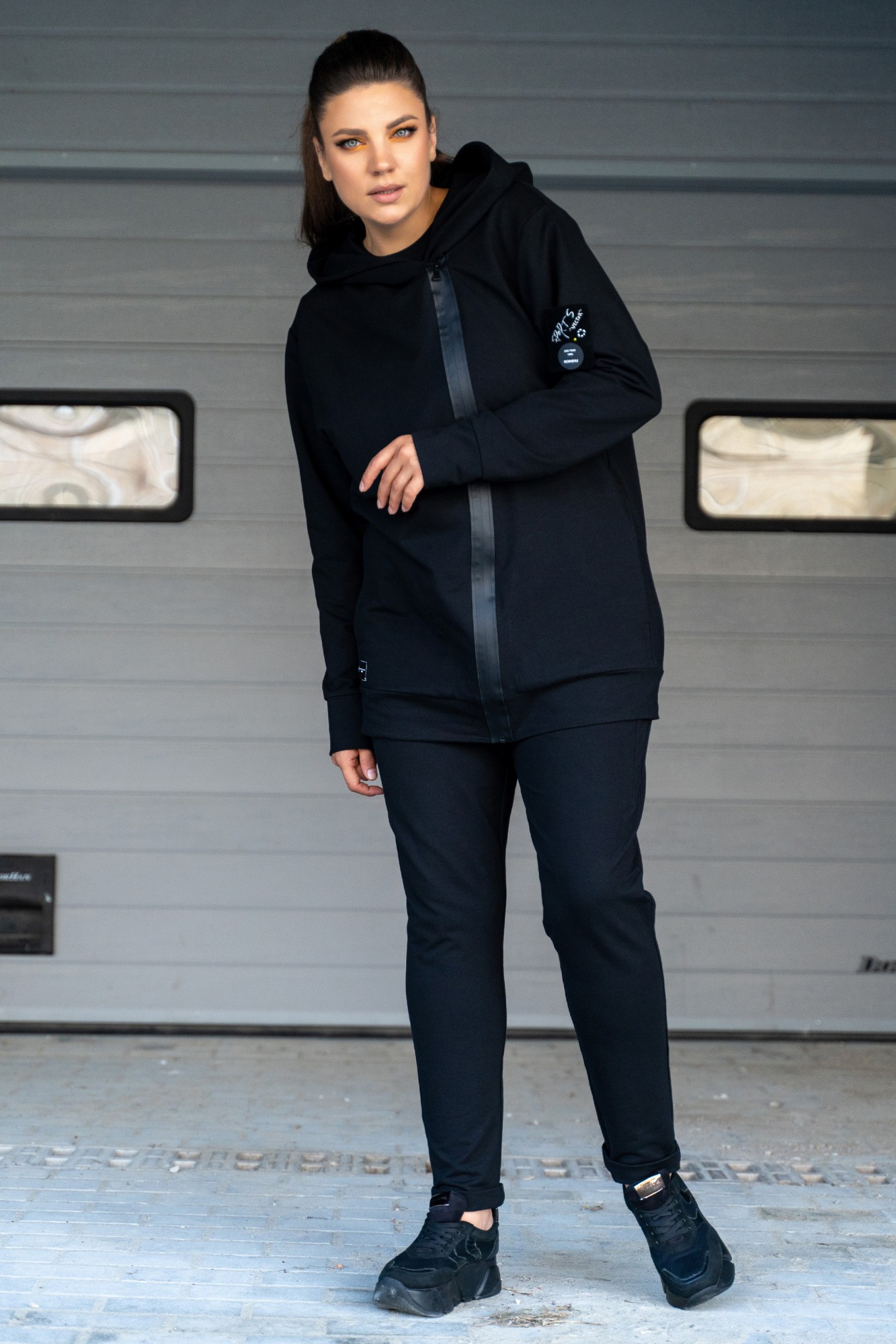 Костюм женский - спортивный, современный, джемпер-косуха и брюки с подрезами и нашивками. Джемпер с асимметричной застёжкой на тесьму-молнию "под кожу", с нашивками на правом кармане и на левом рукаве, с большим капюшоном, с карманами в шах, с втачными рукавами с притачными манжетами, по низу джемпера притачной пояс. Брюки на поясе с резинкой и протяжками с металлическими наконечниками, перед брюк с подрезами, в которых обработаны карманы, задние половинки с отрезными кокетками, и задними карманами. На брюках по низу нашивка и на заднем кармане.