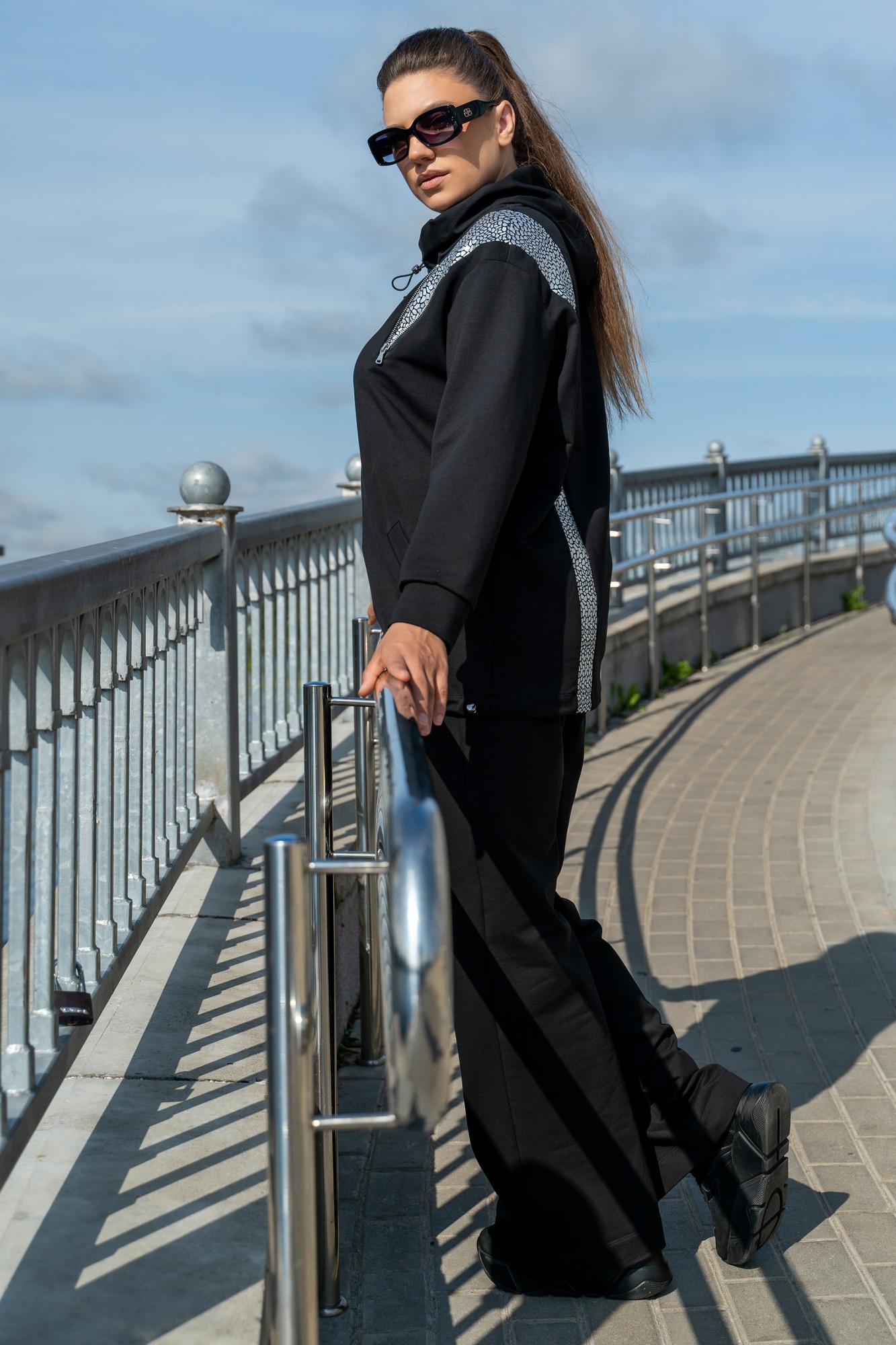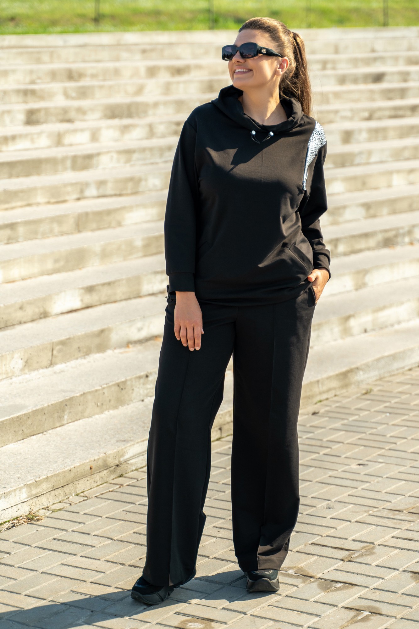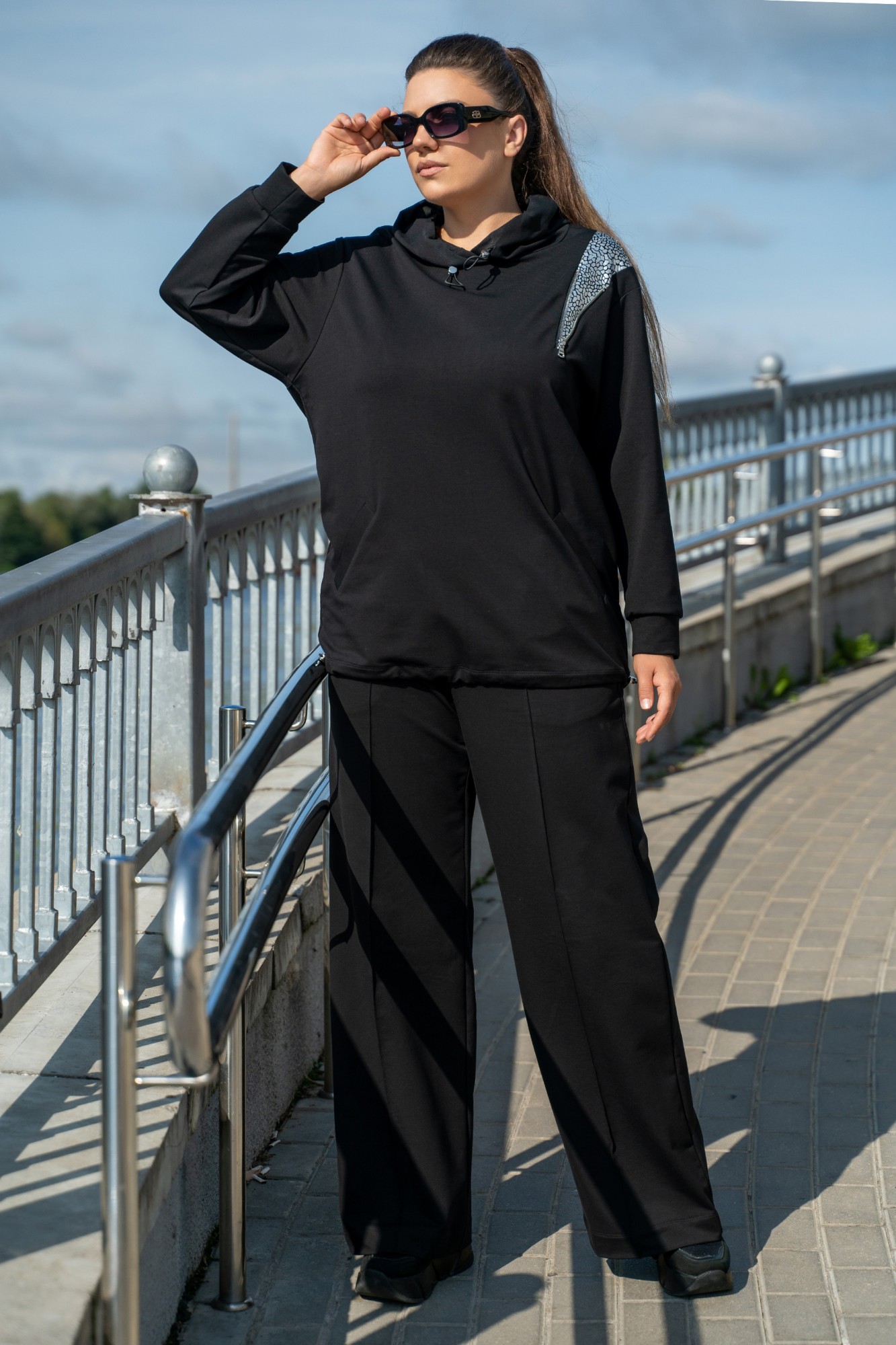 Костюм женский - спортивный, современный, в стиле спорт-шик, джемпер со вставками " под змею серебро". Джемпер с с большим капюшоном с протяжками и металлическими наконечниками, с прорезными карманами с листочками, с втачными рукавами с притачными манжетами, по низу джемпера сс протяжками и металлическими наконечниками. джемпер со вставкой с молнией по полочке и переходящая на спинку. Брюки на поясе с резинкой , в швах боковые карманы.
