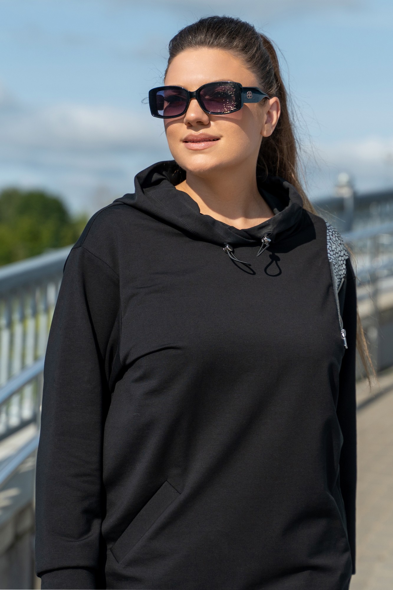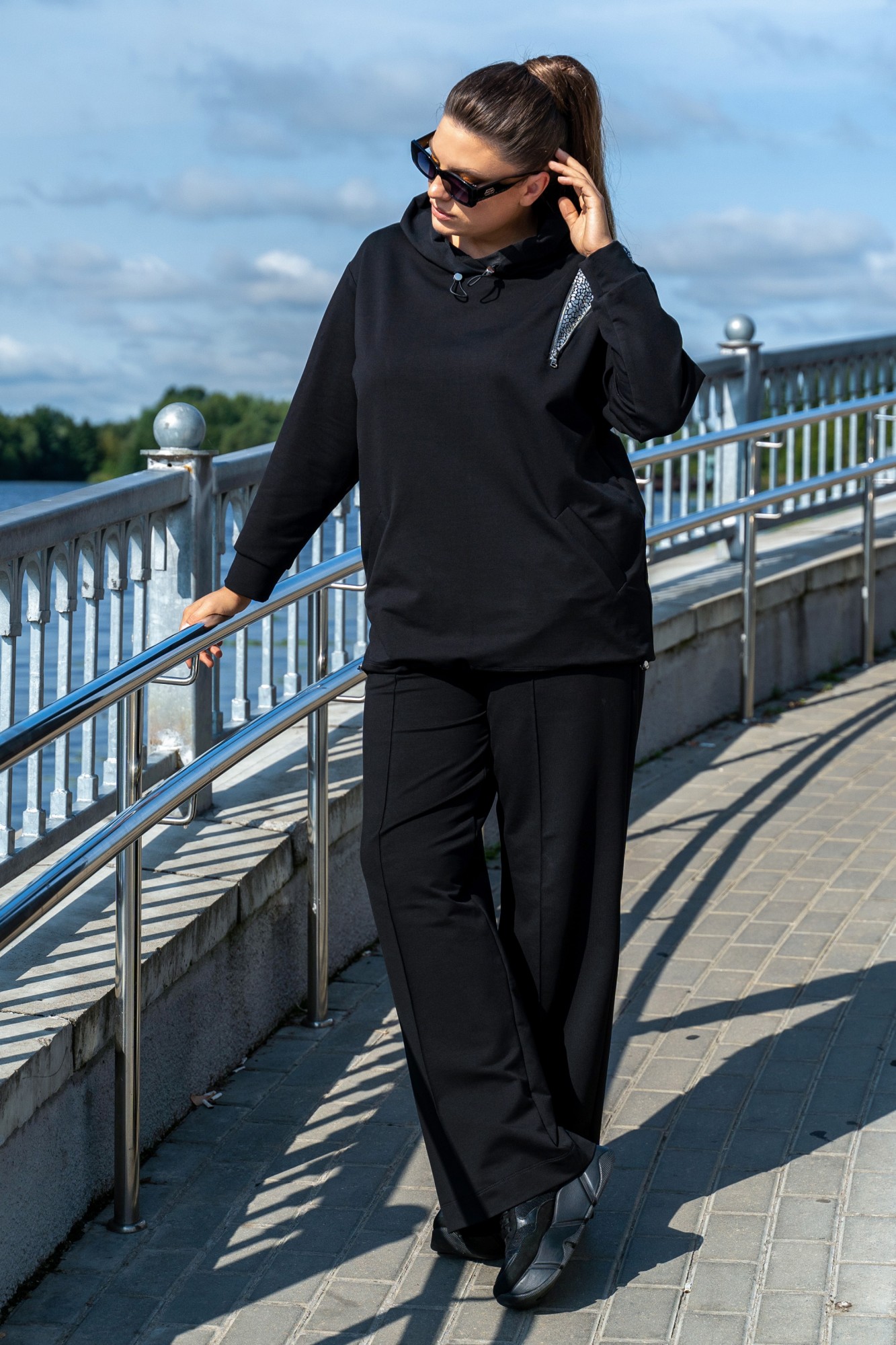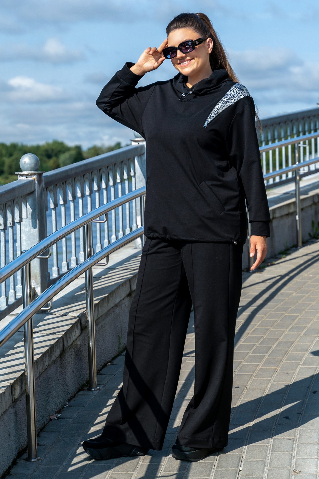 Костюм женский - спортивный, современный, в стиле спорт-шик, джемпер со вставками " под змею серебро". Джемпер с с большим капюшоном с протяжками и металлическими наконечниками, с прорезными карманами с листочками, с втачными рукавами с притачными манжетами, по низу джемпера сс протяжками и металлическими наконечниками. джемпер со вставкой с молнией по полочке и переходящая на спинку. Брюки на поясе с резинкой , в швах боковые карманы.