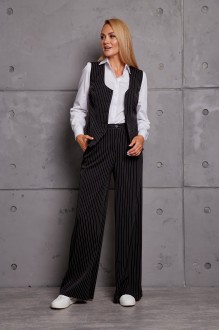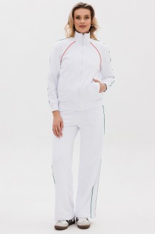 Комплект женский брючный спортивный, состоящий из джемпера и брюк. Джемпер свободного покроя со спущенной проймой и рукавом на манжете, с застёжкой спереди на молнию, с воротником, с карманами по переду изделия. На манжете по низу изделия. Брюки прямые, расширенные к низу, на поясе с эластичной тесьмой, с карманами в боковых швах.
