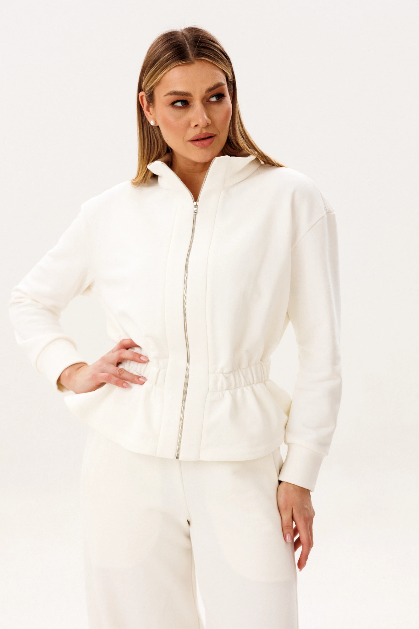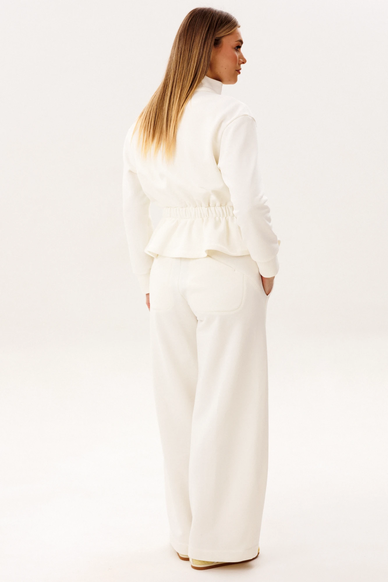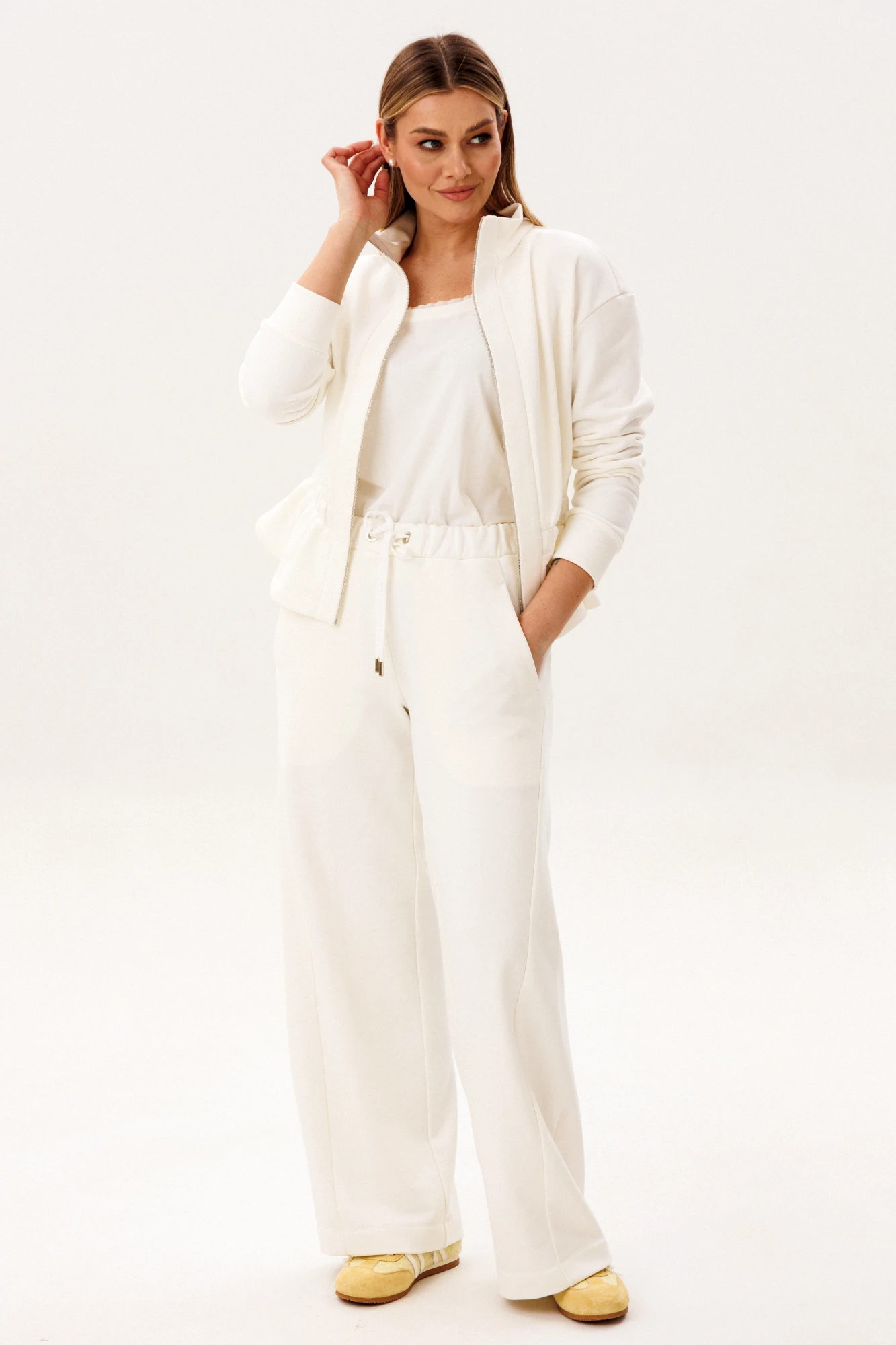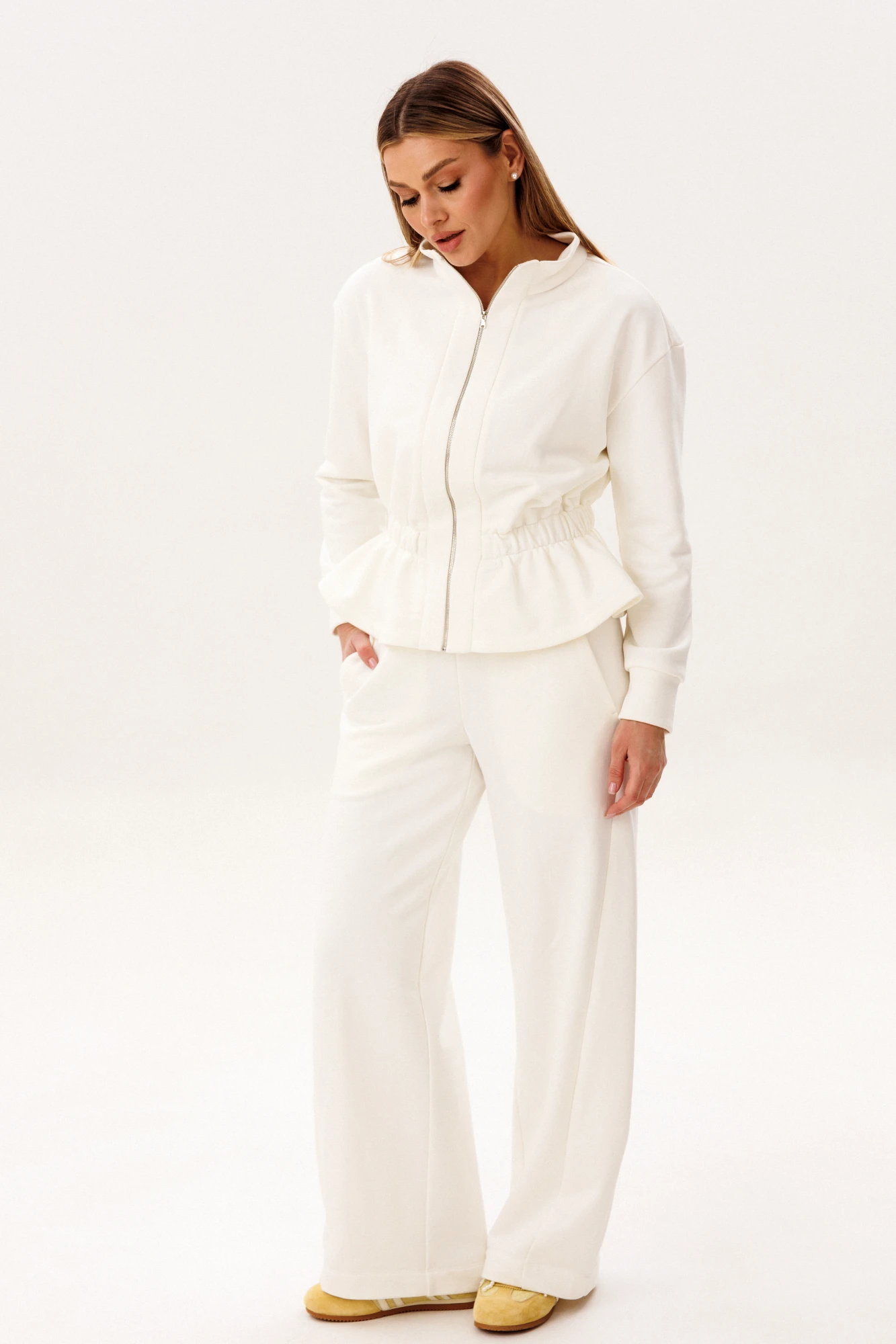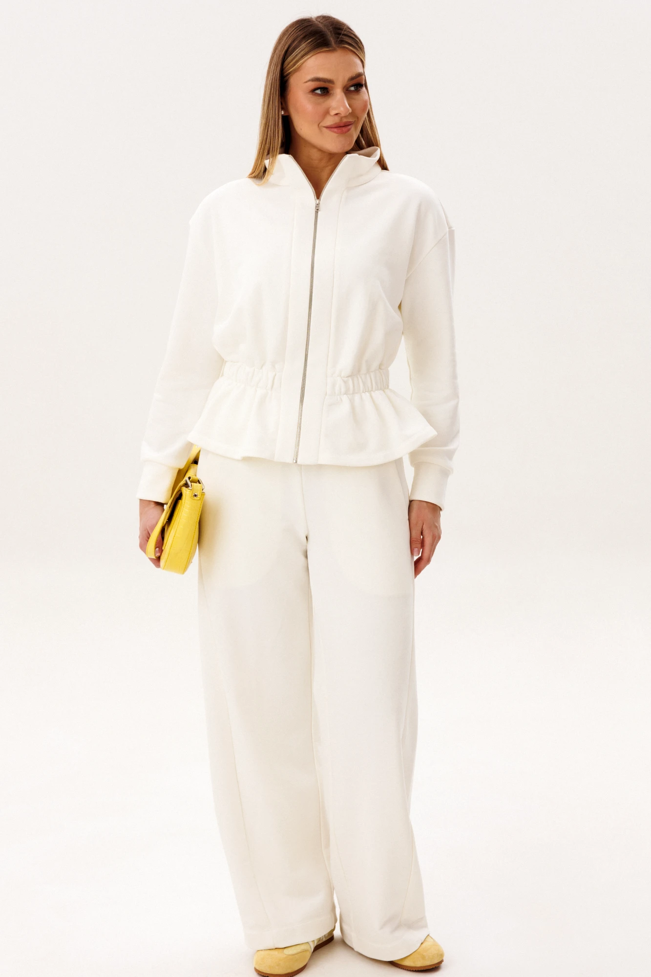 Лаконичный спортивный костюм в светлом оттенке — идеальное сочетание комфорта, минимализма и современной эстетики. Универсальный дизайн делает модель актуальной как для активного отдыха, так и для повседневных образов в стиле casual. В комплект входит: Куртка на молнии с воротником-стойкой и эластичной линией талии. Брюки прямого кроя с комфортной посадкой и функциональными карманами. Костюм выполнен из качественного хлопчатобумажного футера — мягкого, дышащего и приятного к телу материала. Ткань отлично сохраняет тепло, при этом обеспечивая комфорт и свободу движений в течение всего дня. Куртка подчёркивает силуэт за счёт аккуратной посадки и резинки по талии, а брюки создают вытянутый и элегантный силуэт благодаря прямому крою. Преимущества модели: натуральный хлопковый футер. мягкость и комфорт при носке. современный минималистичный дизайн. универсальность для повседневного гардероба. Костюм легко комбинируется с базовыми футболками, худи и спортивной обувью, позволяя создавать стильные и удобные образы на каждый день. Идеальный выбор для тех, кто ценит комфорт, качество и актуальный стиль.