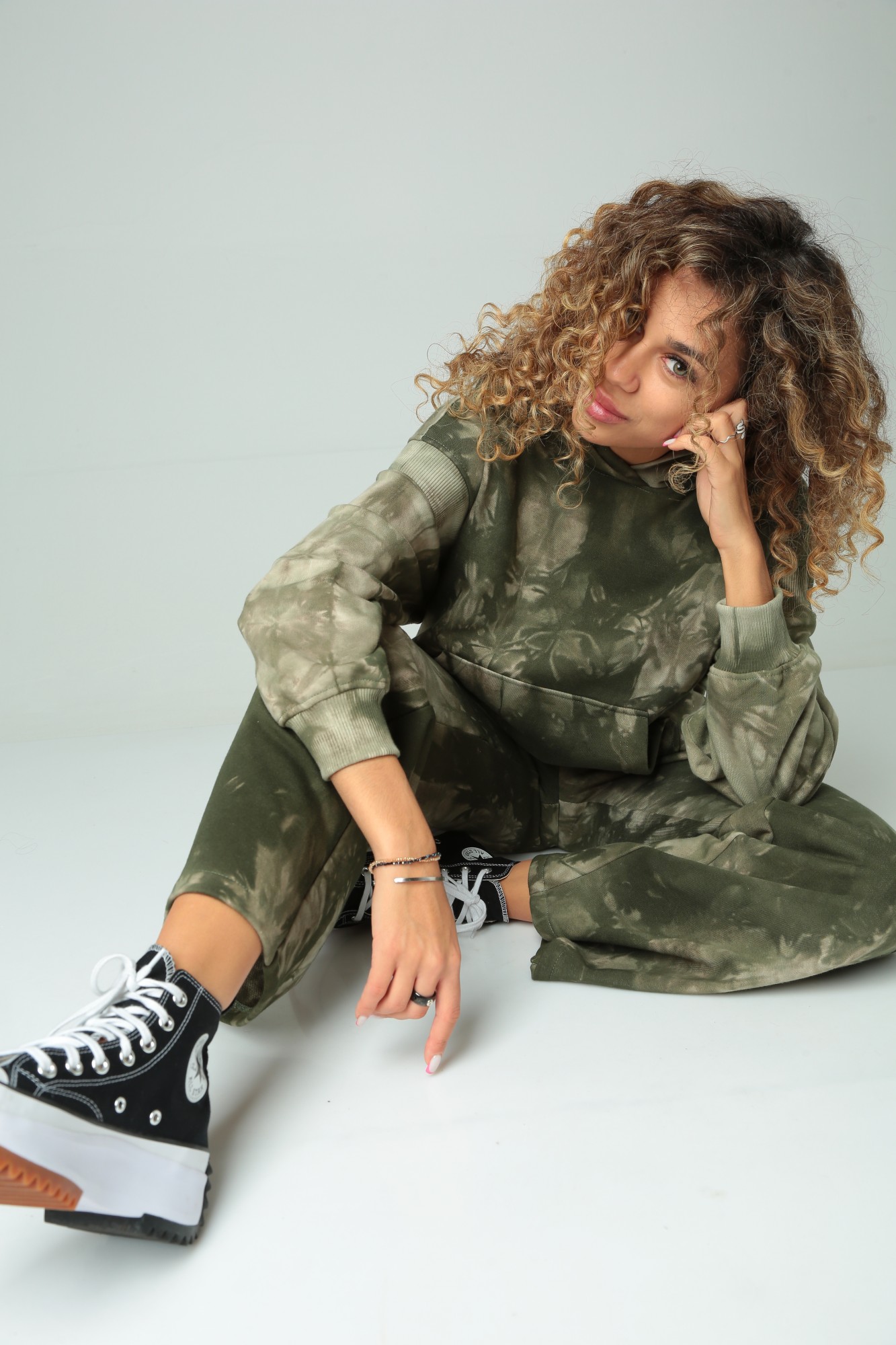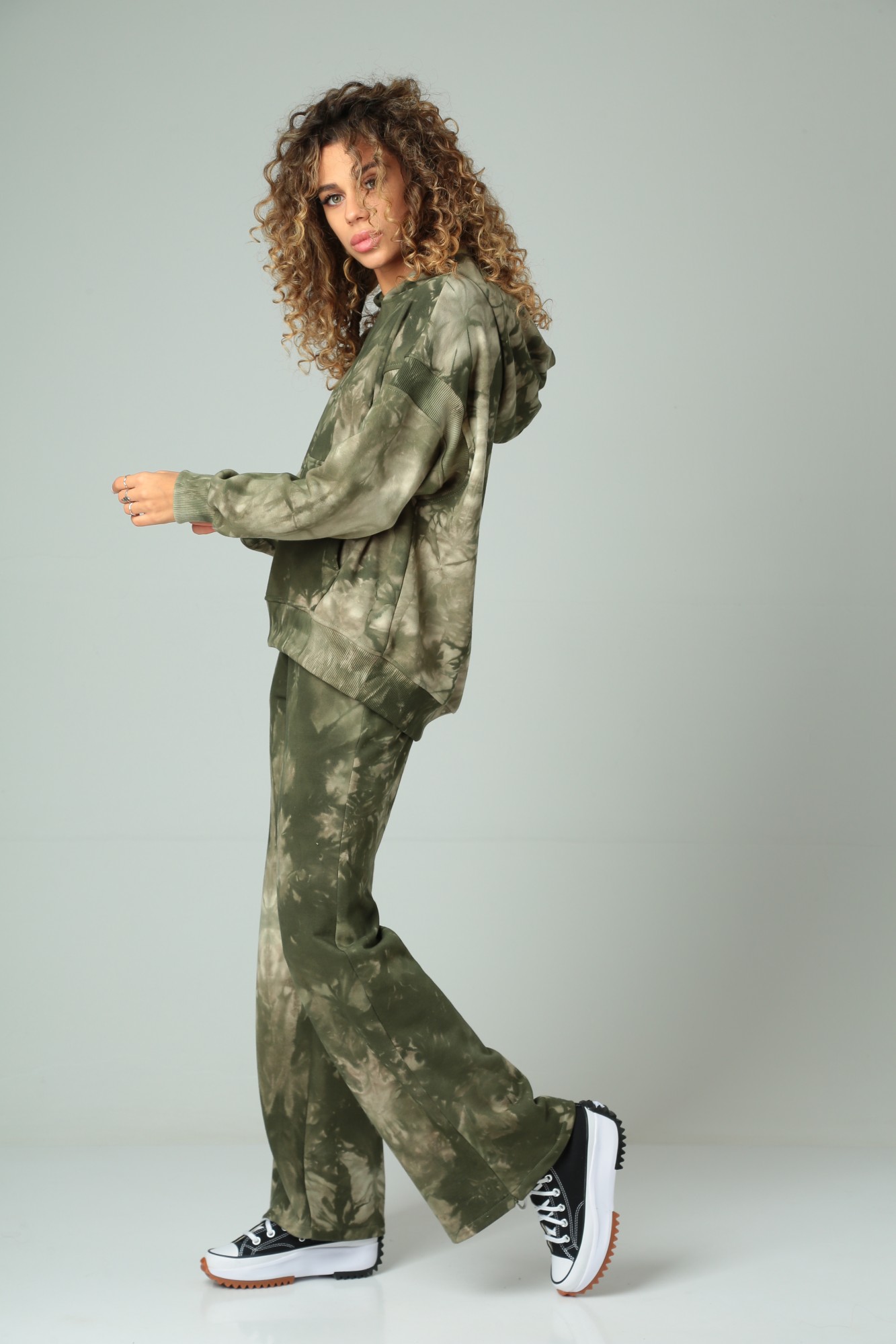 Женский костюм выполнен из хлопкового футера 3ех нитка. Стильное объёмное худи, удлиненное сзади, с капюшоном, имеет приспущенный рукав и украшен декоративной вставкой из кашкорсе в цвет изделия, также по переду настрочной карман-кенгуру. Манжеты на трикотажном довязе-кашкорсе в цвет изделия. Брюки клешеные высокой посадки с боковыми карманами, пояс на резинке, по низу брючины сбоку вставлена потайная молния для того, чтобы регулировать высоту разреза. Оба изделия отличаются своей функциональностью и их можно с легкостью комбинировать с различными вещами и обувью Вашего гардероба. Длина худи по спинке 64 см, длина рукава от горловины 71 см. Длина брюк по боковому шву 108 (+-1 см), по шаговому 81. Рост модели на фото 171 см.