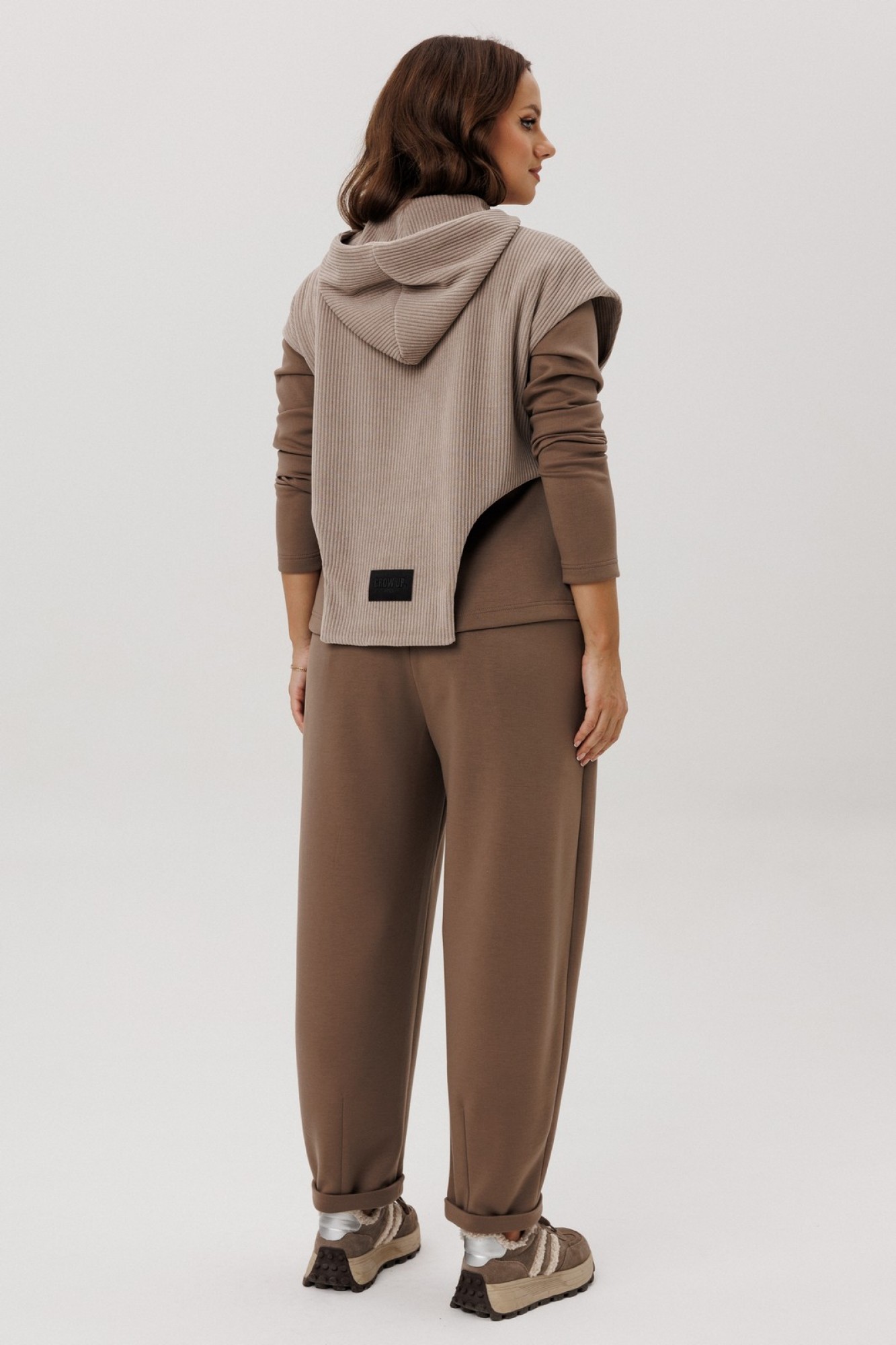 Жилет свободного силуэта с ассиметричным кроем по низу. Изделие без рукавов, с капюшоном. Застежка на тесьму-молнию по переду.
