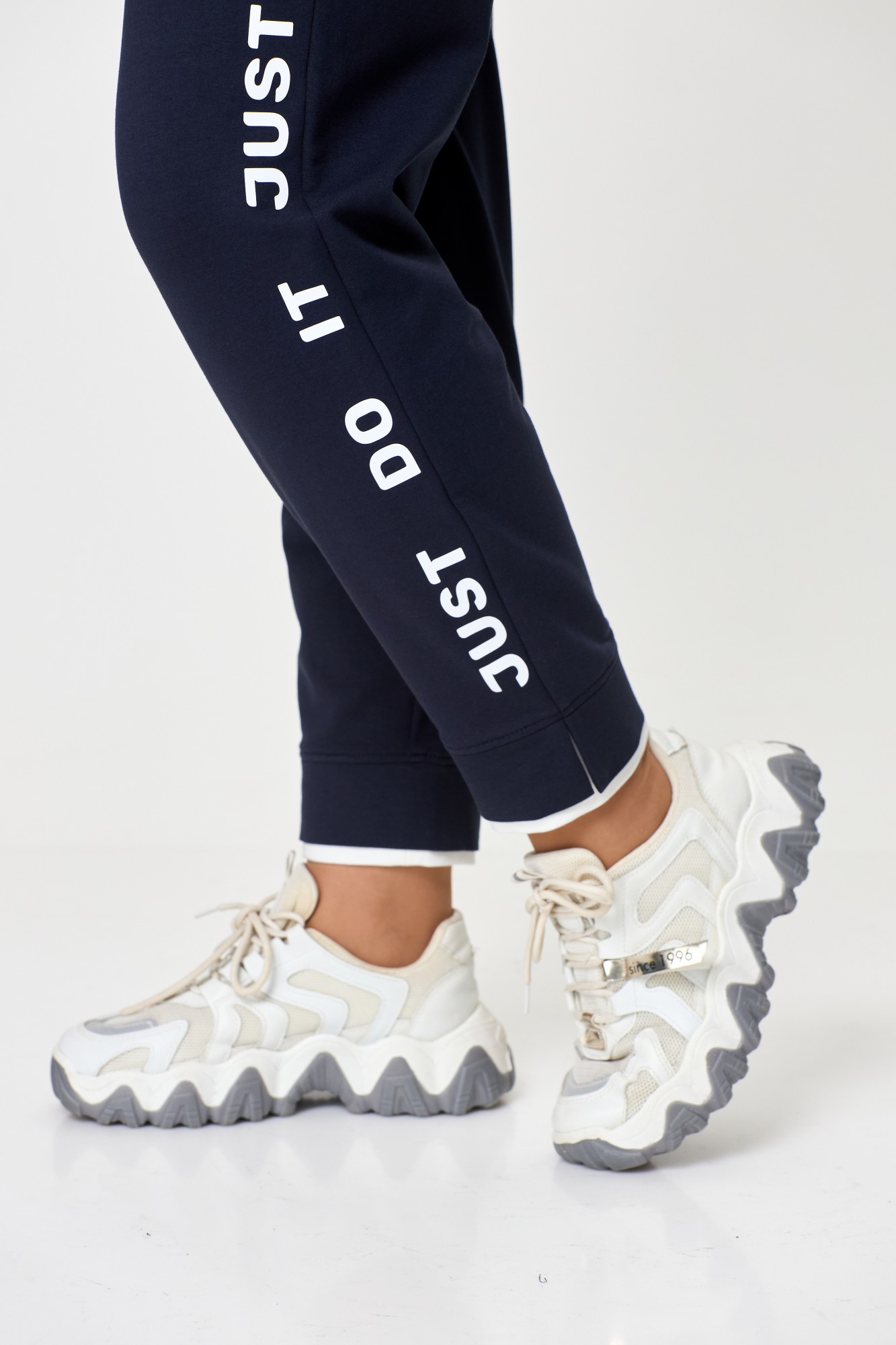 Брюки зауженные к низу с боковыми карманами, вдоль боковых швов, декоративная печать. По низу двойной притачной манжет, нижний манжет из отделочной ткани. Верх брюк на резинке.