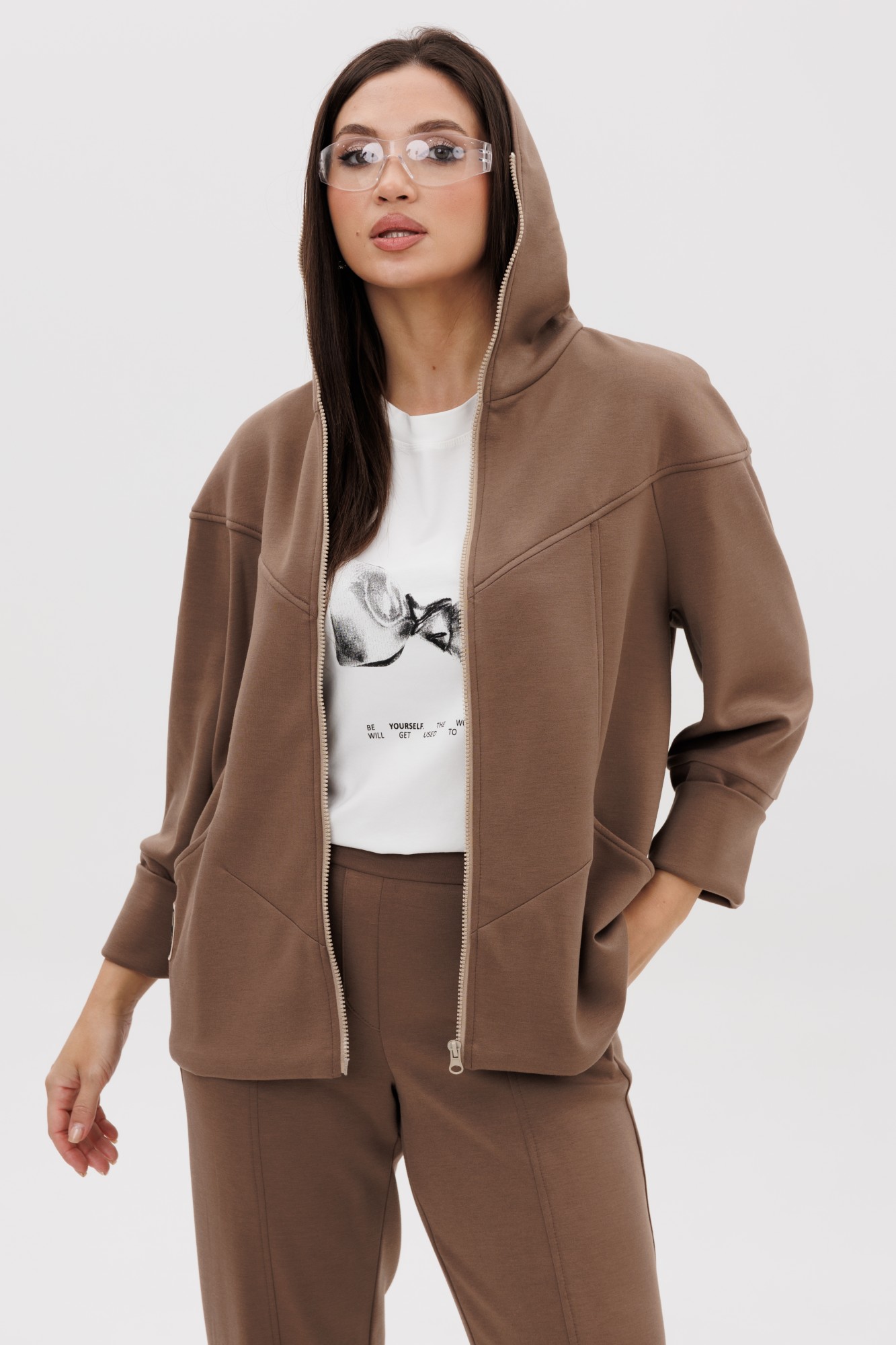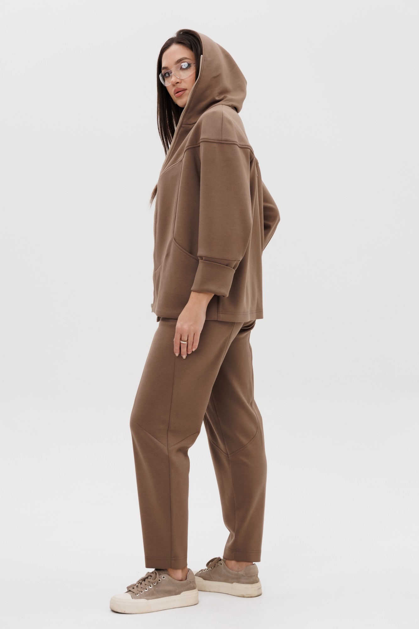 Костюм, где главный акцент-индивидуальность в сочетании со спортивными элементами и экологичными материалами, это модель, где главное удобство и естественность. Он подходит абсолютно всем, не ограничивает в выборе и позволяет чувствовать себя комфортно в любой ситуации. Свободный силуэт, комбинированный покрой, центральная застежка на тесьму-молнию, капюшон рукав-частичный реглан с отрезной широкой манжетой и мягкой складкой в области локтя. Полочка с отрезной кокеткой и фигурным рельефом, переходящим в карман. Спинка с отрезной кокеткой. Брюки свободные, на эластичном поясе в области спинки, с фигурными вертикальными рельефами по центру передних и задних половинок, вытачками в области колена и боковым наклонным карманом.