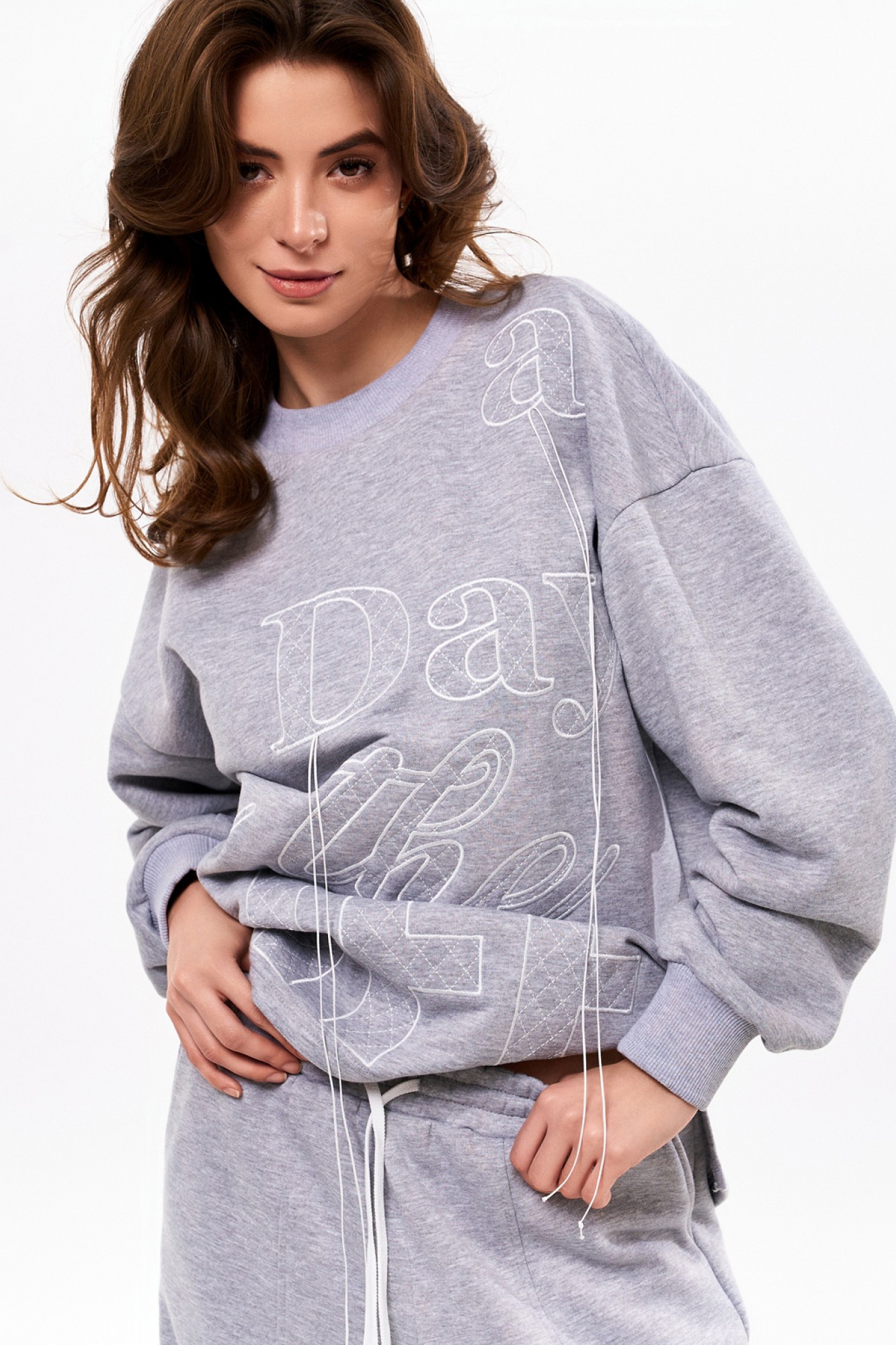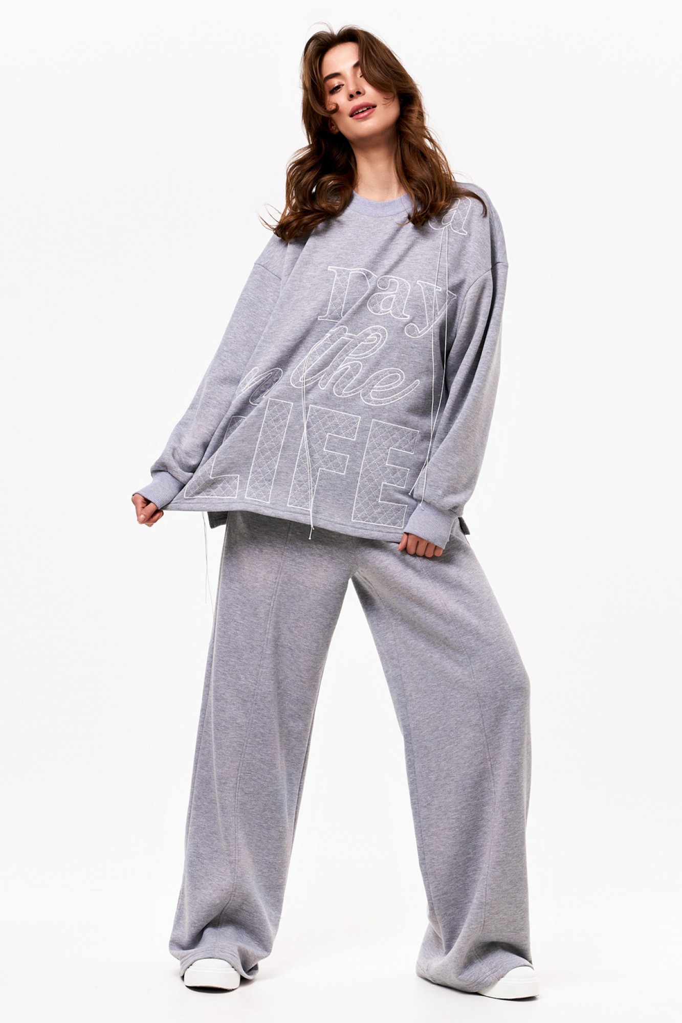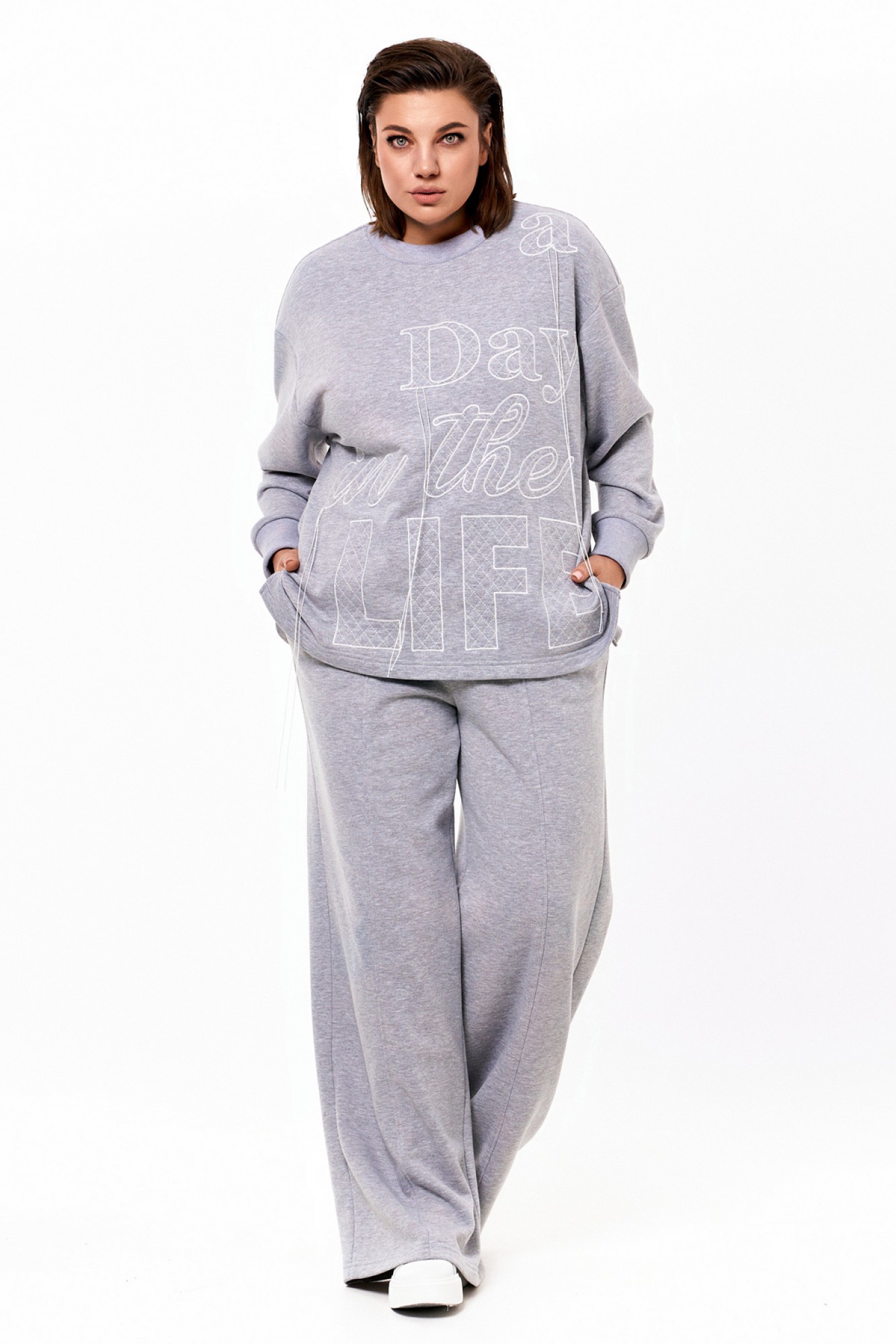 Объёмный джемпер из футера 3-х нитки с довязами на манжетах и по горловине. По переду контрастная вышивка. Брюки из футера 3-х нитки прямые от бедра. На резинке по талии и с контрастным шнуром. По переду отстроченные защипы.