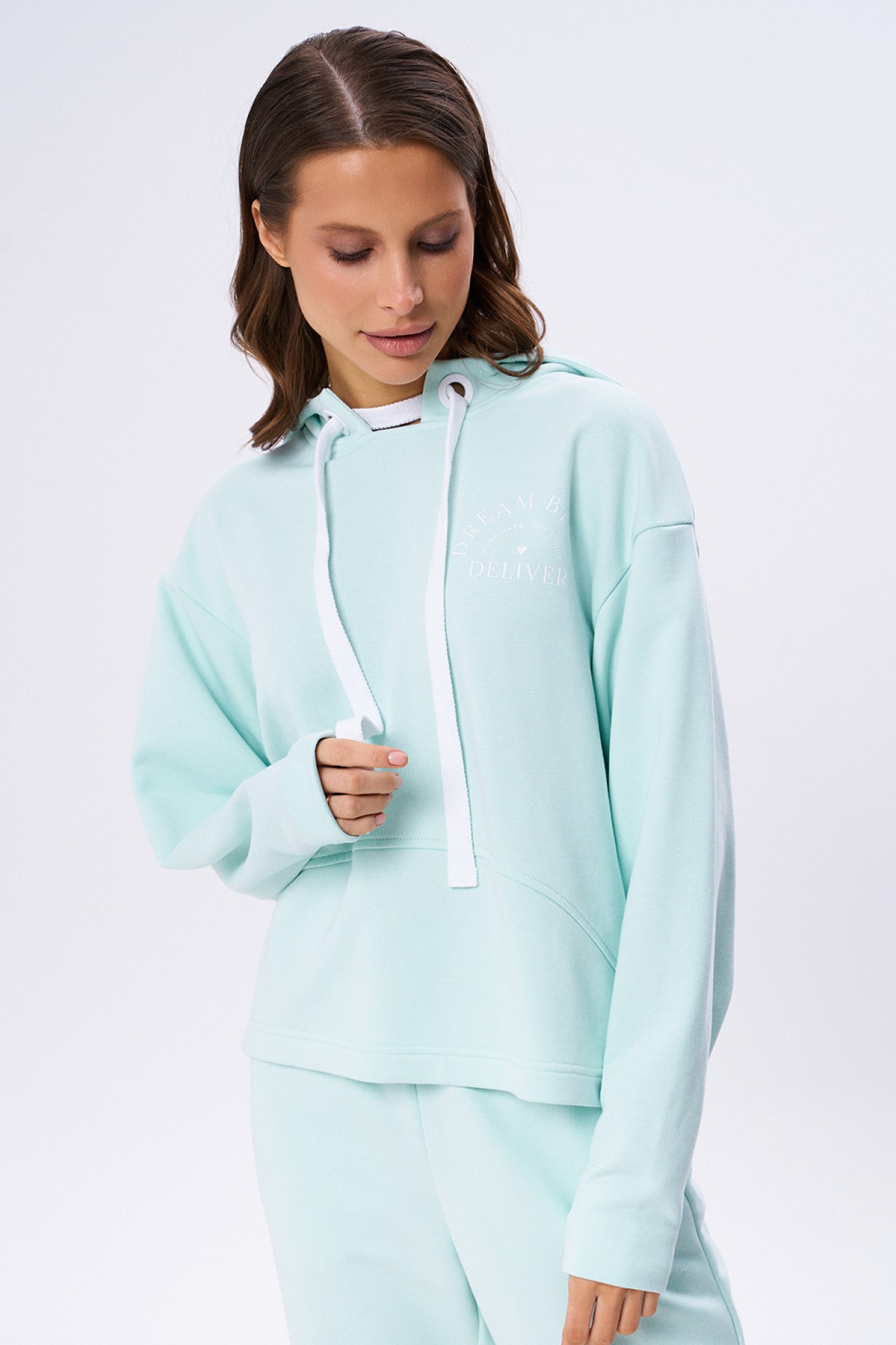 Комплект из футера 3-х нитки, состоящий из джемпера и брюк. Объёмный джемпер с капюшоном с декоративными, крупными люверсами и шнуром. Линия плеча спущена. Рукав плавно заужается к запястью. На груди по переду контрастный принт. Брюки на резинке по поясу, слегка зауженные к низу. Карманы в боковых швах, которые слегка перенесены на перед.