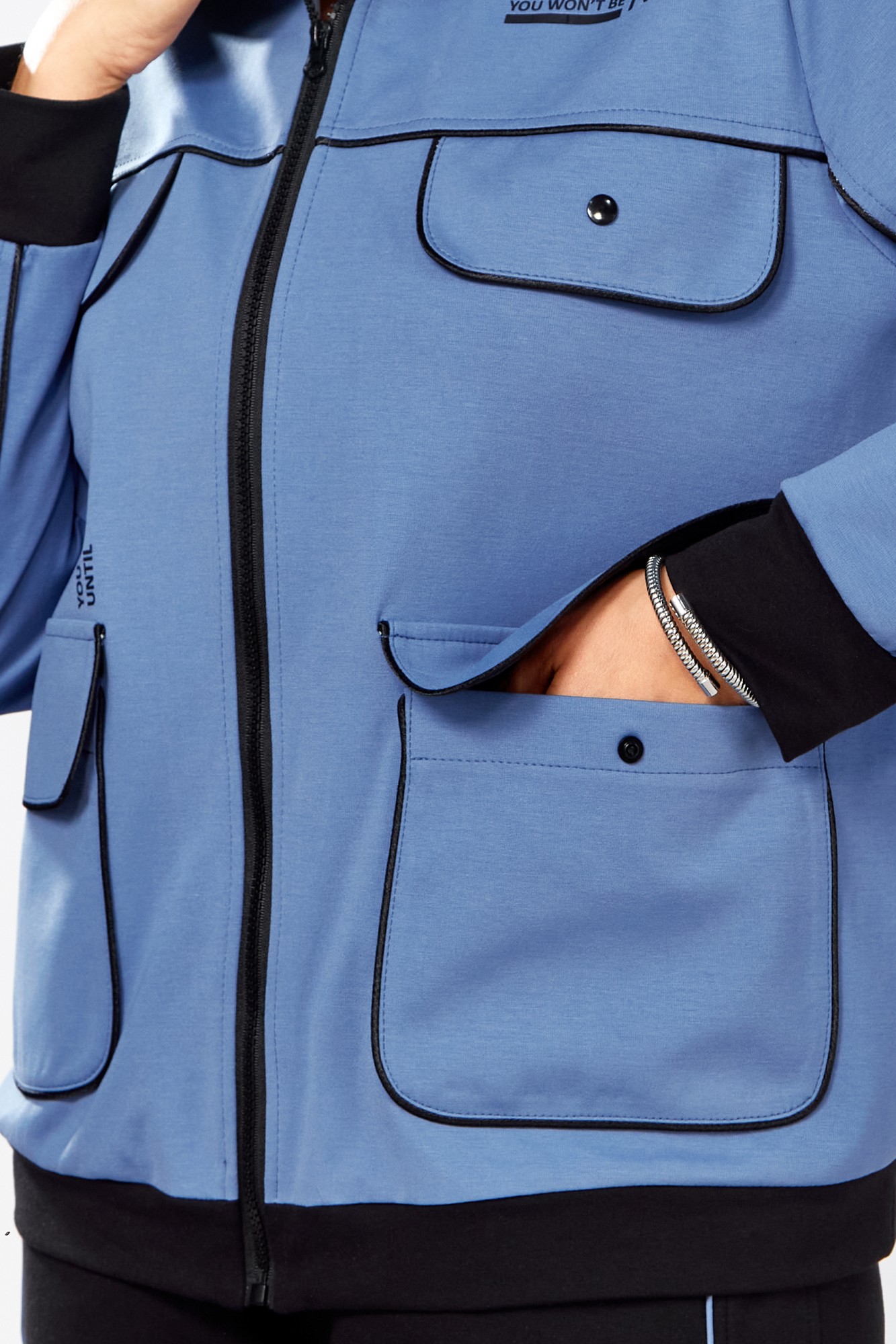 Стильный, удобный, трикотажный, спортивный костюм для активной повседневной жизни, в котором сочетаются модный дизайн и комфорт. Бомбер свободного силуэта на молнии, воротник отложная стойка. Накладные карманы, клапаны, кокетка и рукава декорированы отделаны контрастным черным кантом, в цвет брюк. Брюки на резинке с боковыми карманами и подрезами с декоративным кантом. Костюм отлично садится и скрывает недостатки фигуры из-за хорошо продуманных конструктивных линий и пропорций.