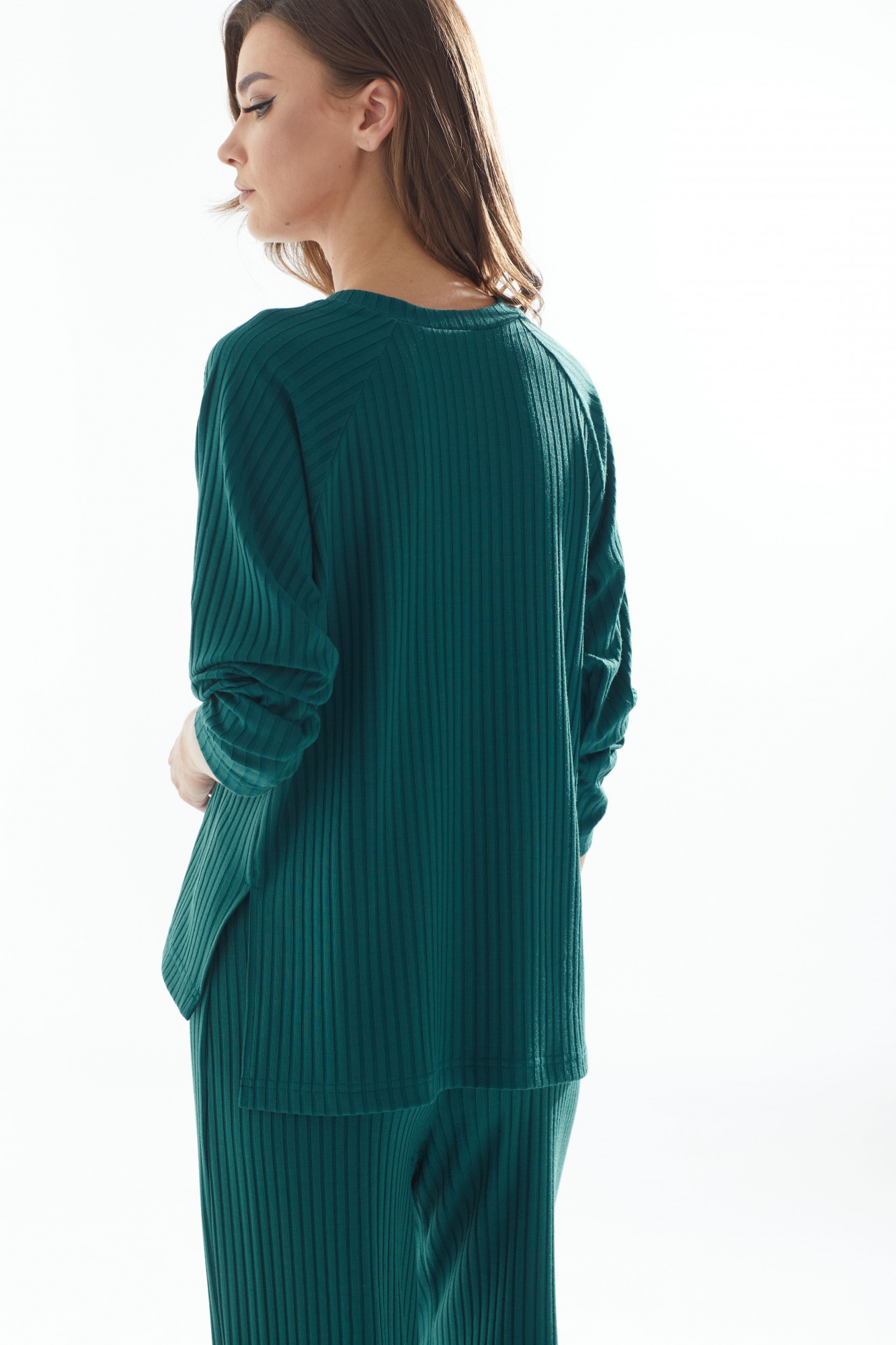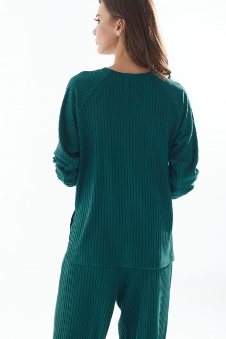 Комплект женский состоит их джемпера и брюк. Джемпер свободного силуэта из трикотажного полотна. Горловина округлая. Рукав реглан длинный. Низ переда и спинки разной длины. Трикотажные брюки прямого силуэта с высокой посадкой. По верху брюк притачной пояс на резинке.