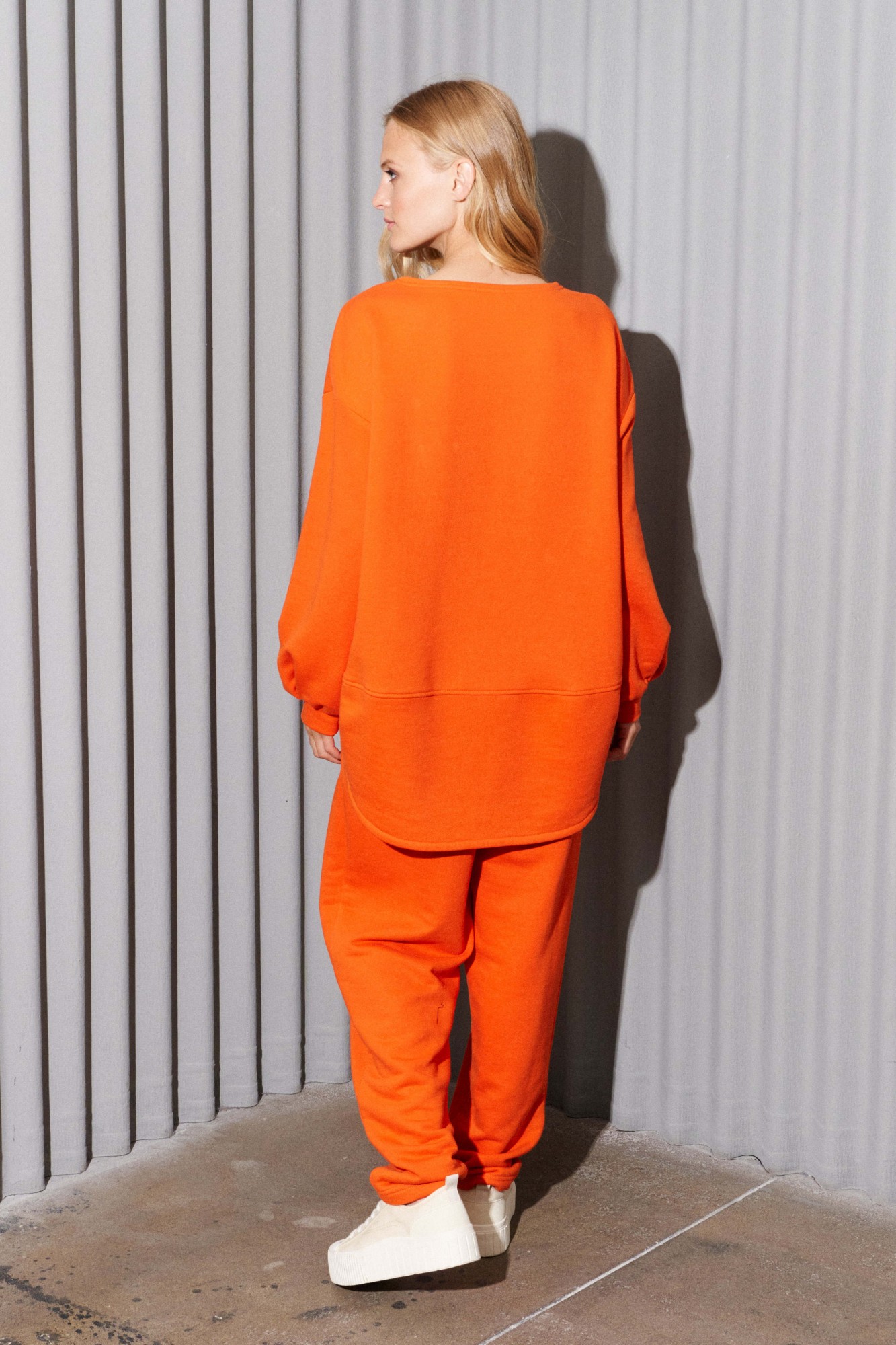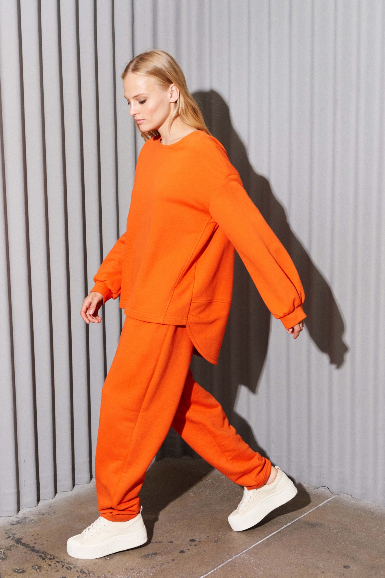 Комплект состоит из джемпера и брюк, выполнен из трикотажного полотна (футер). Джемпер свободного кроя. Рукав спущенный, по низу сборка и притачная манжета, по горловине планка, по переду косые рельефы и пришивная нашивка, ассиметричный низ. По спинке горизонтальный подрез и округлый низ. Брюки заужены к низу, на притачном поясе, резинка по задней части пояса, в боковых швах карманы.