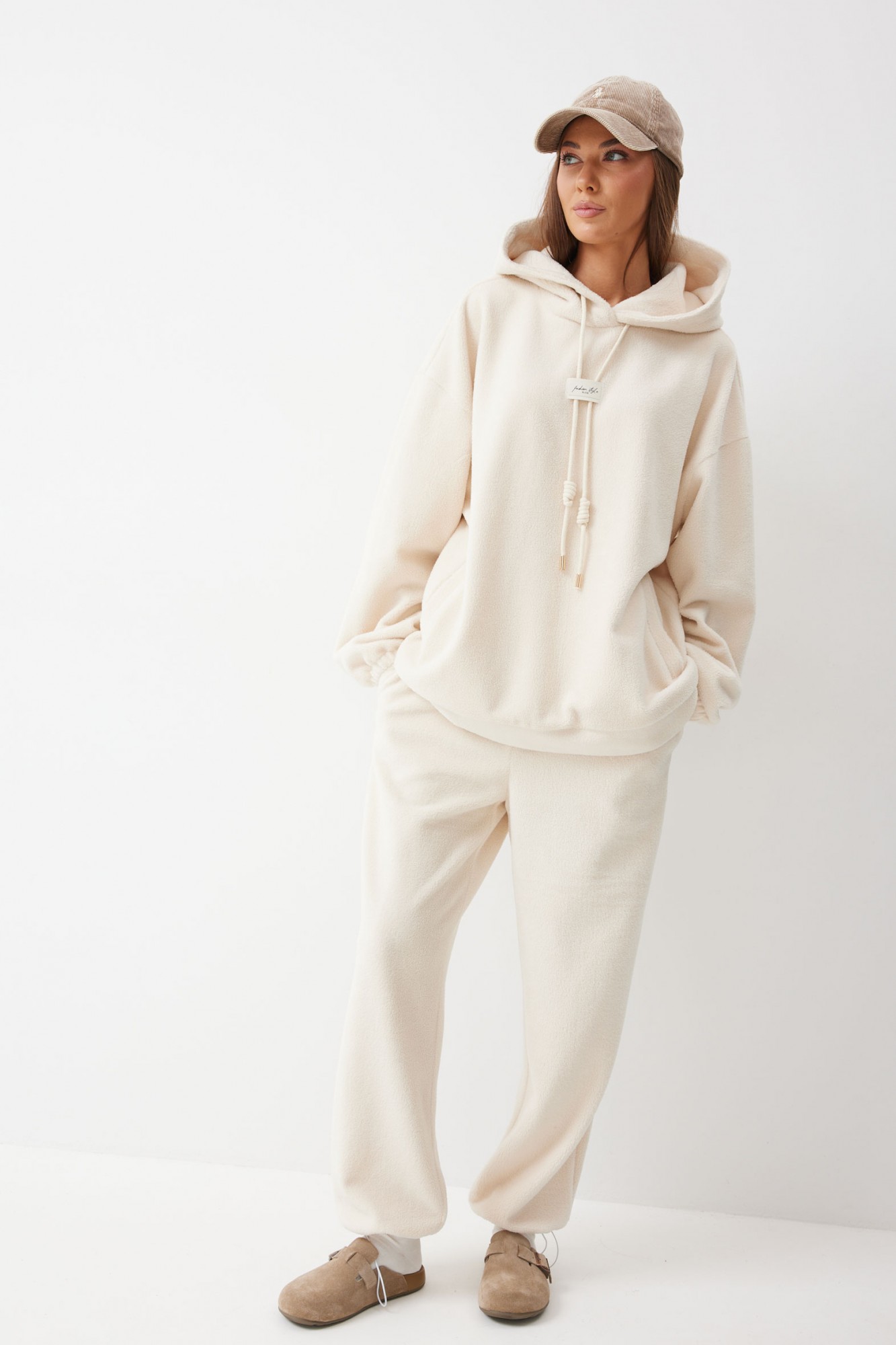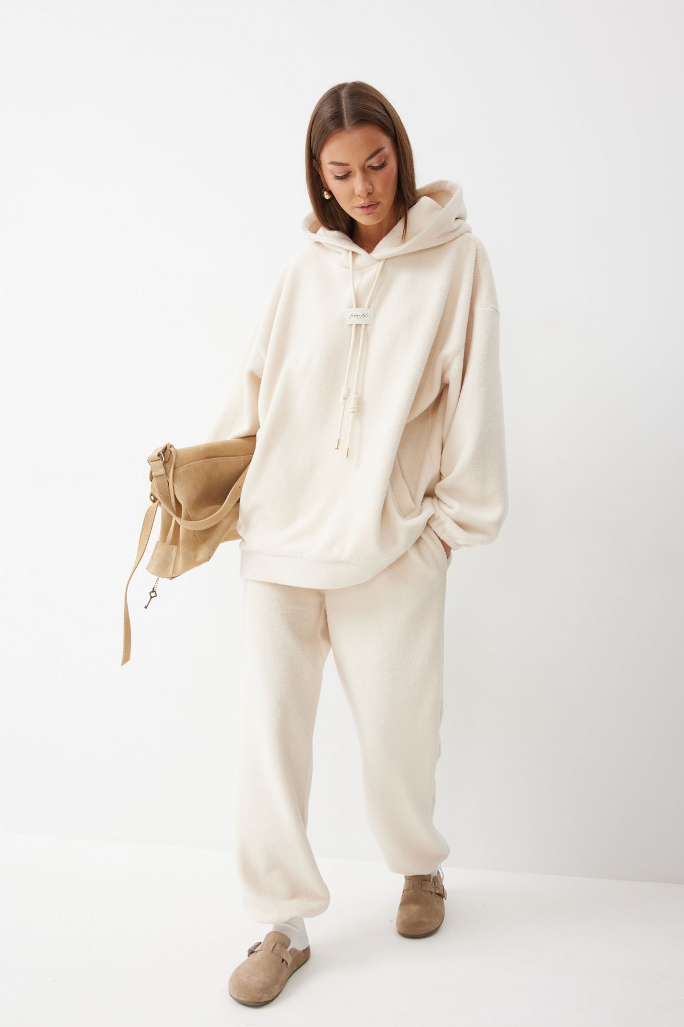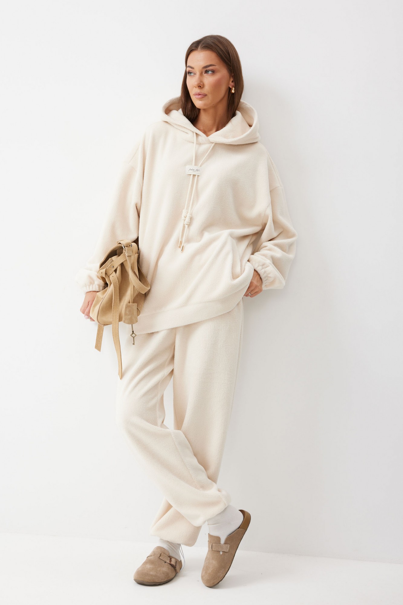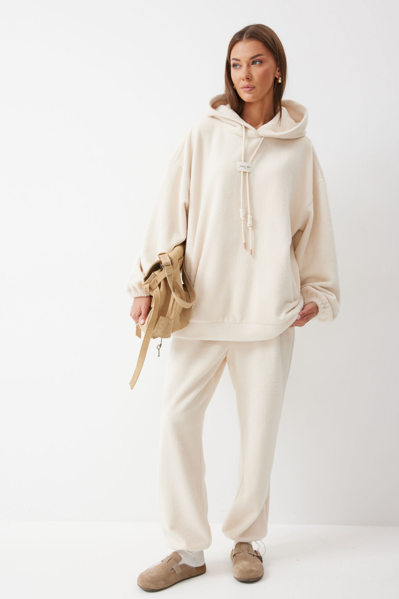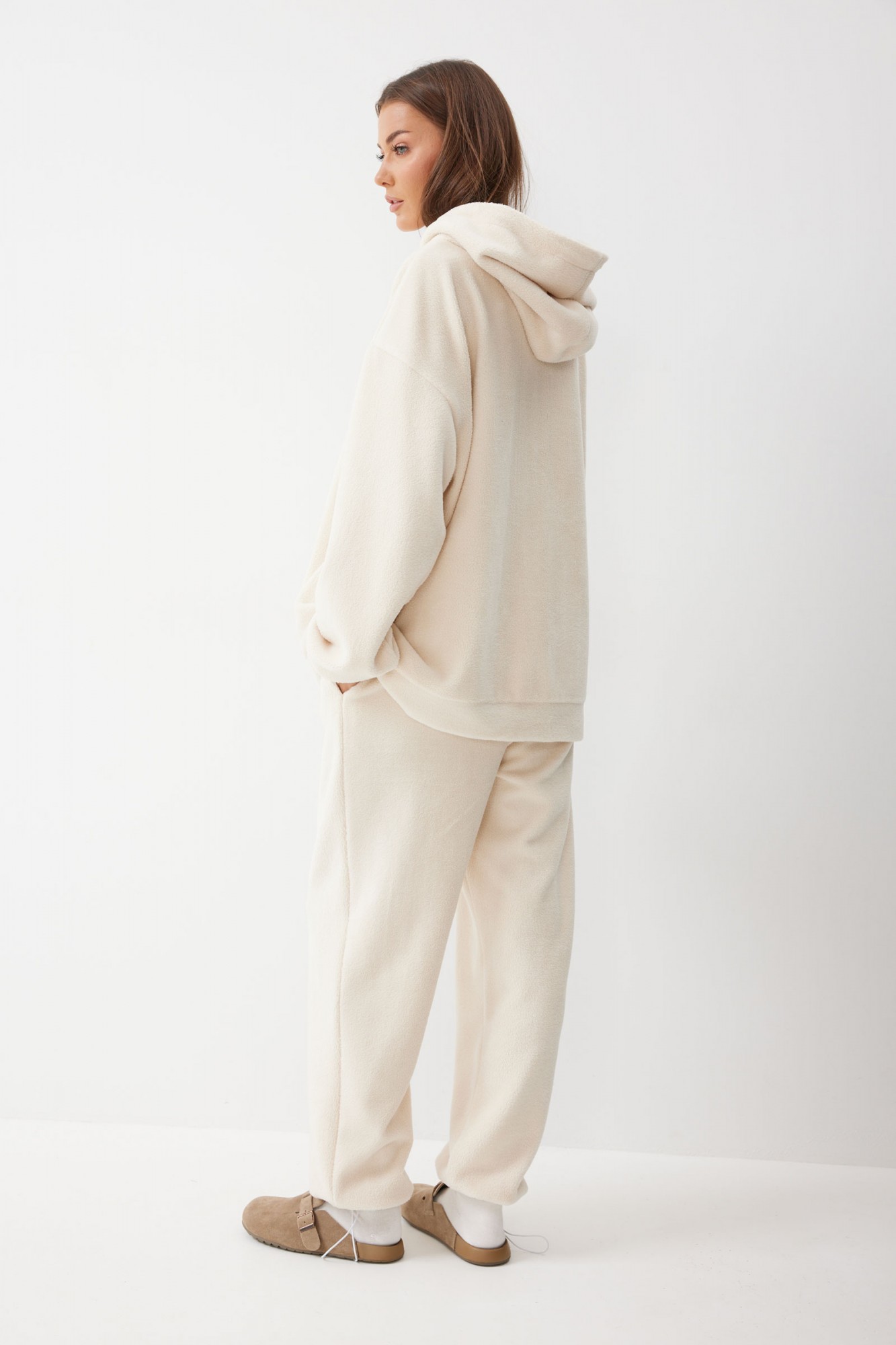 Костюм состоящий из джемпера и брюк. Джемпер прямого силуэта из комфортного трикотажного полотна. Горловина обработана капюшоном. Рукав со спущенной линией плеча, по низу на резинке. По низу джемпера притачной пояс. По переду декоративная нашивка и шнур. Брюки прямого силуэта из комфортного трикотажного полотна. По верху брюк притачной пояс на резинке. На передних половинках брюк обработаны карманы. Ширина брюк по низу регулируется за счет эластичной тесьмы и фиксаторов. Обращаем ваше внимание, что фурнитура может отличаться от фото.