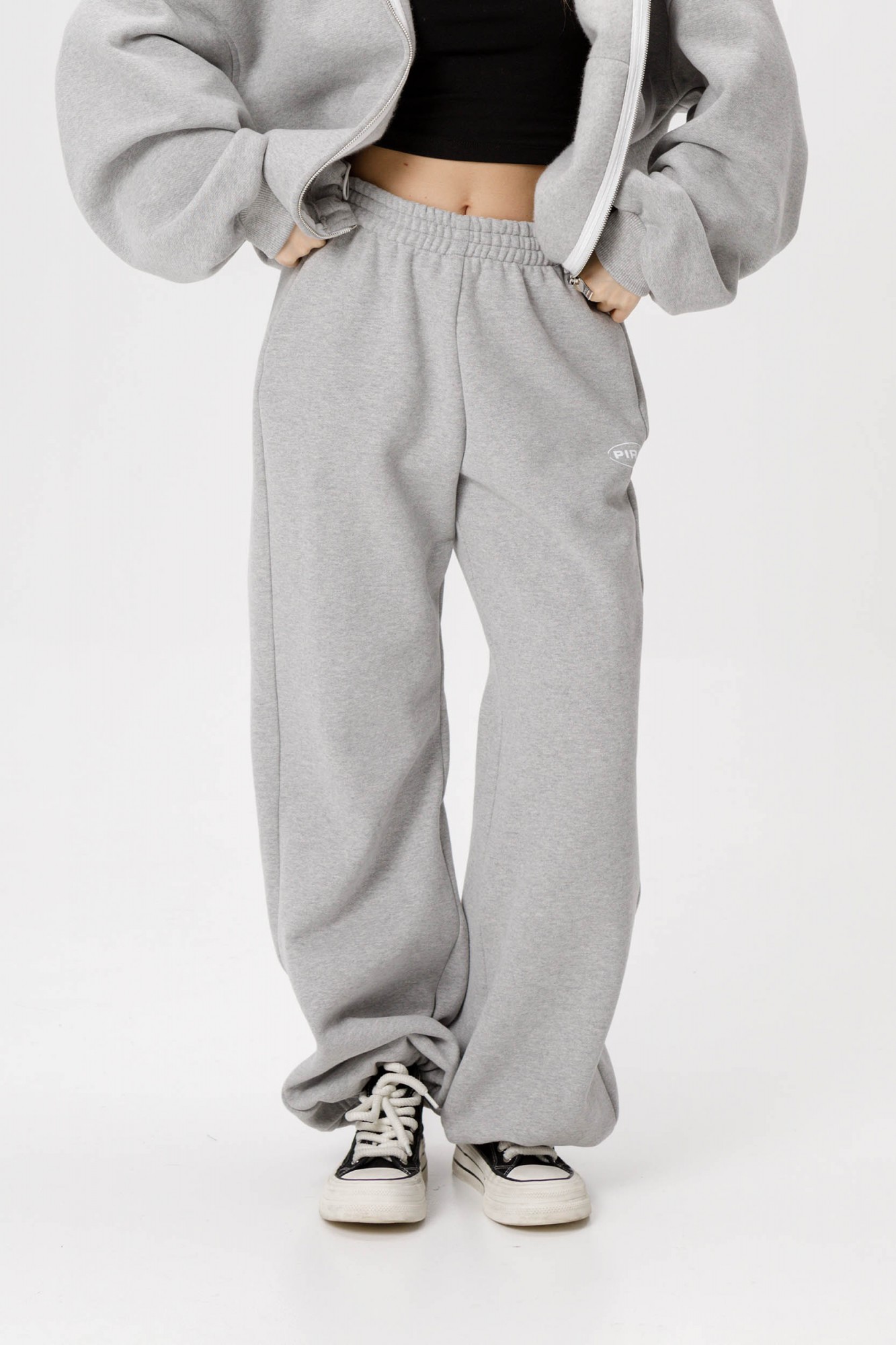 Спортивный костюм-двойка из оверсайз зип-худи и свободных брюк из трехнитки с начесом. Детали: зип-худи на молнии с большим накладным карманом по переду и регулировкой по низу. Брюки широкие с рельефными швами и регулировкой по низу, боковые карманы. Костюм с небольшим фирменным логотипом.