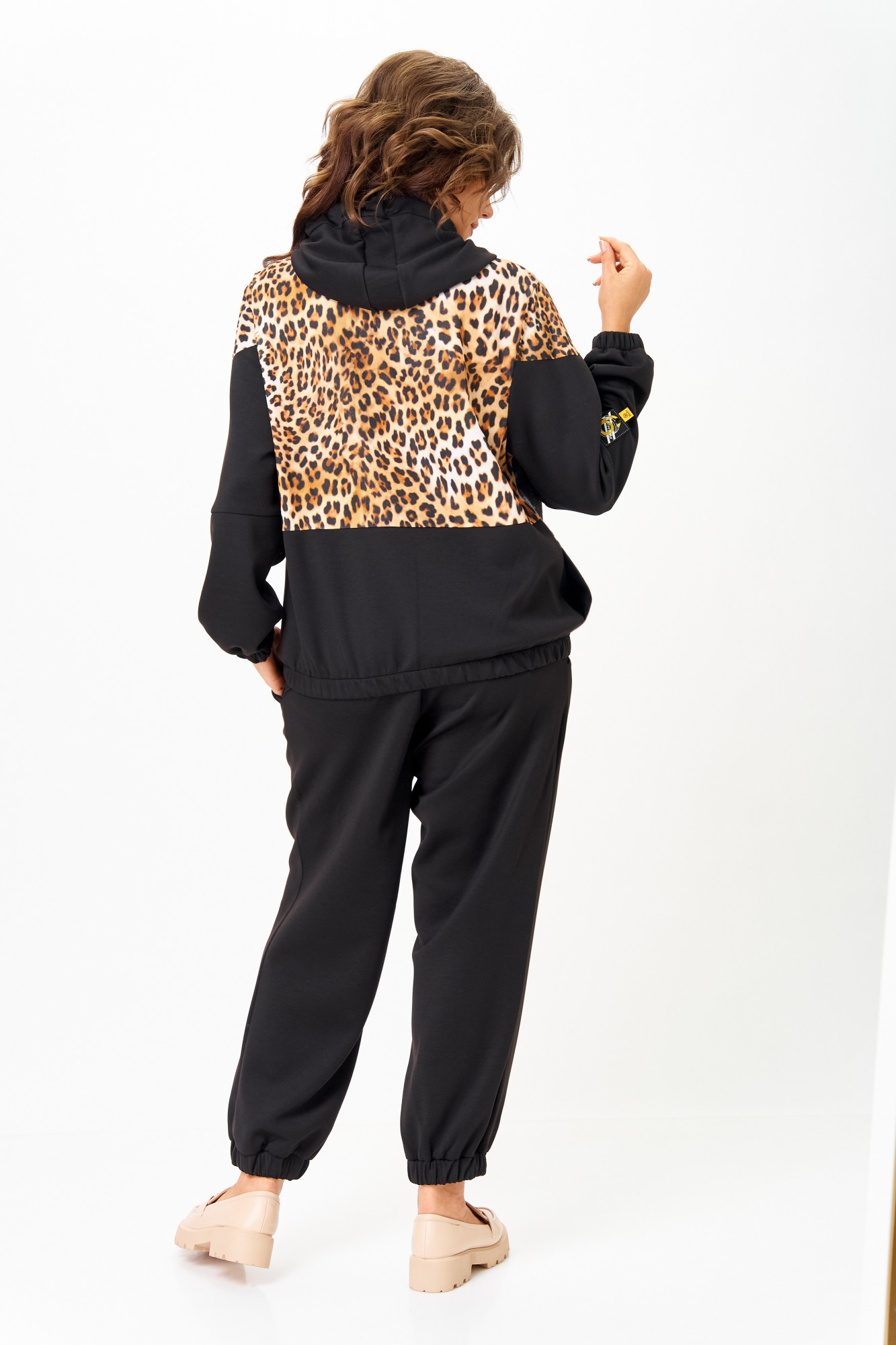 Костюм женский спортивный, состоящий из куртки и брюк. Костюм выполнен из 2-х видов ткани. Куртка с капюшоном свободного кроя на талии с прорезными карманами, застежка молния. Украшением куртки служит деталь из 3D сетки и нашивки на рукаве. Низ рукавов и низ куртки на эластичной манжете. Брюки заужены к низу, с карманами. Брюки на резинке по талии. Низ брюк на манжете с резинкой.