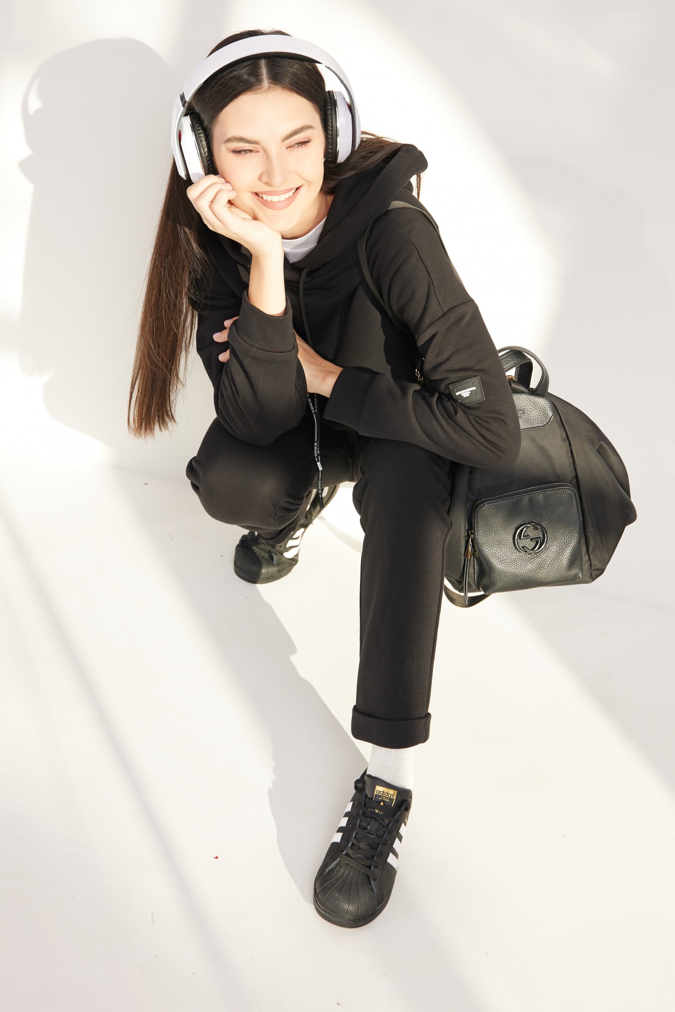 Костюм двойка включает в себя брюки с цельнокроенной манжетой и удлиненного худи с капюшоном.